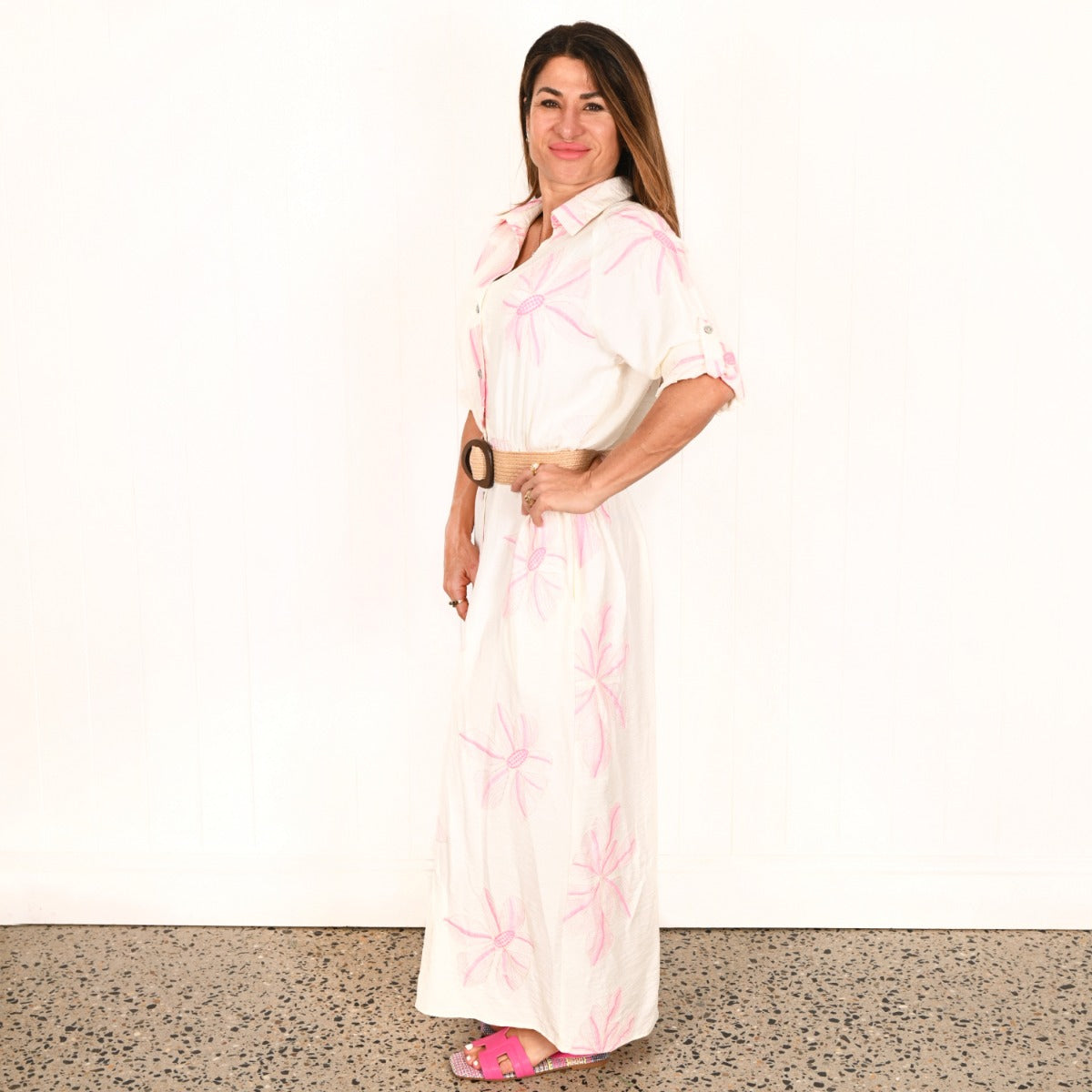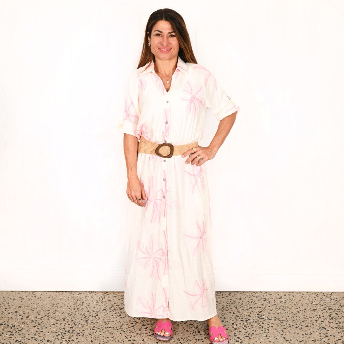 The Floral Collective Evelyn Dress combines timeless elegance with contemporary design. This maxi-length piece showcases an exquisite embroidered pink flower pattern that adds visual depth and sophistication to your wardrobe. The dress is thoughtfully designed with a flattering silhouette, enhanced by the included woven belt that cinches at the waist to create definition and accentuate your natural curves. The intricate floral embroidery demonstrates quality craftsmanship, while the maxi length offers versatility for both casual and formal occasions. Perfect for those seeking a statement piece that balances feminine charm with refined style, this dress transitions effortlessly from day to evening wear. The woven belt detail provides styling flexibility, allowing you to adjust the fit to your preference and create multiple looks from a single garment.