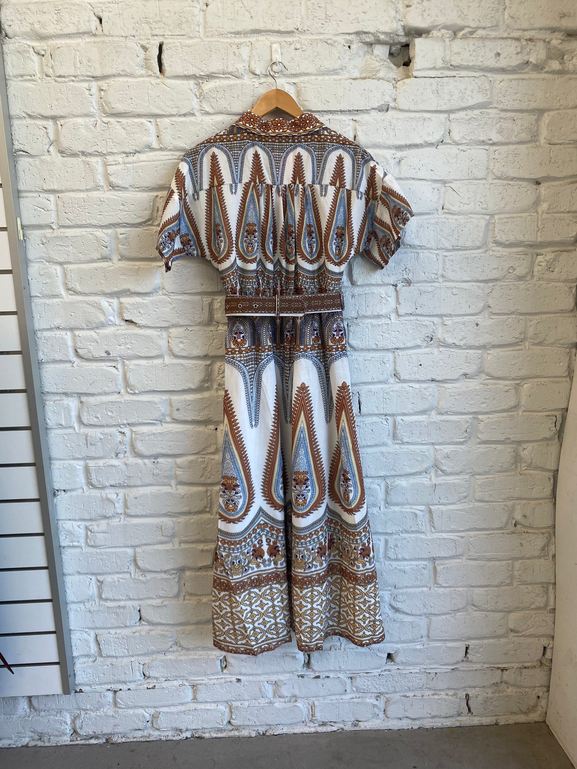 The Amalfi Penelope dress is your new go-to for effortlessly chic days. Featuring a stunning paisley pattern in soft, natural tones, this dress captures a whimsical, playful spirit. Its classic collar and delicate shell buttons add a touch of vintage charm, while the matching belt cinches your waist for a flattering silhouette. Whether you’re dressing up for brunch or strolling through town, this dress combines comfort with style to brighten your wardrobe and your day. Embrace the playful elegance of Amalfi Penelope and turn heads wherever you go.