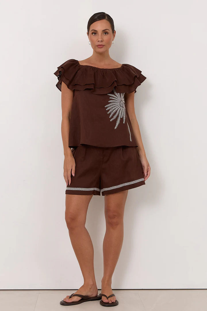 The Serena Linen Frill Top in Chocolate features an elasticised neckline with layered frill detailing and contrast embroidered palm motifs. This style can be worn off the shoulder, on the shoulder or as a one-shoulder style. Crafted from 100% linen.