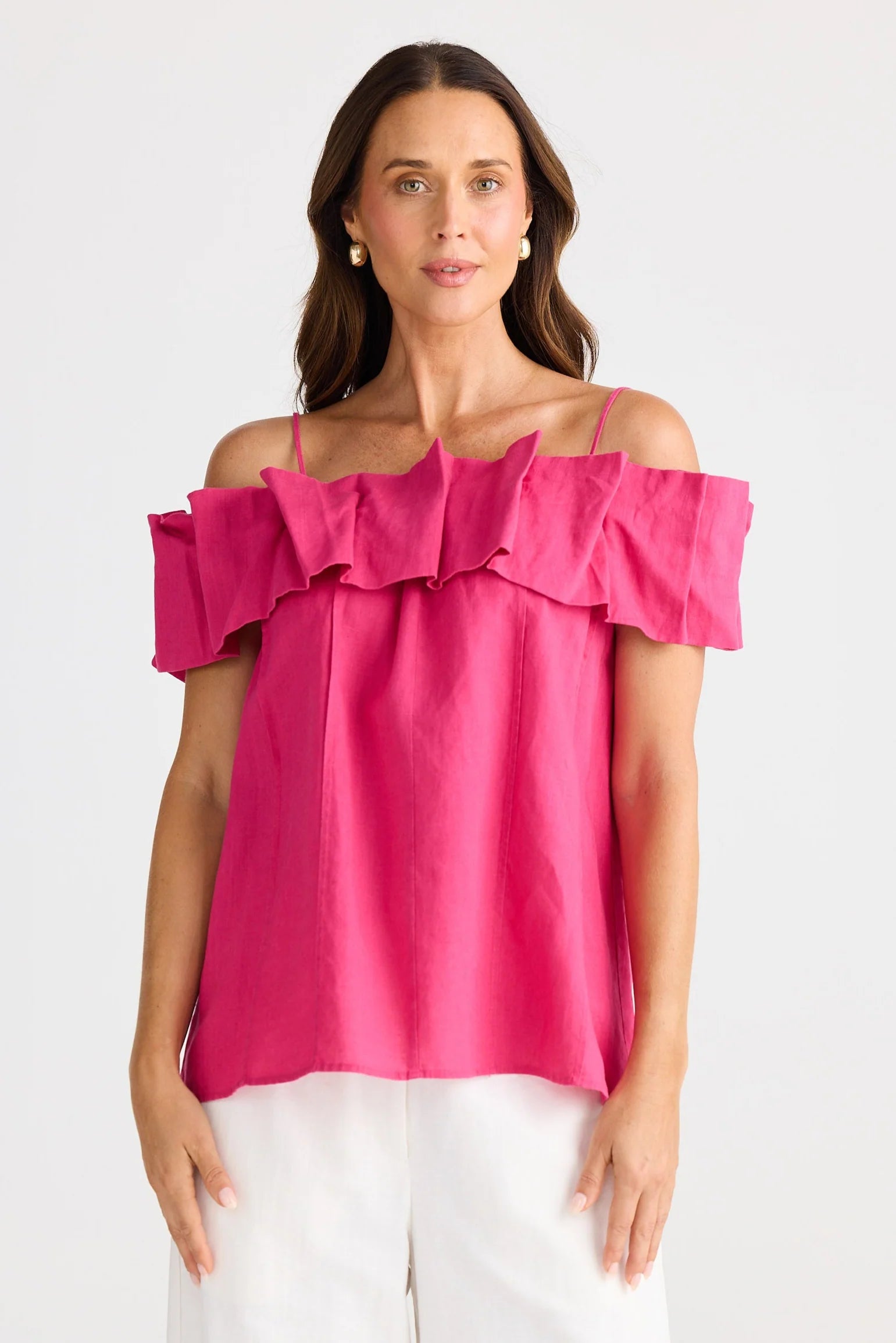 This off-shoulder top features a fun elasticated ruffle overlay with adjustable straps and a straight neckline, offering a relaxed and easygoing fit perfect for carefree days.