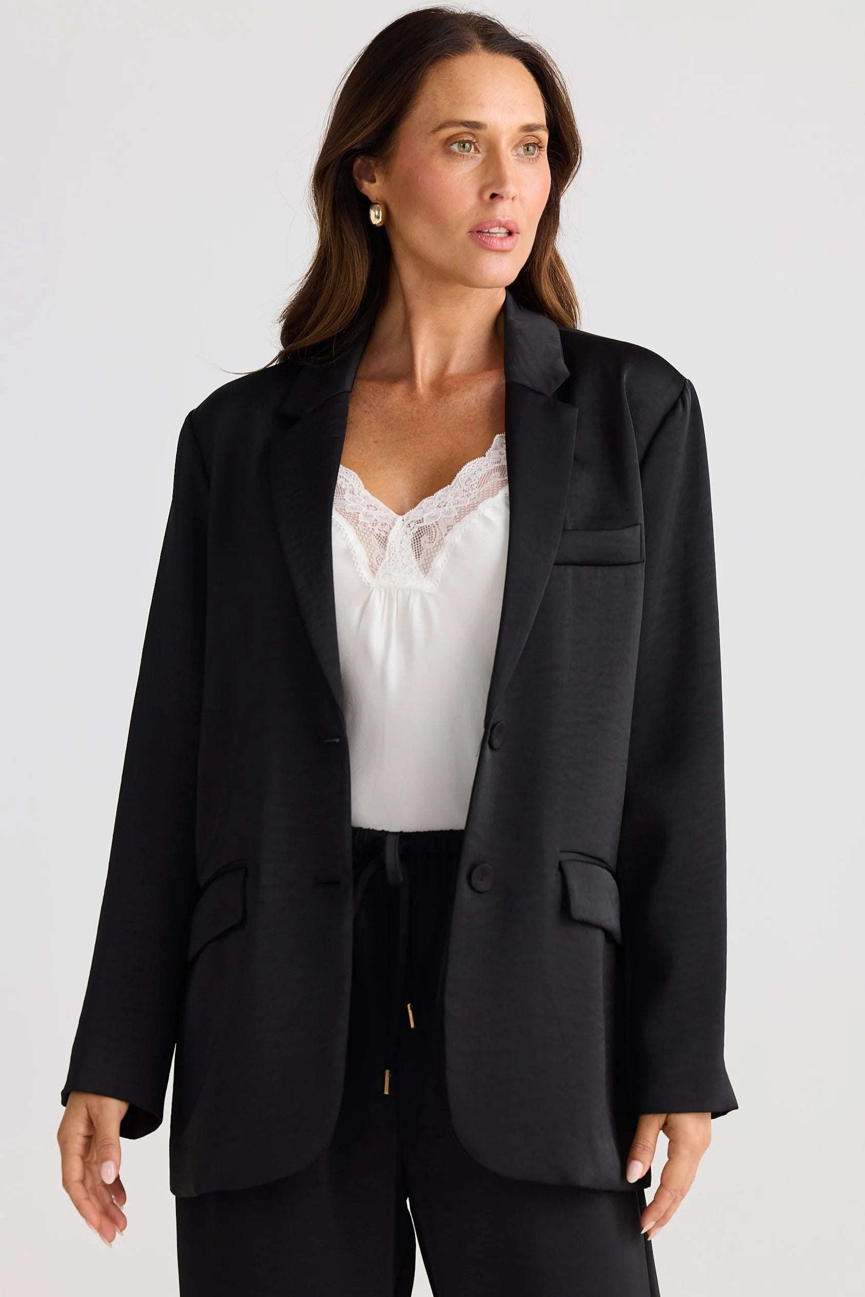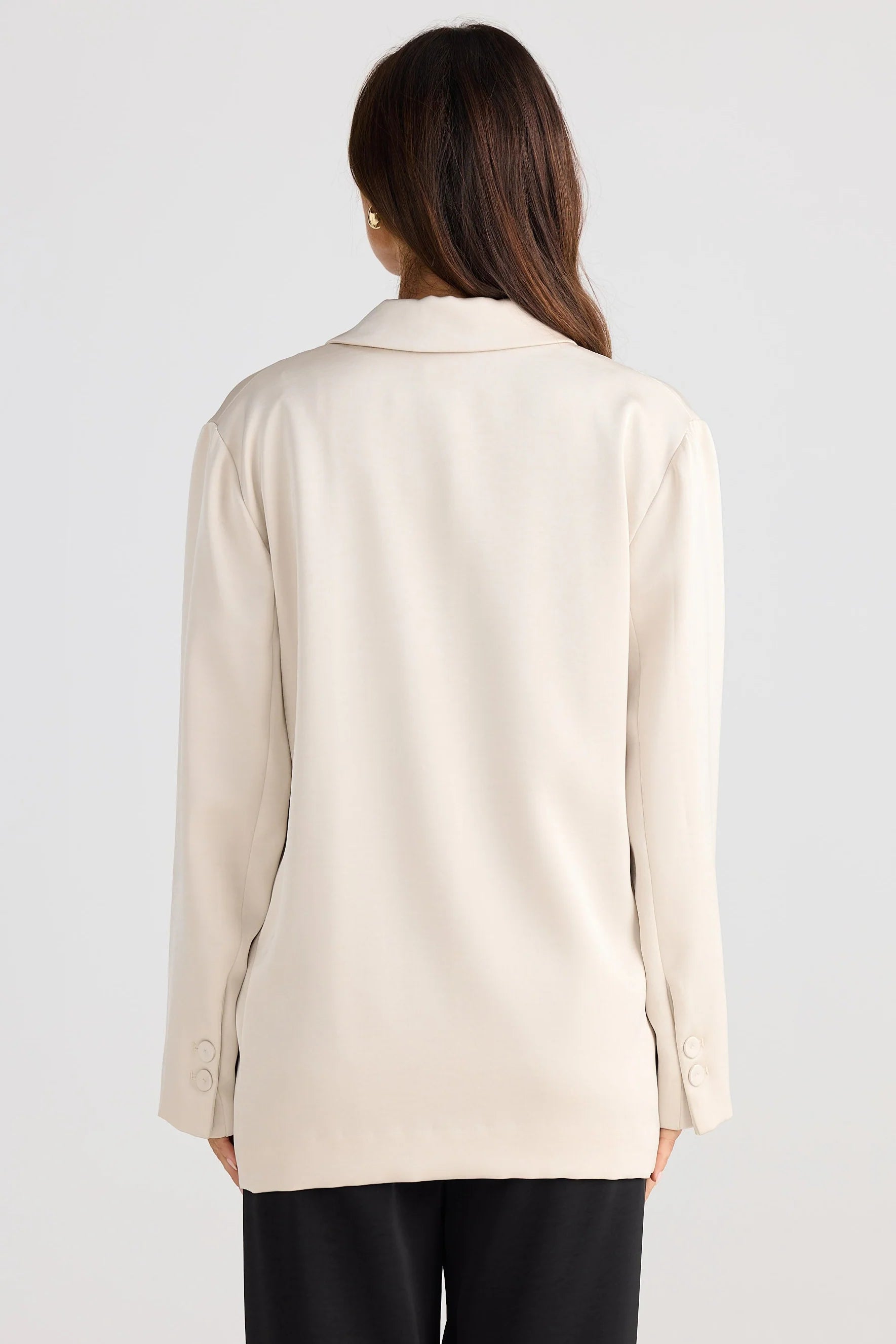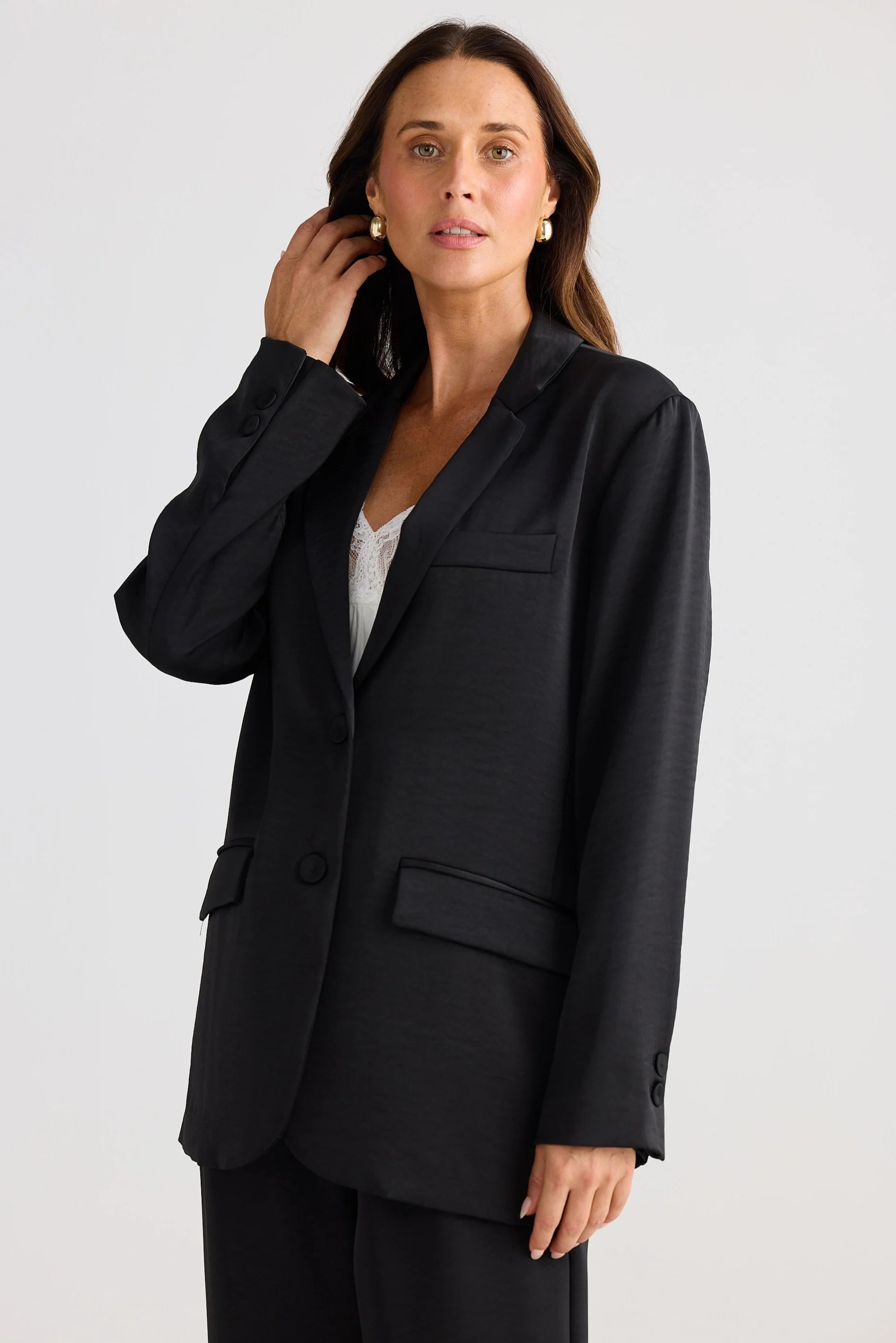 This blazer features a relaxed silhouette with a notched lapel, complemented by a chest pocket and flap pockets at the hips. Crafted from mid-weight satin, it combines structure with smooth texture. The main fabric and lining are both 100% polyester, ensuring durability and comfort.