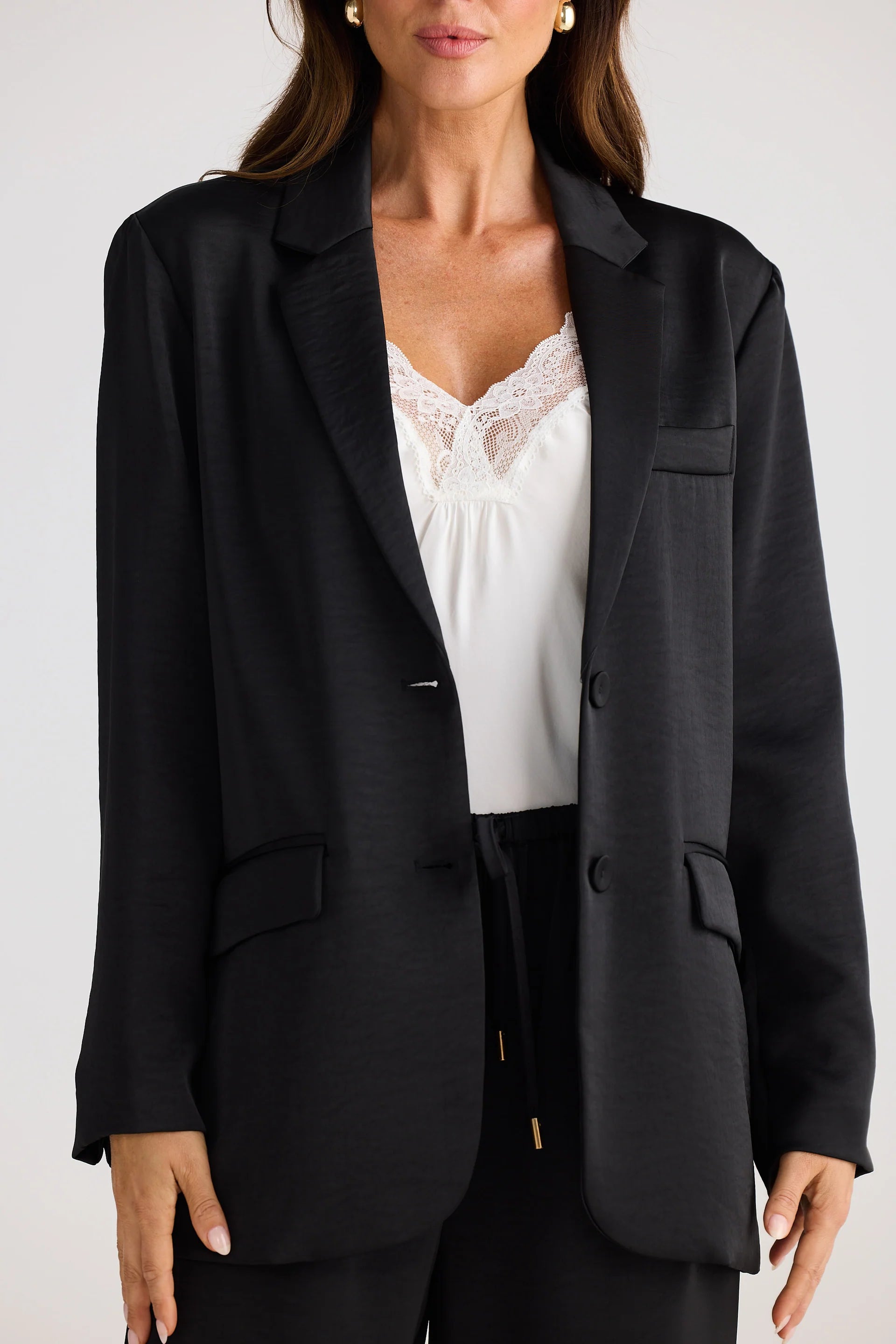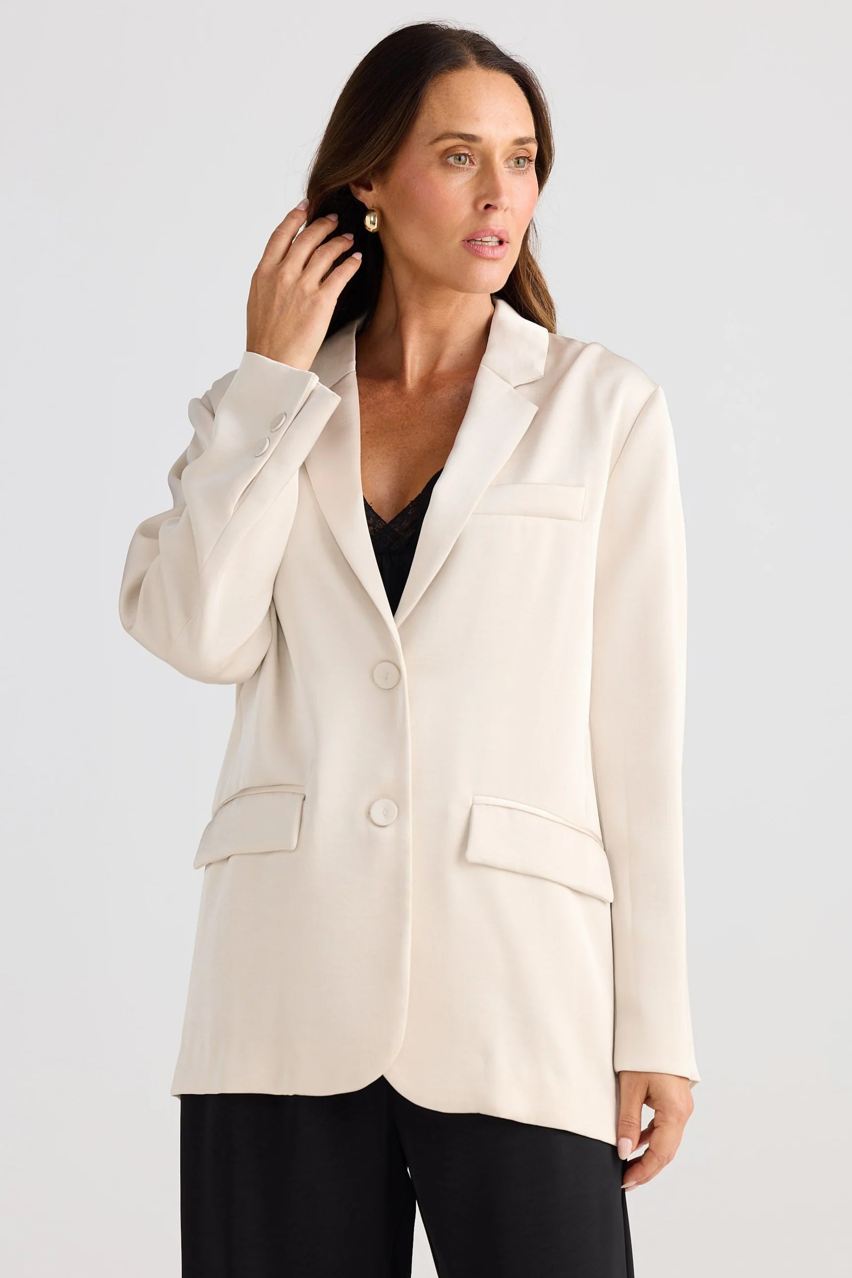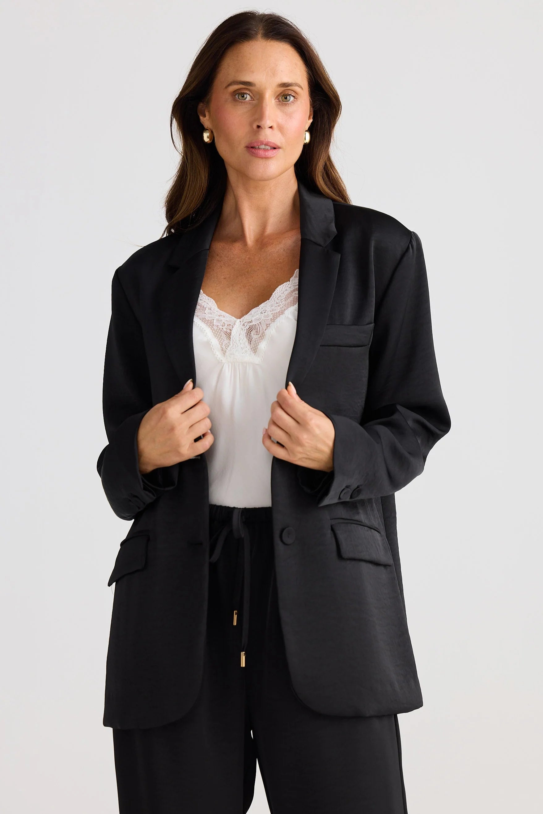 This blazer features a relaxed silhouette with a notched lapel, complemented by a chest pocket and flap pockets at the hips. Crafted from mid-weight satin, it combines structure with smooth texture. The main fabric and lining are both 100% polyester, ensuring durability and comfort.