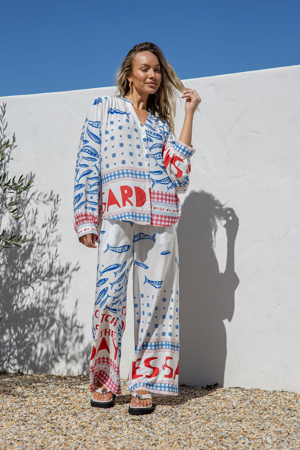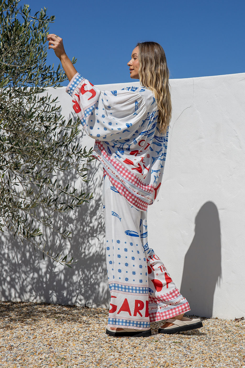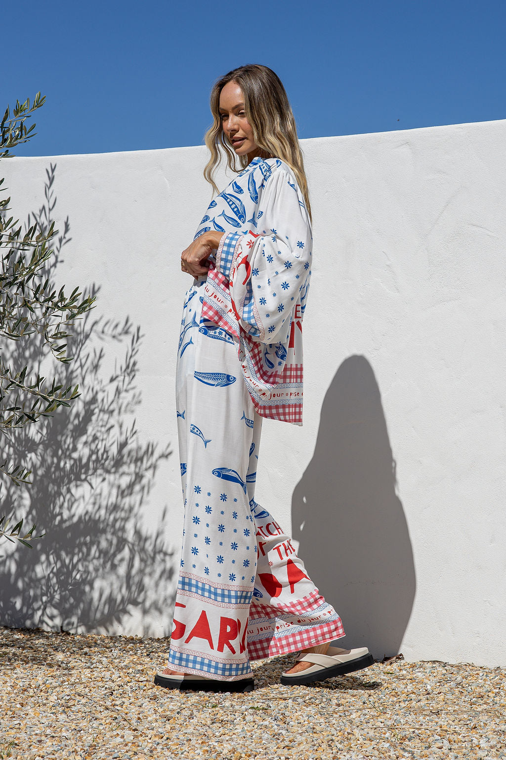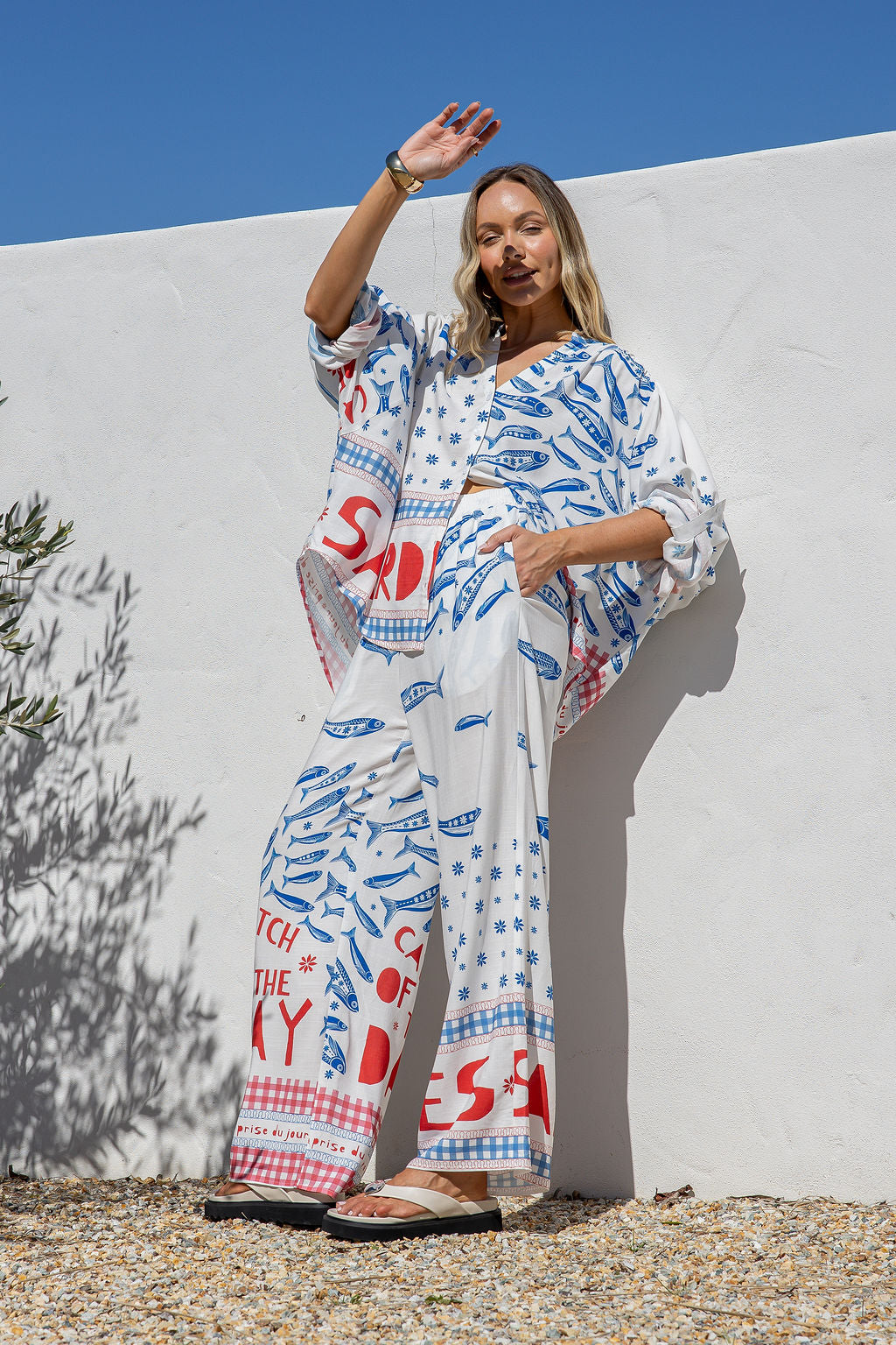 Make a splash with BTL's Catch of the Day Pants – the ultimate playful piece for your wardrobe! These printed wide-leg pants feature a fun, eye-catching design that brings coastal vibes to everyday style. Crafted from luxuriously soft textured bamboo rayon, they offer breathable comfort that moves with you. The elastic waist ensures an easy, relaxed fit that's perfect for lounging or stepping out. Whether you're channeling beachy energy or just want to add some personality to your look, these pants are your new go-to for effortless style with a splash of fun.