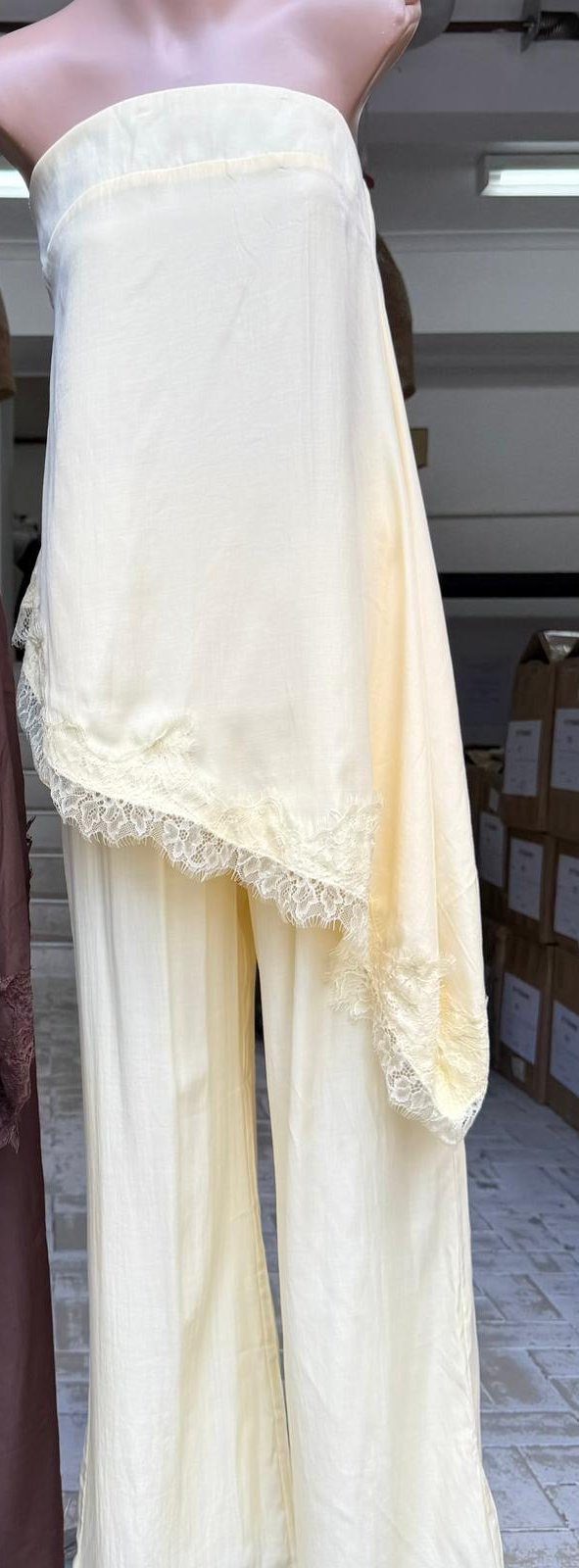 Make a statement in this vibrant yellow two-piece set that's equal parts bold and breezy. The strapless top pairs perfectly with wide-leg pants featuring an angled hem for an effortlessly chic silhouette. Crafted from luxurious 100% cupro with a cotton lining, this set feels as good as it looks—breathable, smooth, and ready for your next adventure. Whether you're heading to brunch or a night out, you'll turn heads in this sunny ensemble.