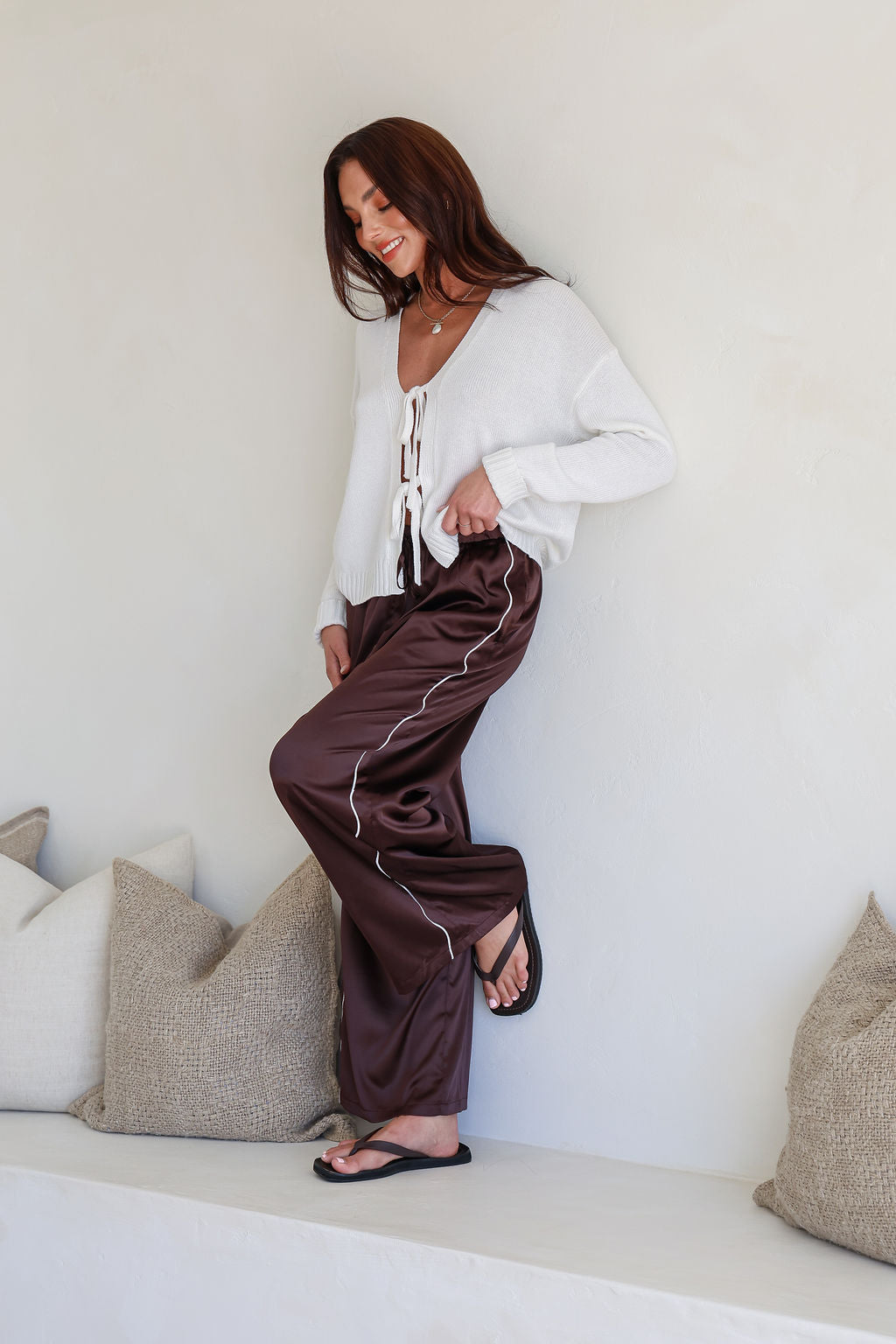 The Kara pants feature a luxurious soft and silky textile in a rich chocolate brown hue. These sophisticated trousers achieve optimal aesthetic impact when paired with their coordinating shirt, creating a refined ensemble.