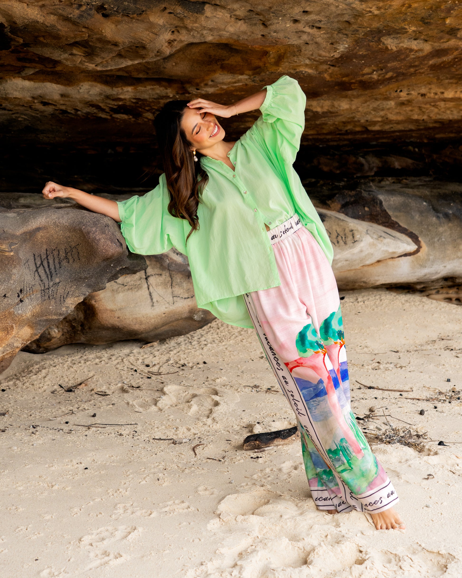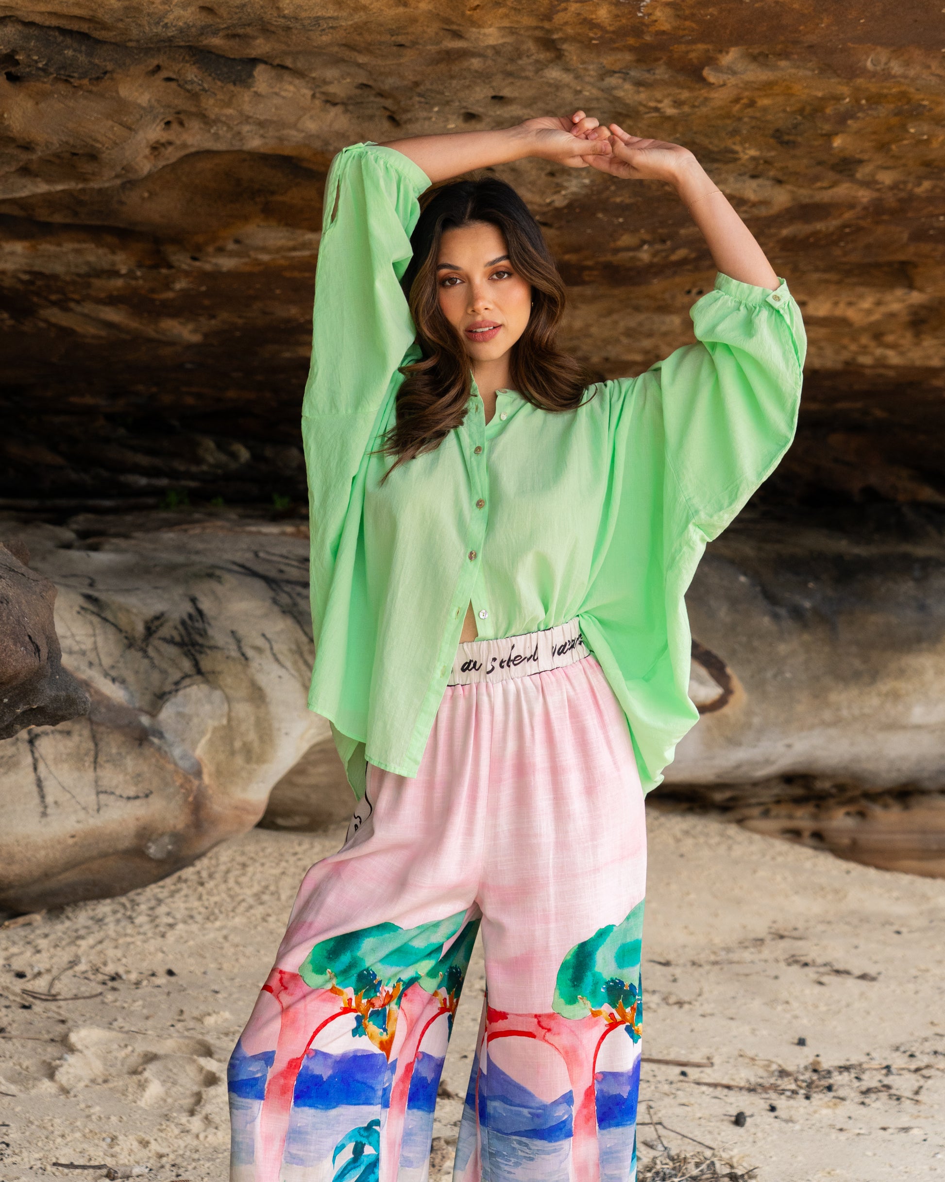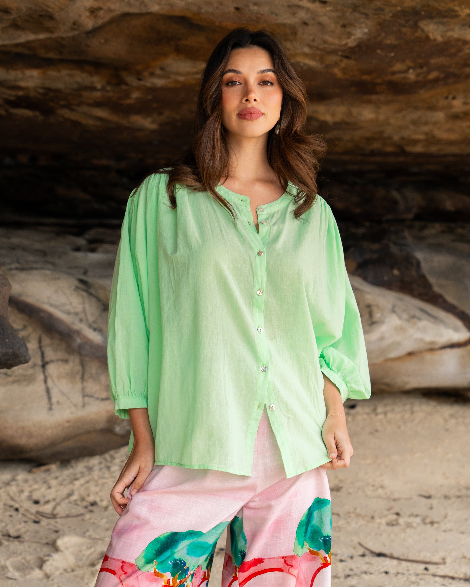 The ELLIE SHIRT is your new go-to for effortless charm. Crafted in the softest, most floaty fabric, this dreamy piece features whimsical bubble sleeves that add instant personality to any outfit. The gorgeous colour-block design pairs mint green with fairy floss pink for a look that's equal parts sweet and stylish. Perfect for those days when you want to feel light, breezy, and absolutely fabulous.
