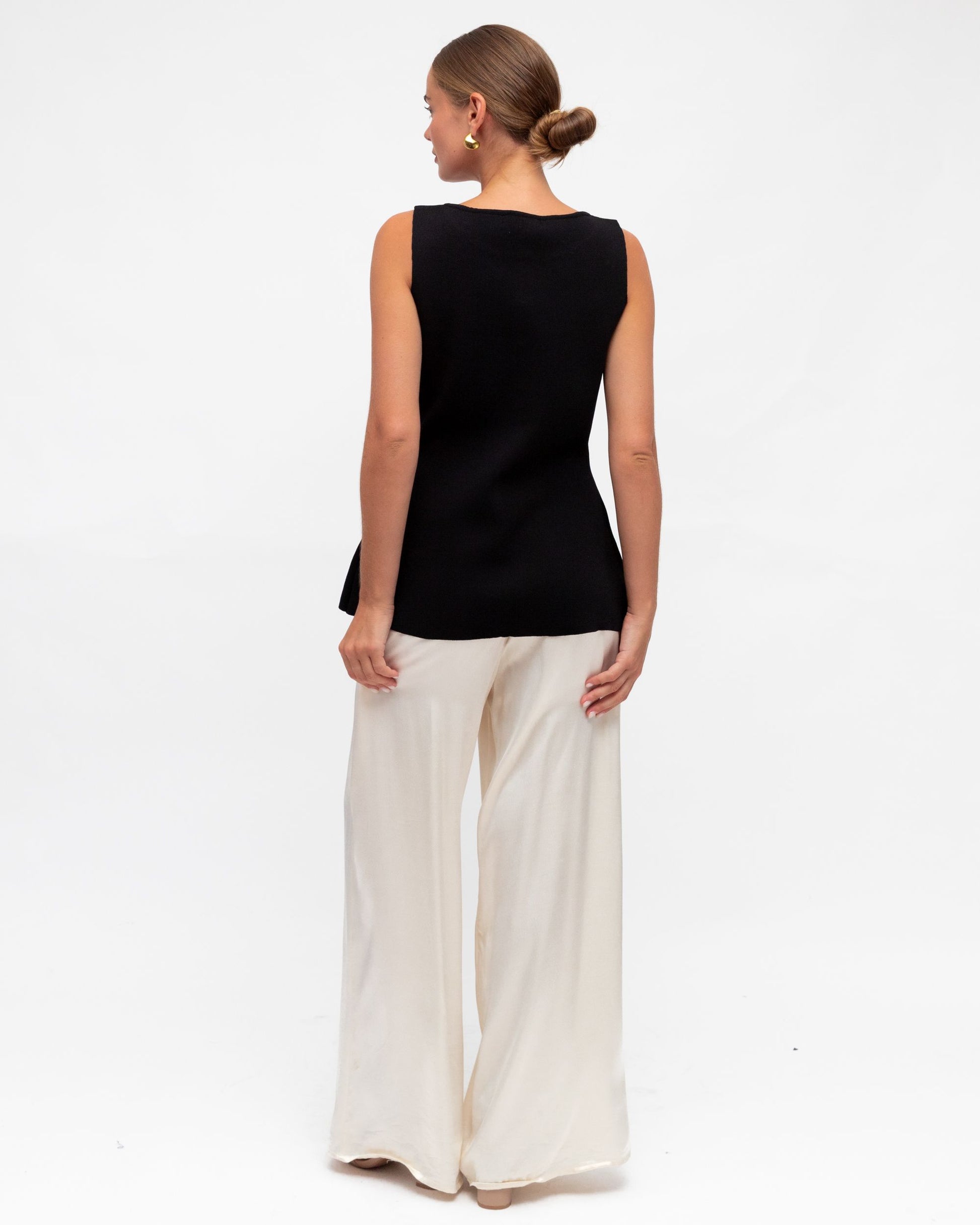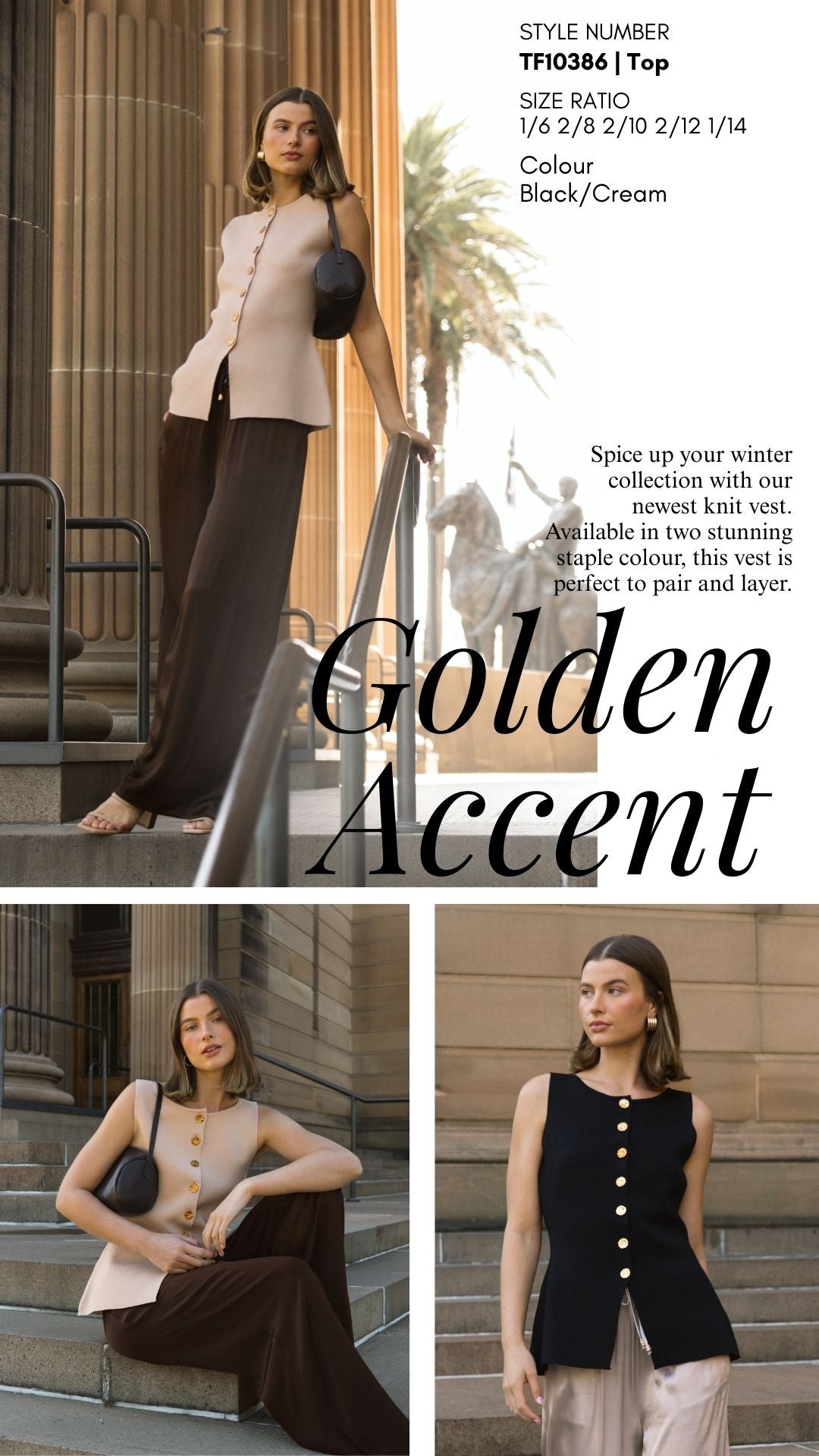 A chic and uncomplicated look adorned with exquisite gold button accents. The Tia vest is a sleeveless style with a round neckline.