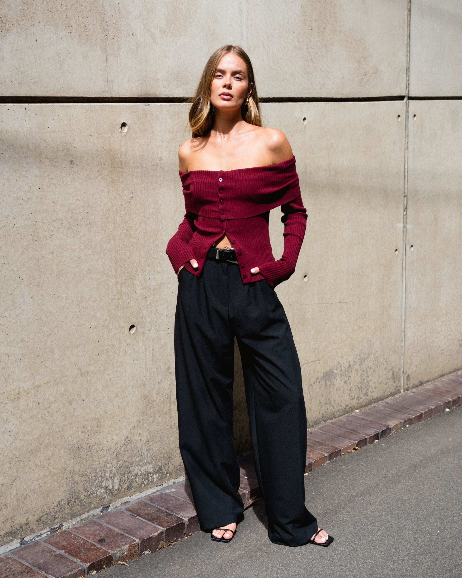 The MONICA KNIT features a trendy burgundy color and a ribbed design, with a chic off-shoulder fit. It also includes a button-through front for added style.
