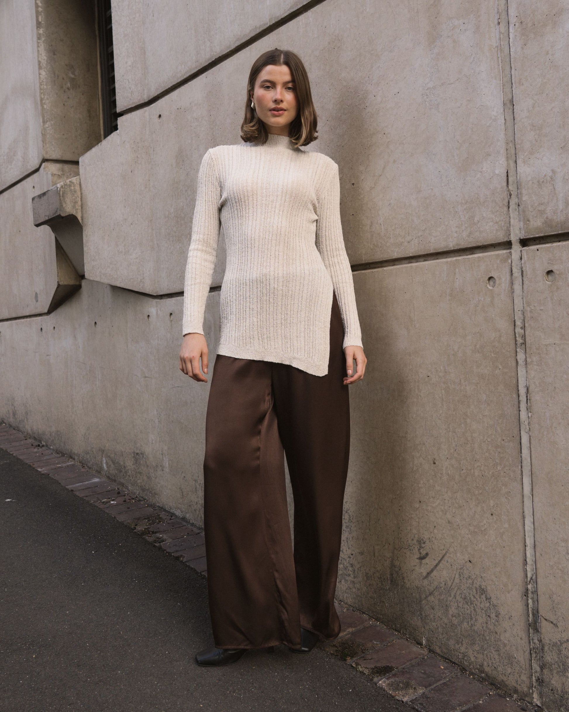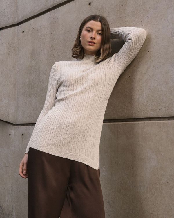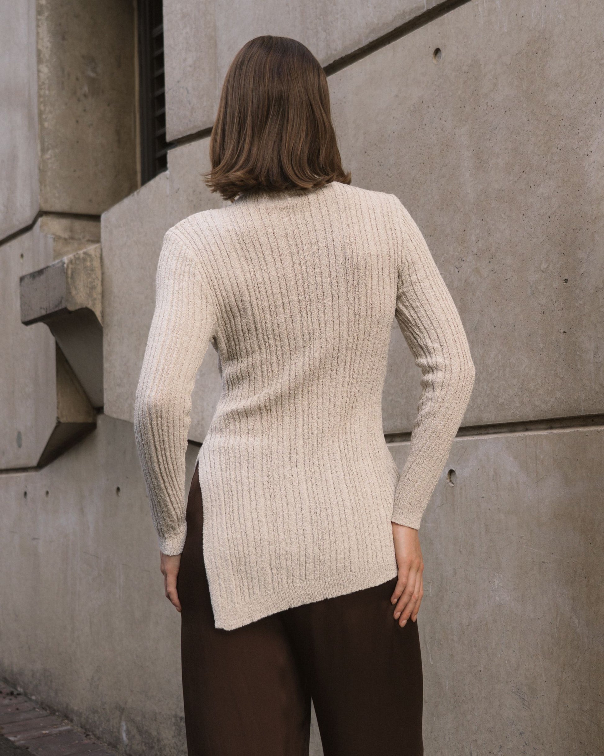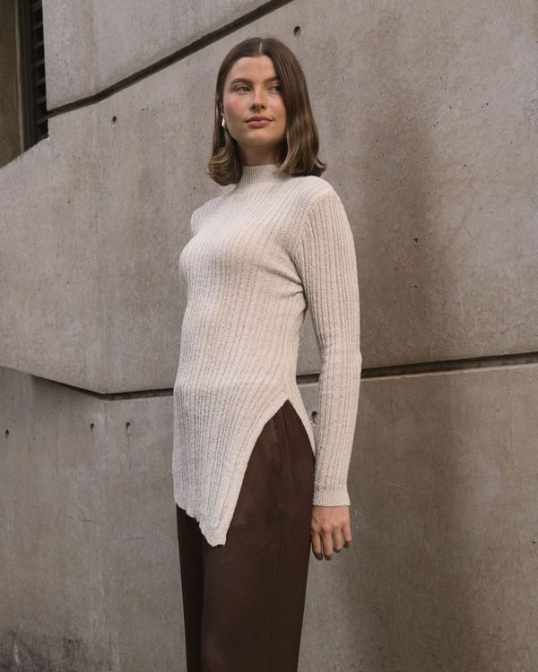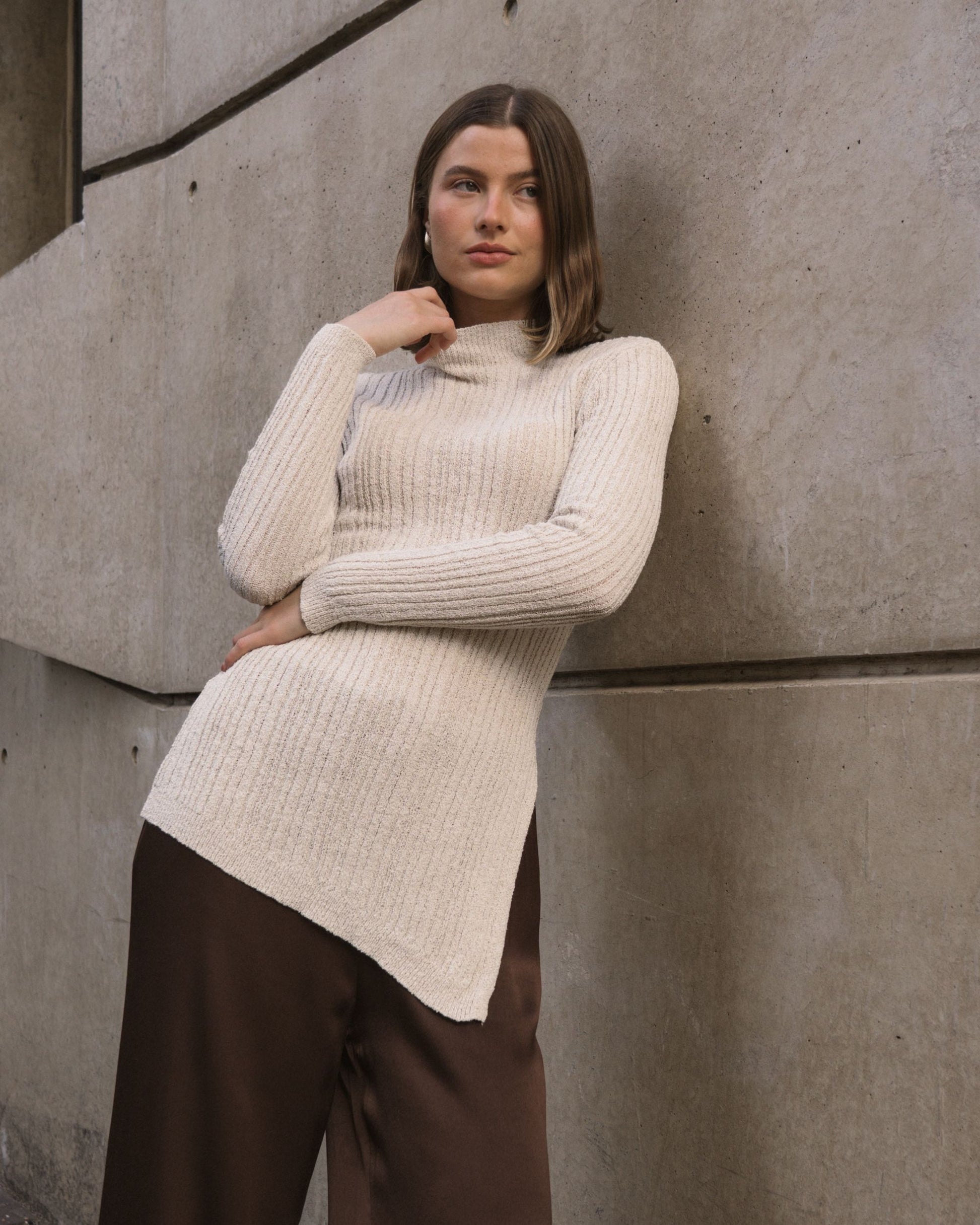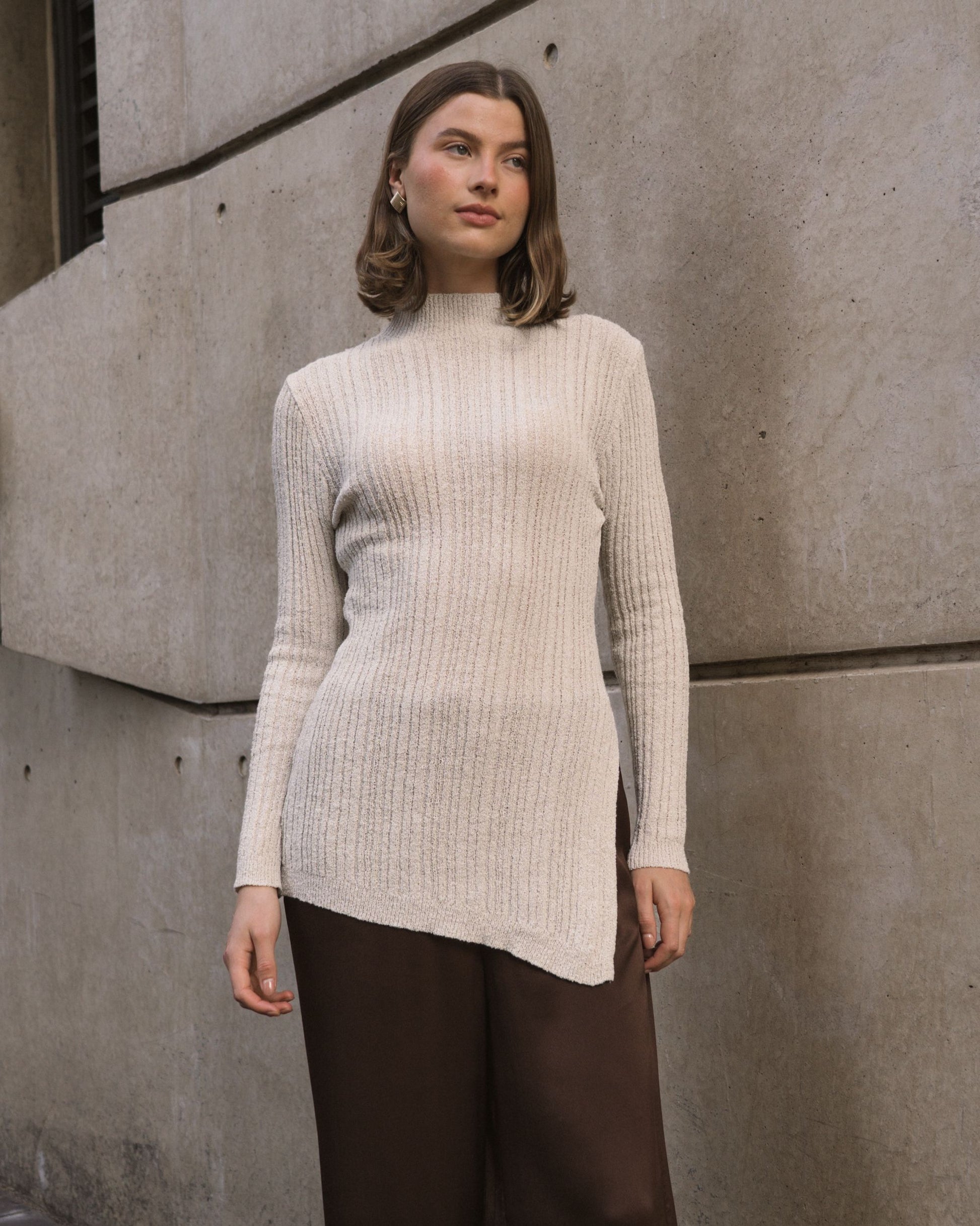 The Boucle Knit is a longer-length sweater designed to turn heads with its chic side split, adding a playful twist to your everyday look. Crafted for comfort and style, this knit flatters your silhouette while keeping you cozy. Perfect for layering or wearing solo, it effortlessly blends casual charm with a touch of elegance, making it a versatile addition to your wardrobe. Whether you're out for brunch or relaxing at home, the Boucle Knit brings a fun, fashionable vibe to any outfit..