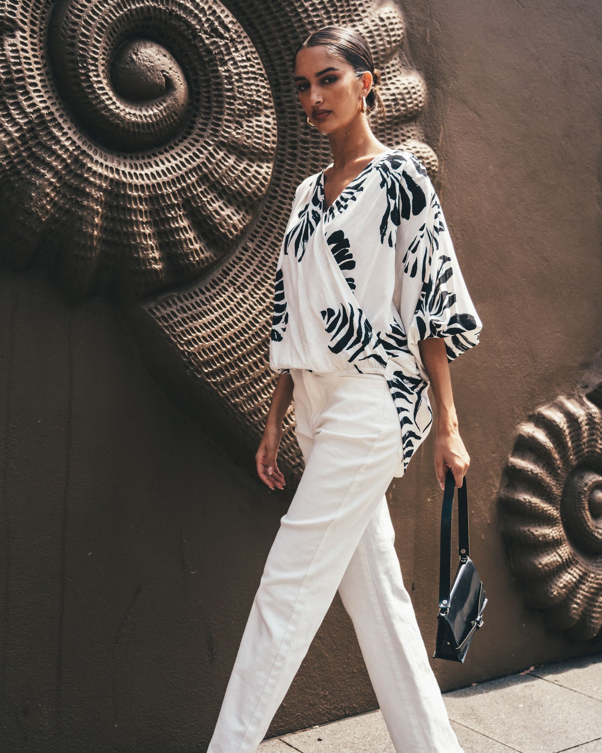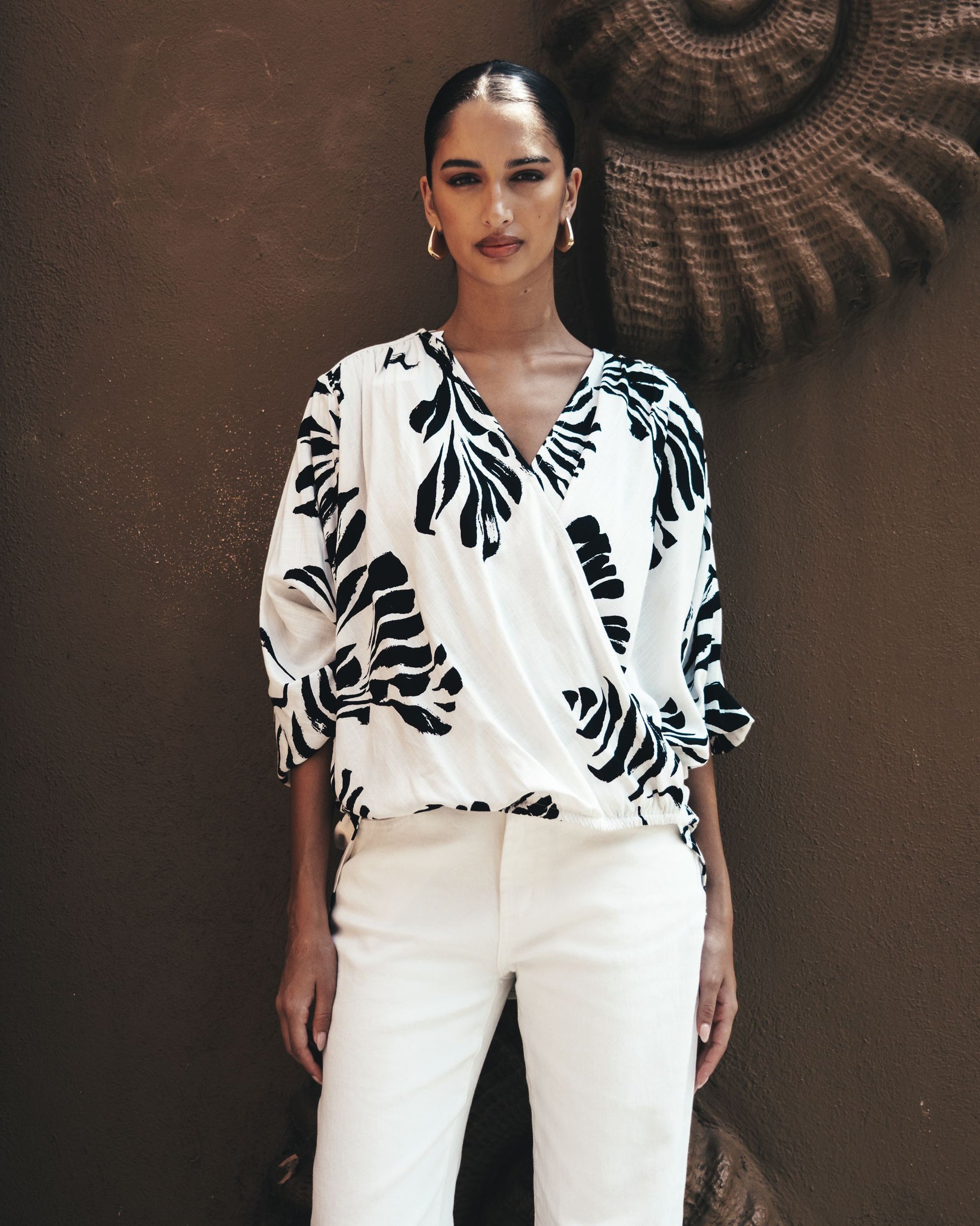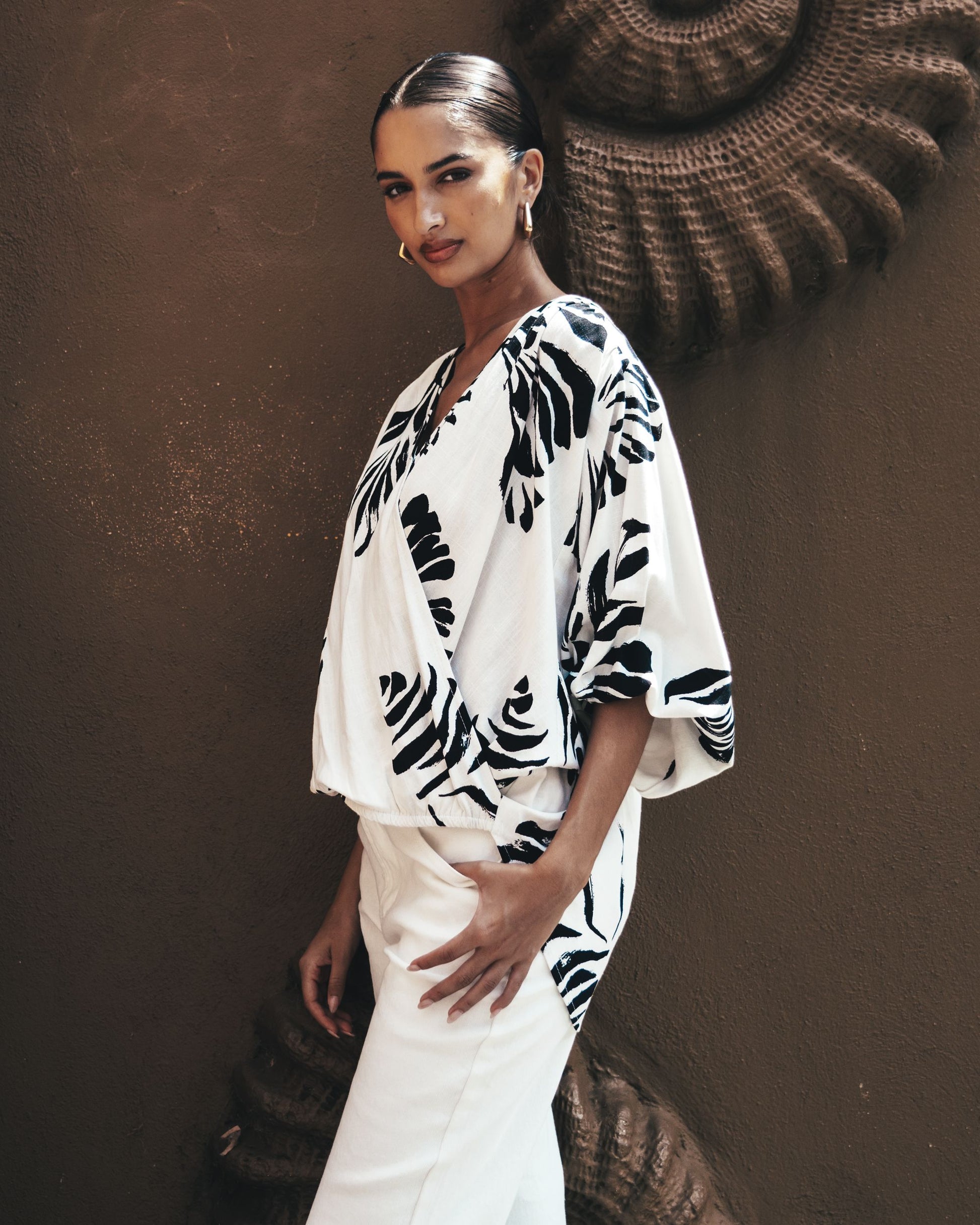 Step up your style game with our MIRE CROSS OVER BLOUSE. This classic black and white top boasts a stylish cross over design that will turn heads. Perfect for any occasion, this blouse is sure to elevate your look.