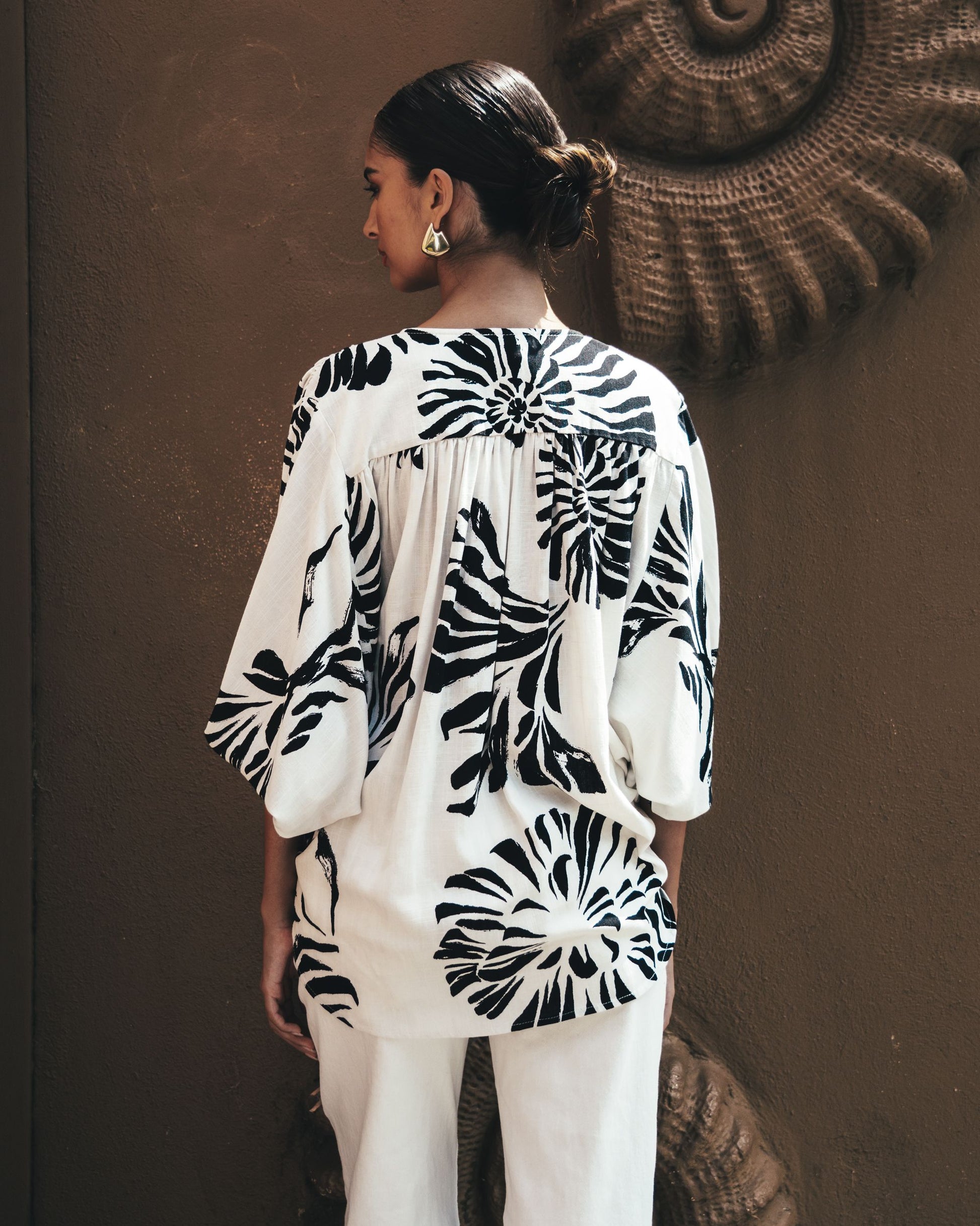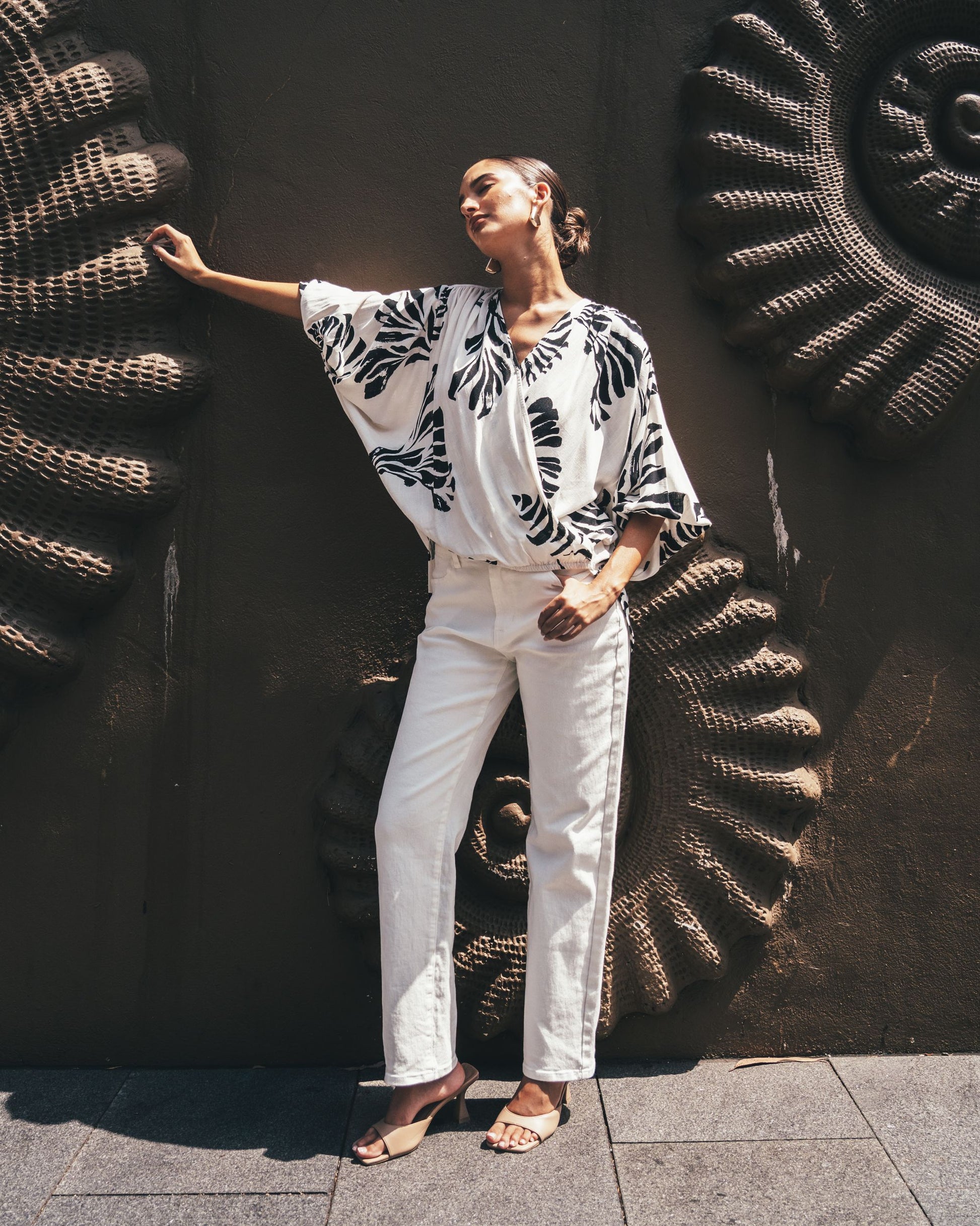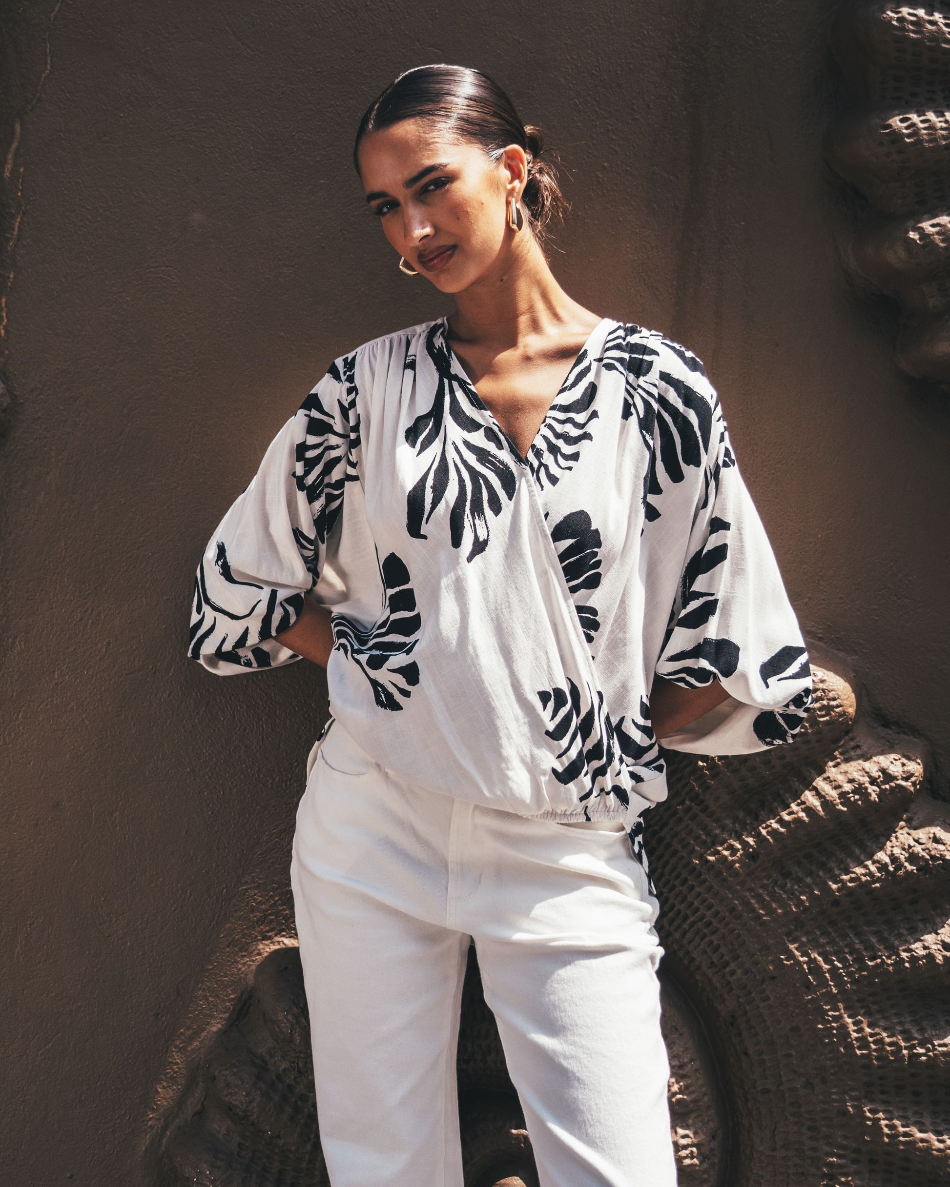 Step up your style game with our MIRE CROSS OVER BLOUSE. This classic black and white top boasts a stylish cross over design that will turn heads. Perfect for any occasion, this blouse is sure to elevate your look.