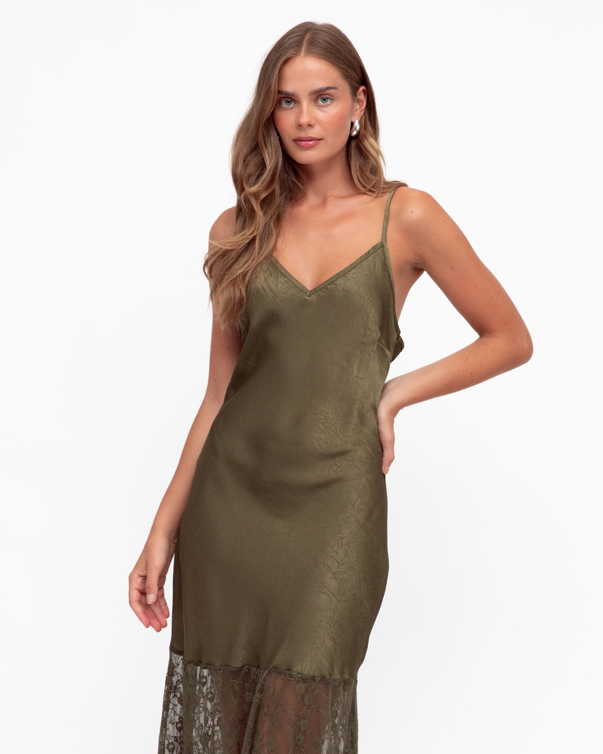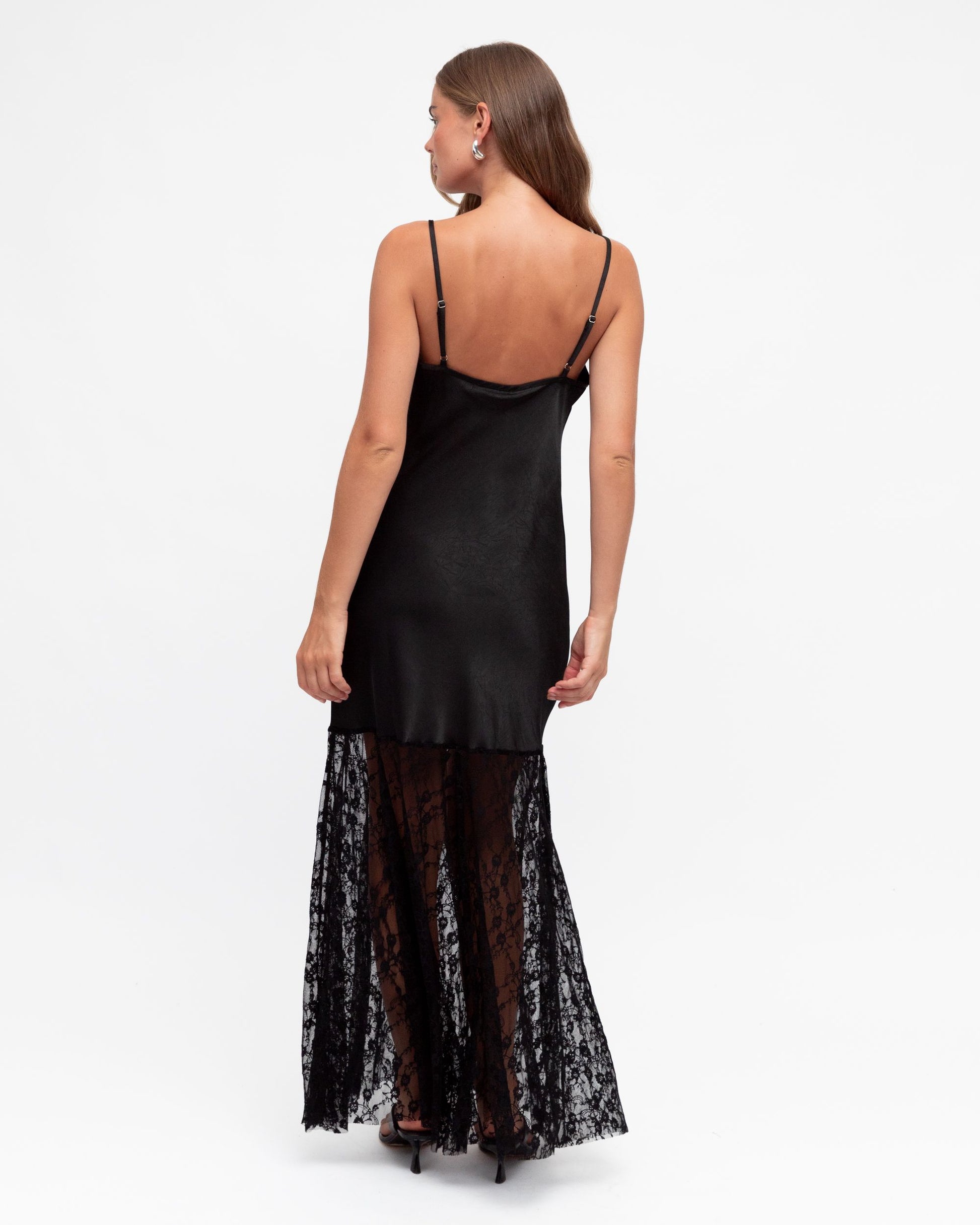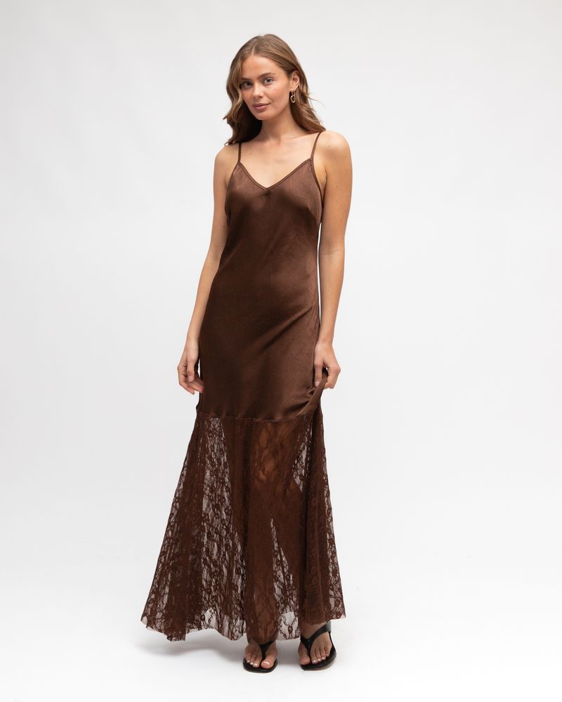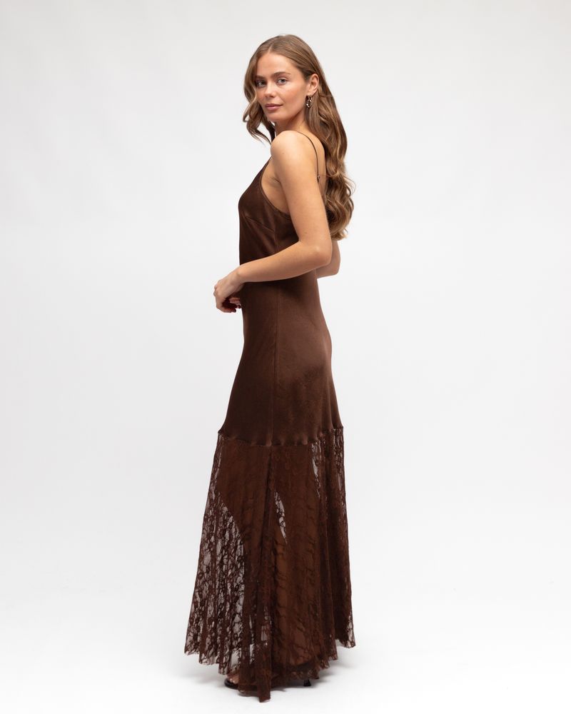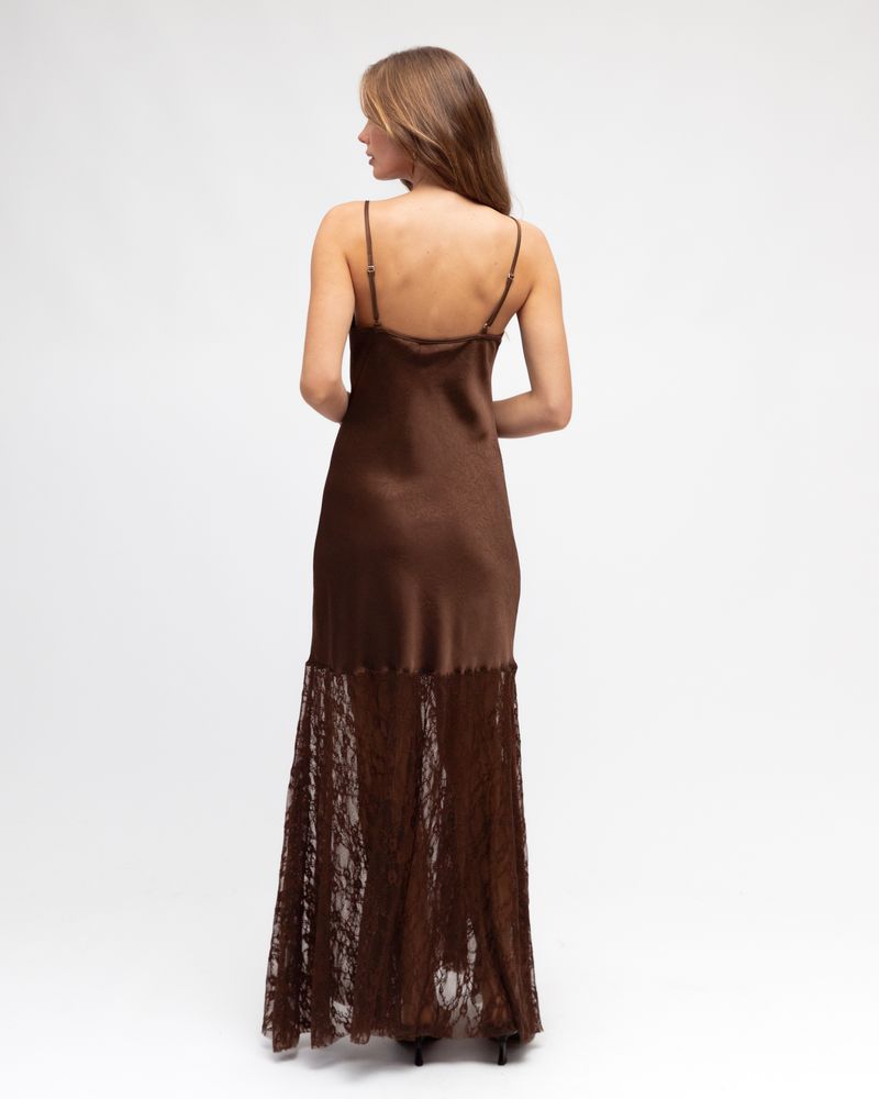 A necessary addition to any wardrobe, this satin bias cut maxi dress with lace trim is perfect when paired with a blazer and heels for a sophisticated look this season.