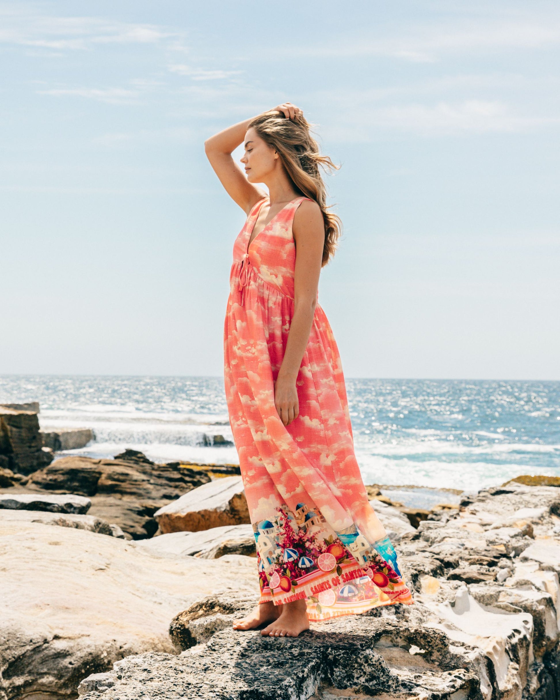 Escape to the Greek islands with the Santorini Maxi, a show-stopping dress that brings vibrant vacation vibes straight to your wardrobe. This beauty showcases a stunning colorful print that's impossible to ignore, paired with a flattering v-neck design that's both elegant and effortless. The clever cut-out detail and adjustable tie add a playful twist, letting you customize the fit to suit your mood. Whether you're heading to a summer soirée, a beachside brunch, or simply want to feel like you're on holiday, this maxi delivers style and comfort in one gorgeous package. Perfect for those days when you want to turn heads and feel absolutely fabulous.