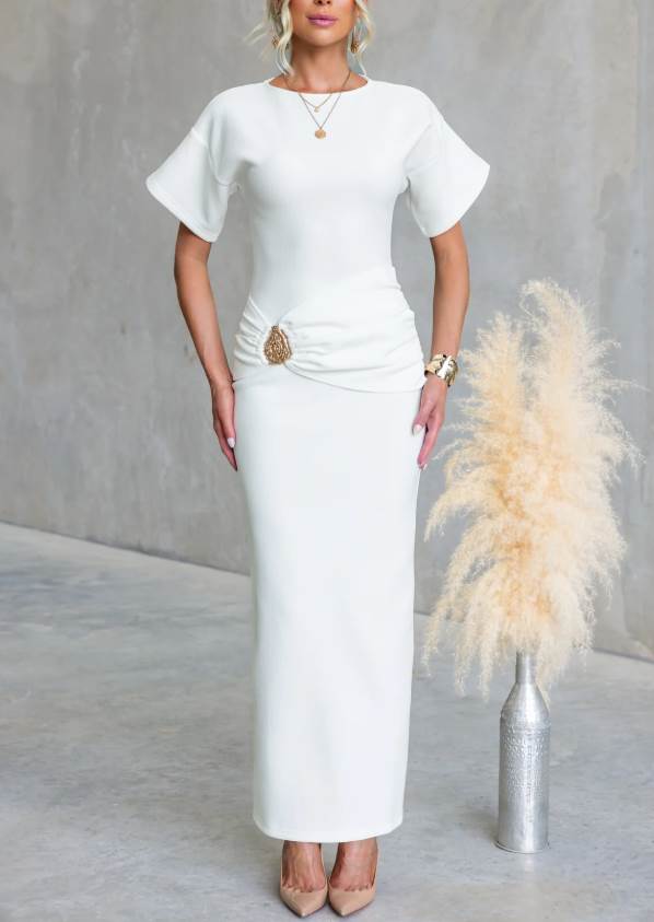 The Azalia Dress from Indika is a showstopper in gorgeous powder pink that's perfect for turning heads at your next event. This beauty features a statement gold buckle positioned on the right hip that adds instant glamour and personality to your look. The cleverly gathered fabric at the waist creates a flattering silhouette while adding movement and dimension to the design. Whether you're dressing up for a special occasion or want to elevate your everyday style, the Azalia Dress combines elegant sophistication with playful charm. The soft pink hue pairs beautifully with metallic accessories, while the structured waist detail ensures a polished, put-together finish every time you wear it.