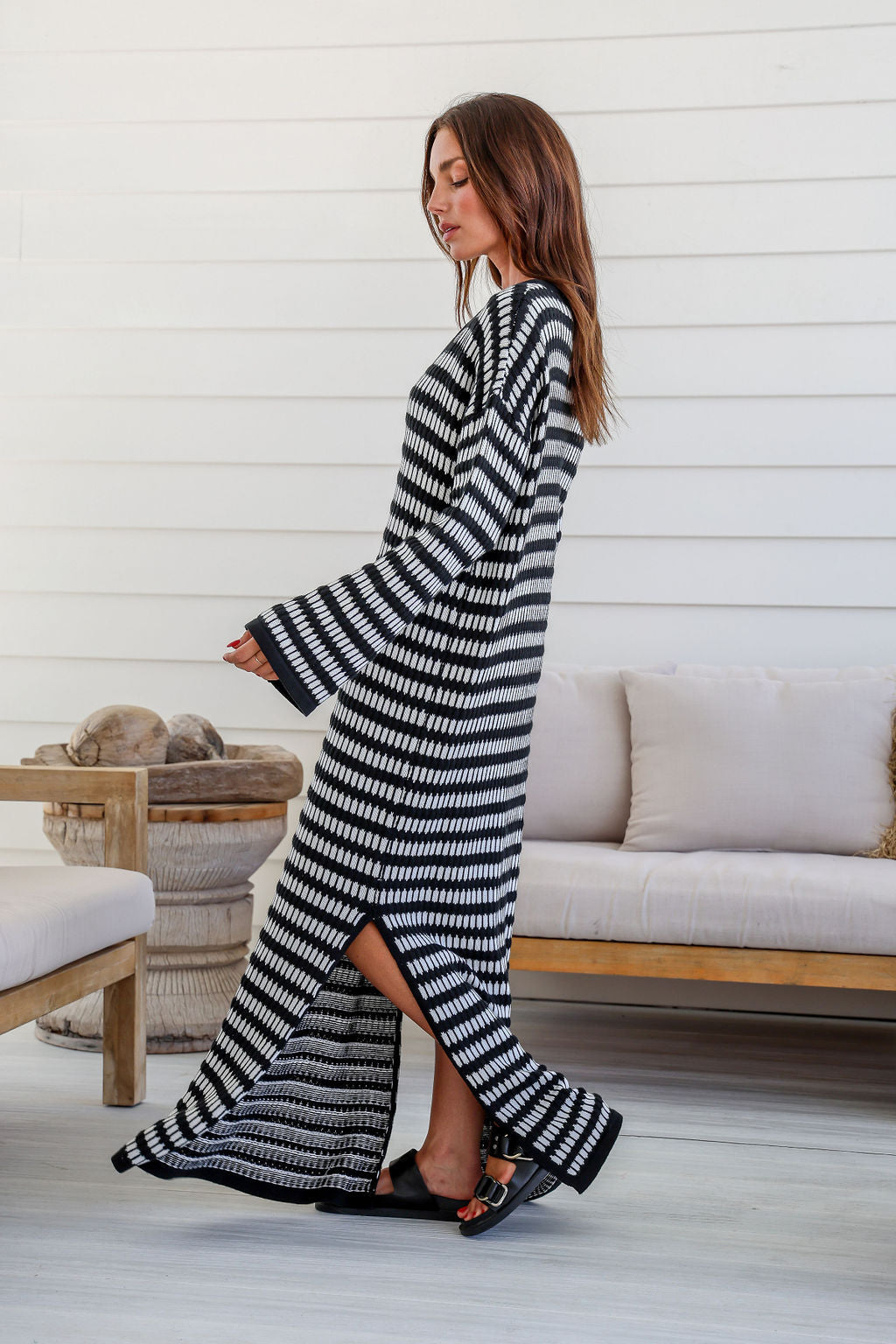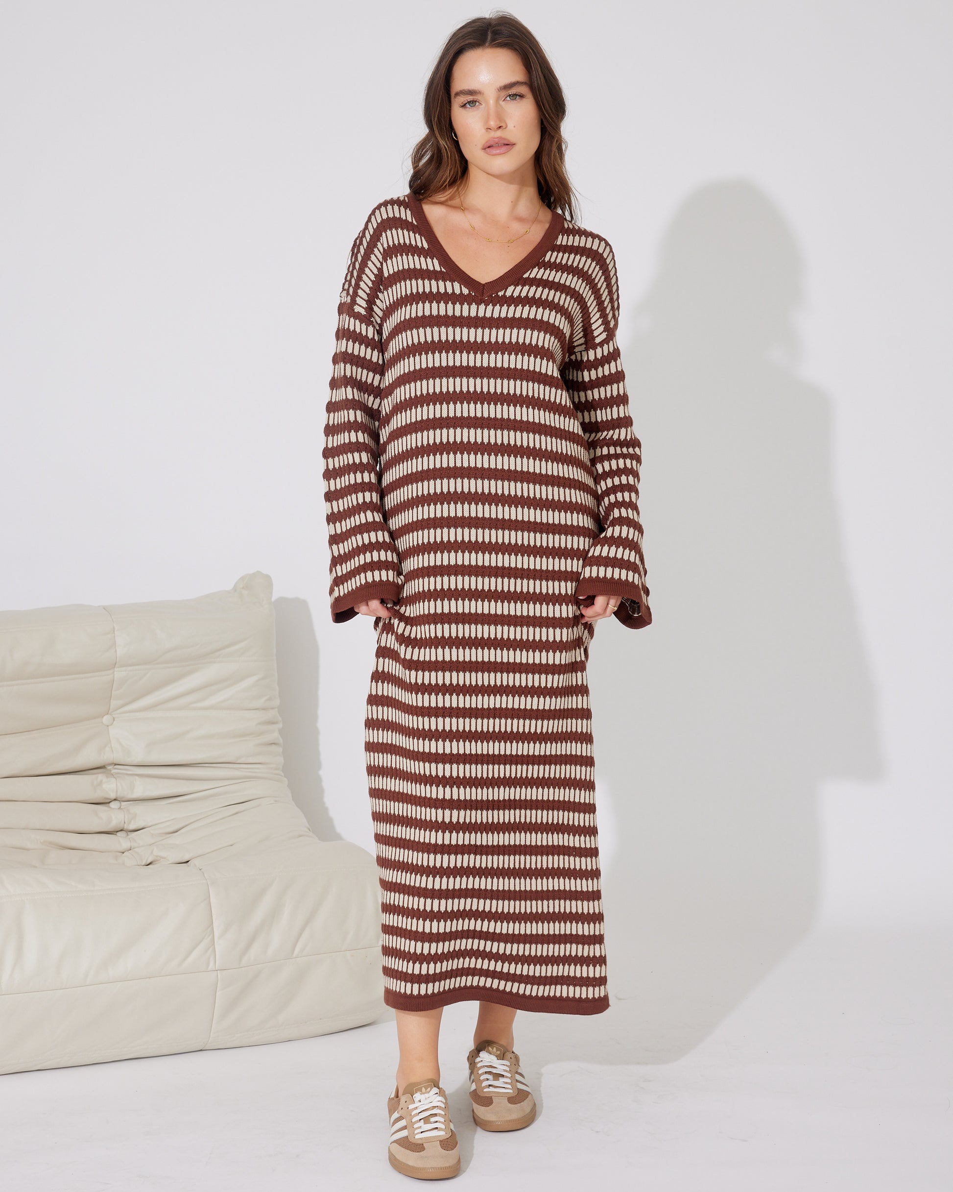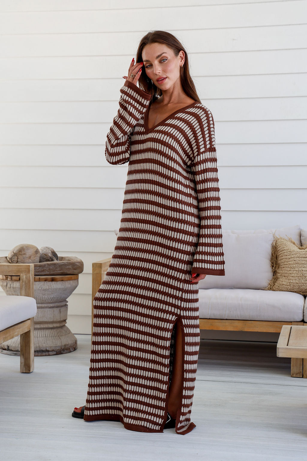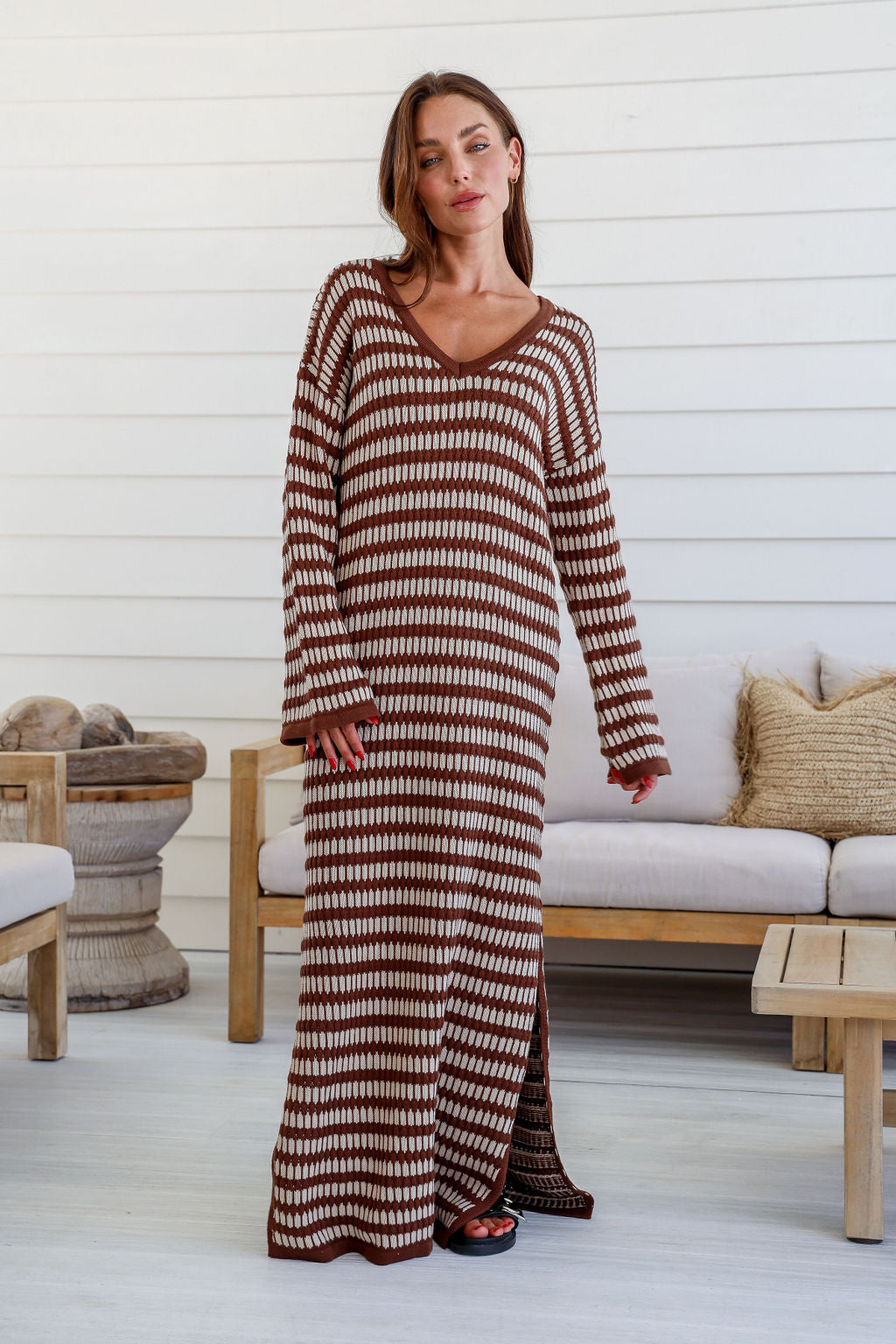 Be the envy of the town in our NEL KNIT MAXI - JTL0114! Made of 100% COTTON with bell sleeves and front slits in a captivating chocolate and black knit. Step up your style game with this stunning and unique piece.