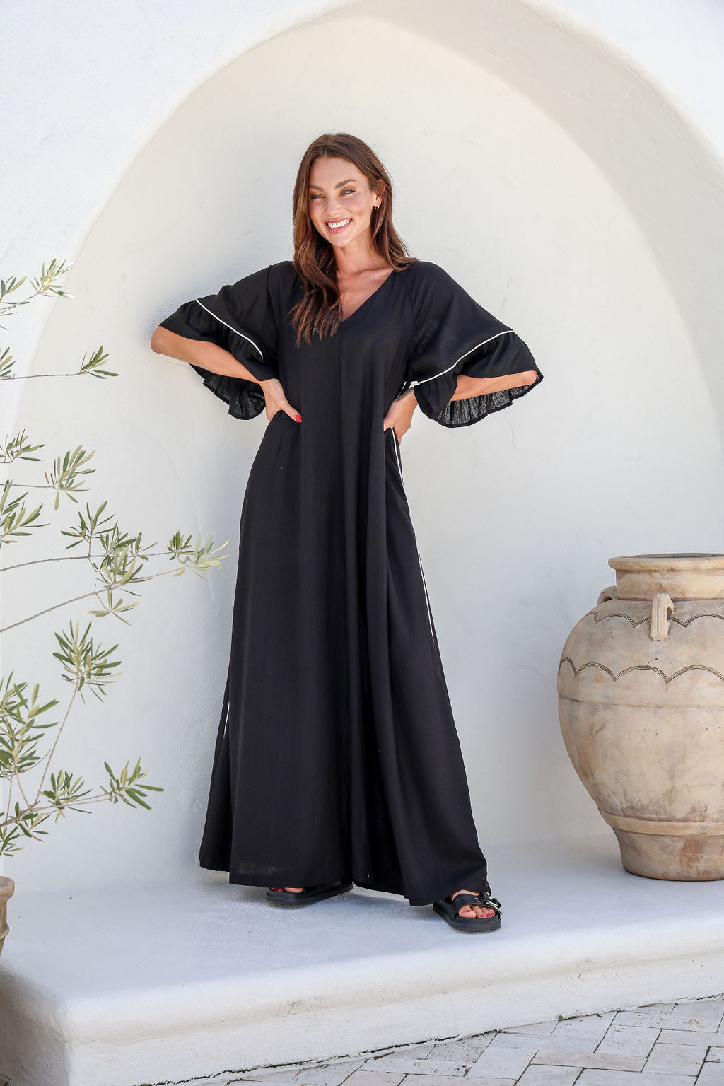 Experience the Helena, a remarkable fusion of linen and rayon, in the form of a stunning black maxi. With its useful pockets and striking white piping, this versatile dress transitions seamlessly from casual day wear to elegant evening attire.