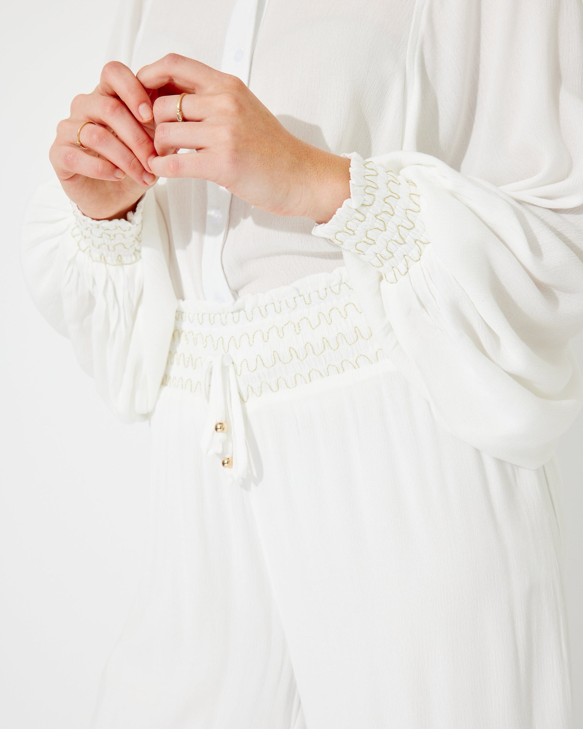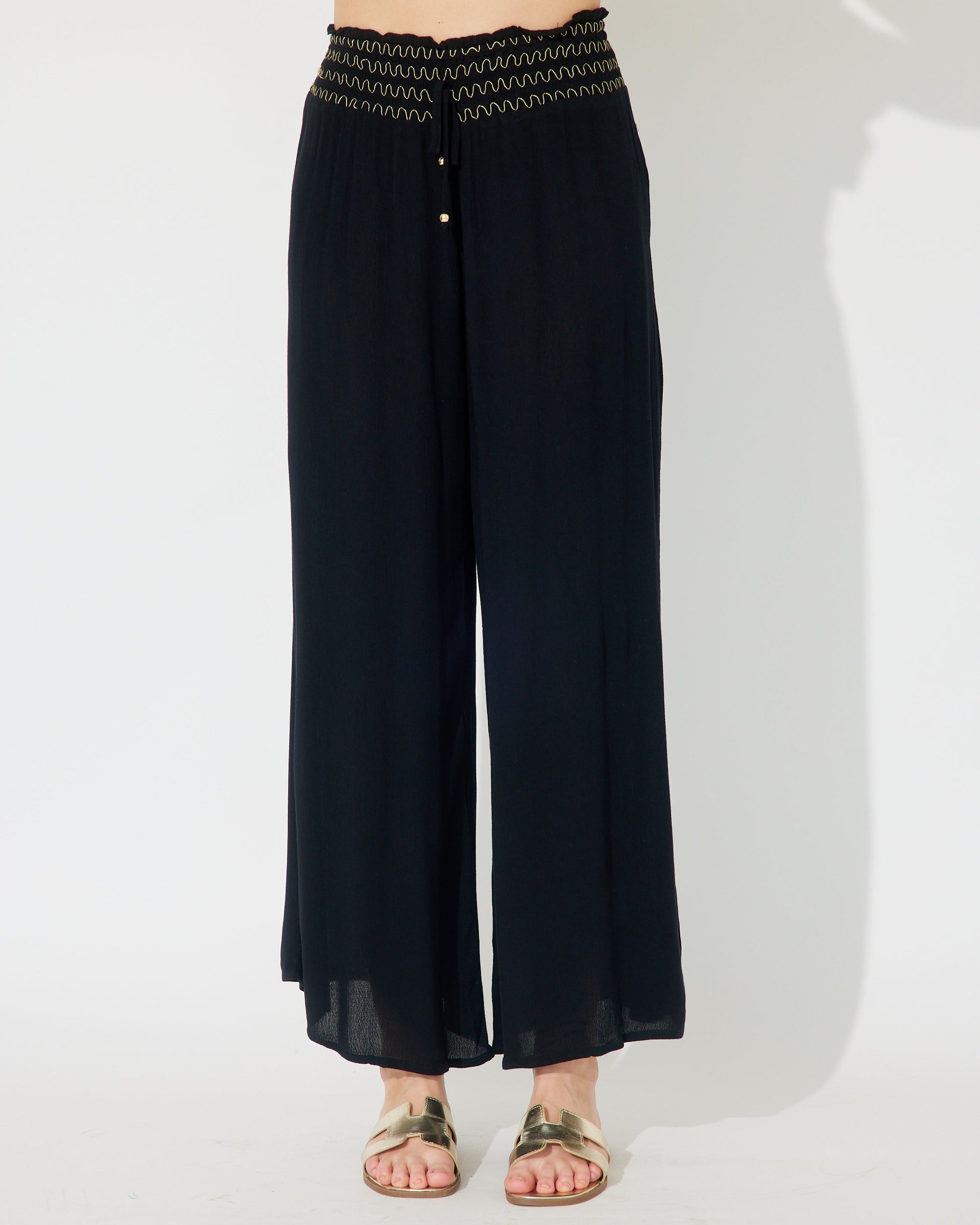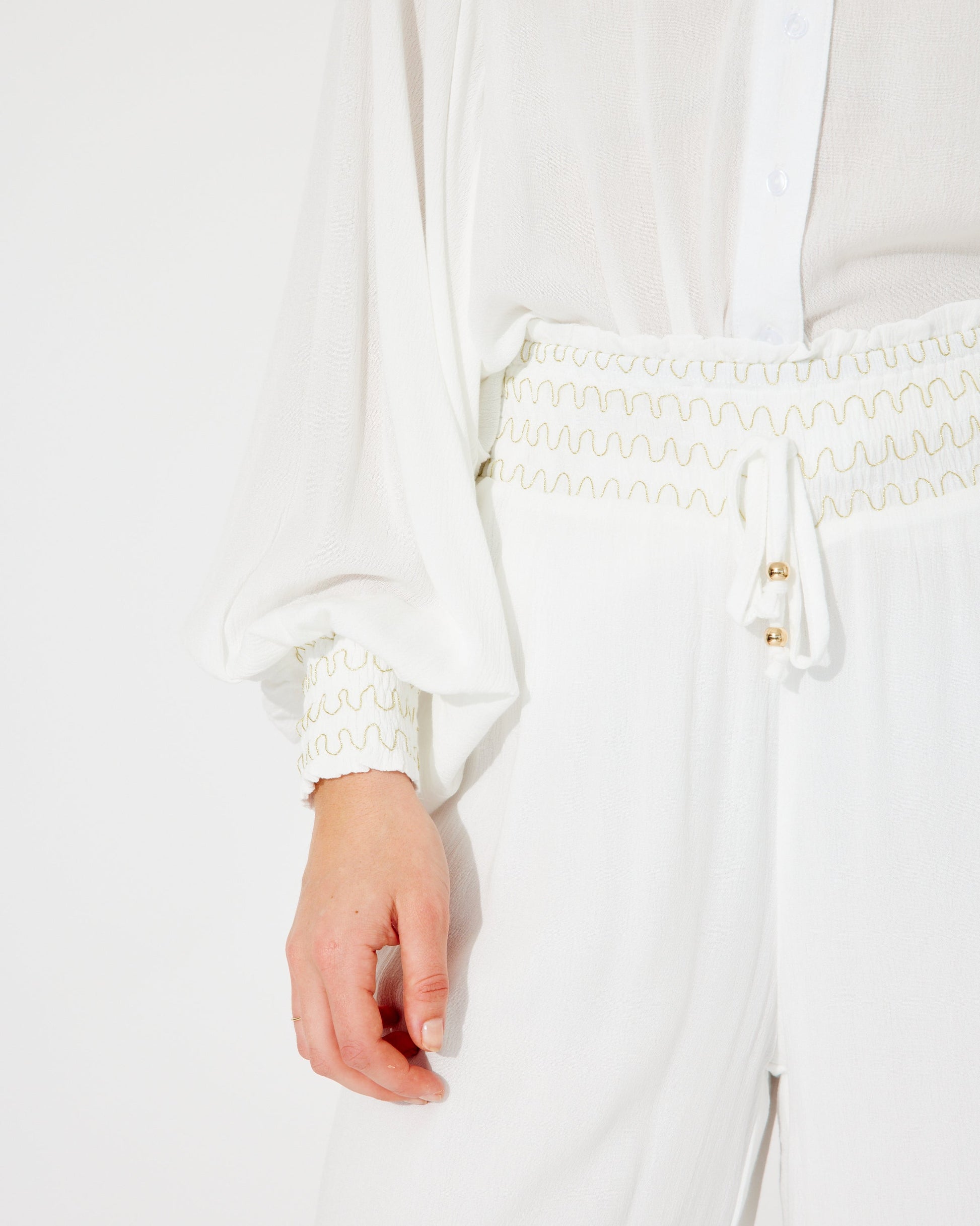 Get ready for the ultimate beach to bar set! Introducing MILOS, made with 100% crinkle rayon with gold lurex and shirring. It's the epitome of glamour! The shirred elasticated lurex-trimmed waist and cuff not only make these sets incredibly comfortable, but also extremely chic. Just imagine, the fabric feels as if it's floating across your skin. Get ready to be the highlight of the day and night with MILOS!