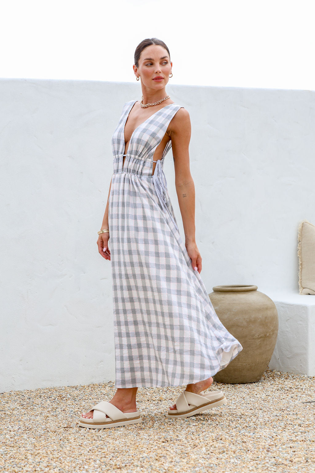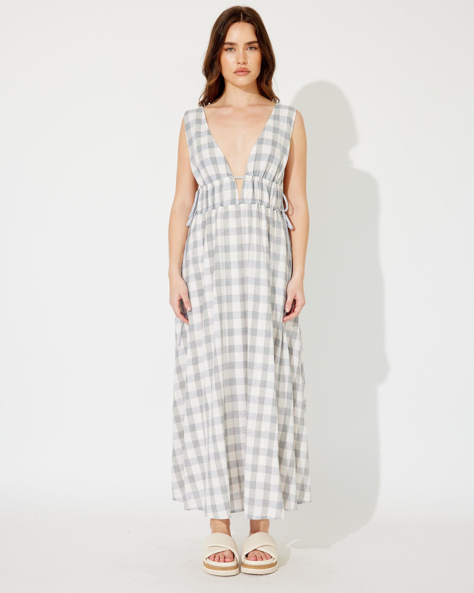 Introducing the Ginny Maxi - a quirky, cotton maxi dress with a wide gingham check and pale pink stripe trim. Fully lined and featuring an adjustable neckline and side panels, this dress is both playful and functional. Meet Ginny - your new go-to dress!