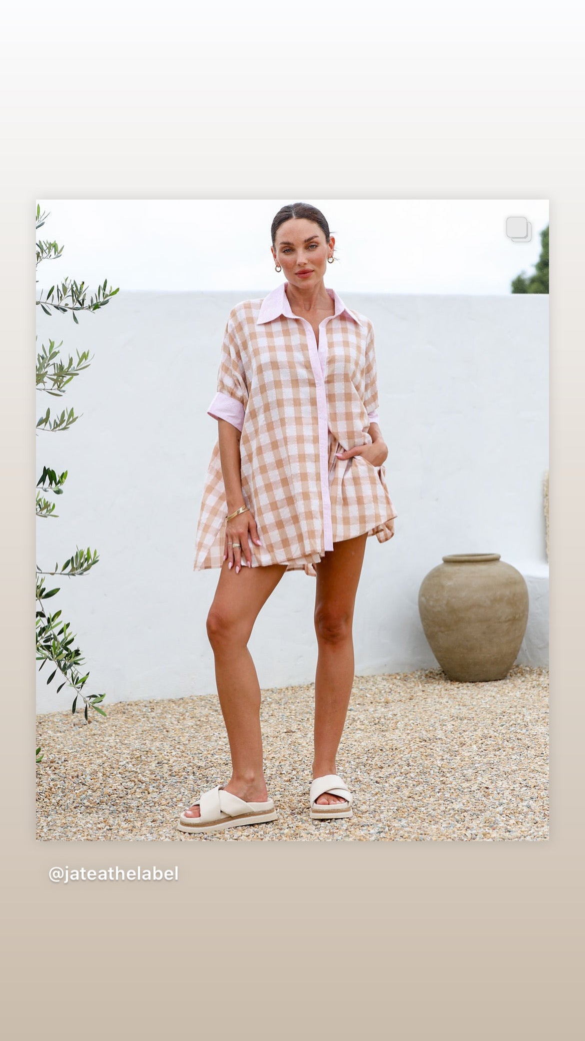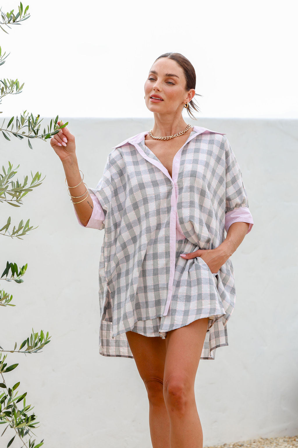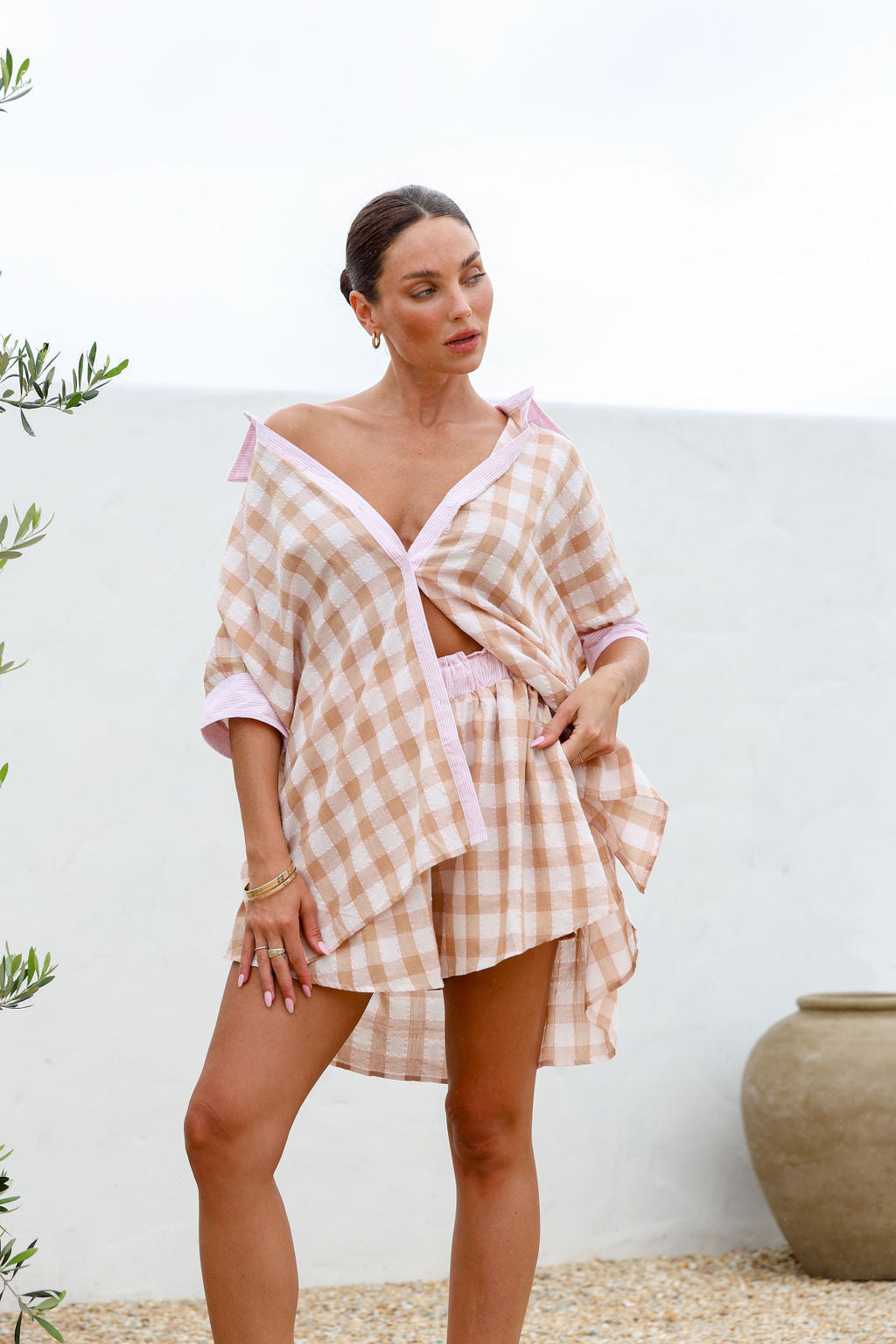 Introducing our GINNY SHORT, the perfect addition to your wardrobe. Made with a cotton base, these flutter shorts feature a wide gingham check pattern and pale pink stripe trim for a fun, feminine touch. Plus, they're fully lined for extra comfort. Available in beige/pink and grey/pink. Don't wait, meet Ginny now!