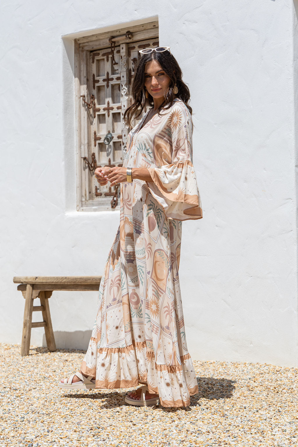 Embrace your inner fairytale with the ESTELLA STORY MAXI. This stunning maxi dress features a bell sleeve, V neck, and a long length that will make you feel like a princess. Perfect for any occasion, let this dress be the story of your style.