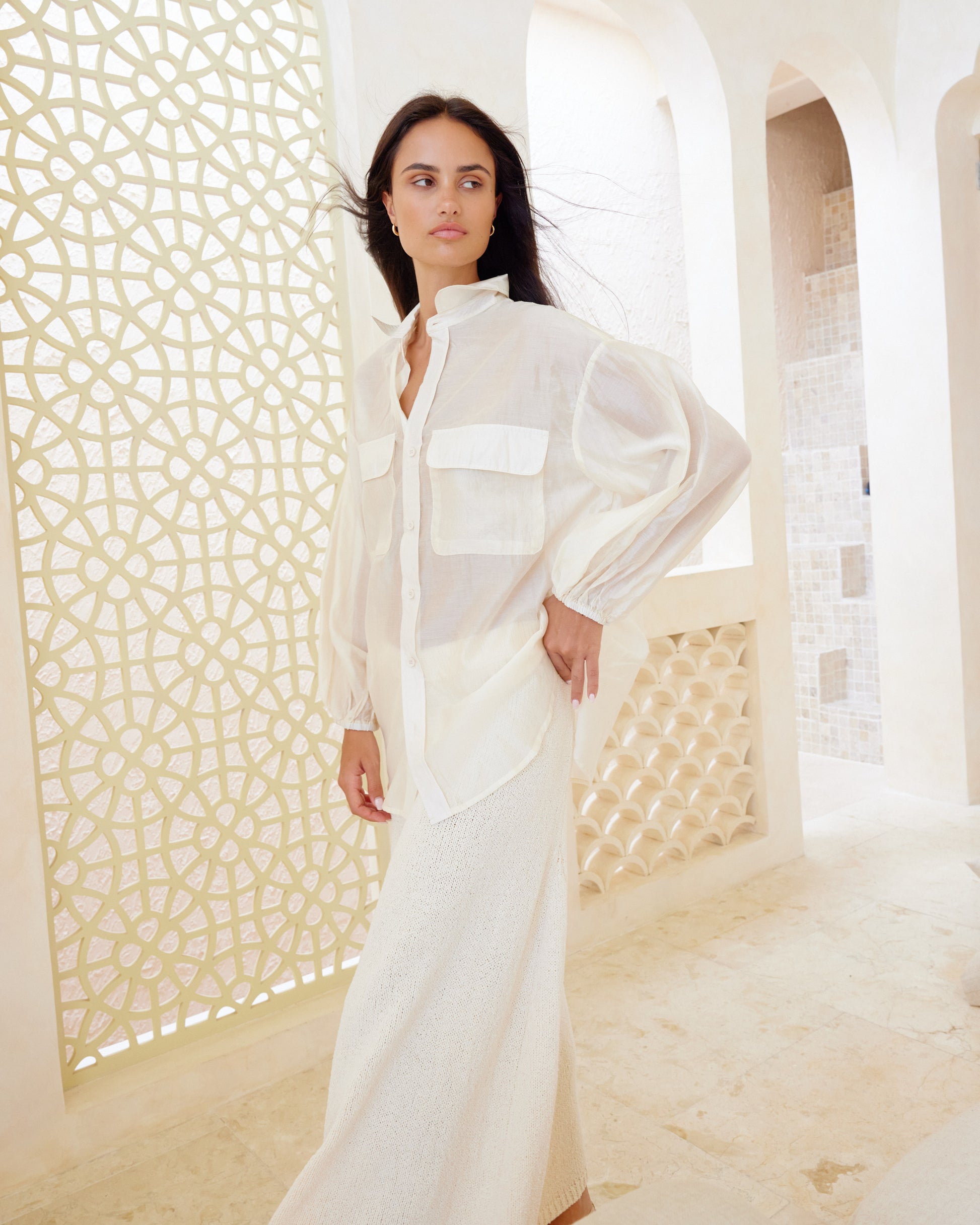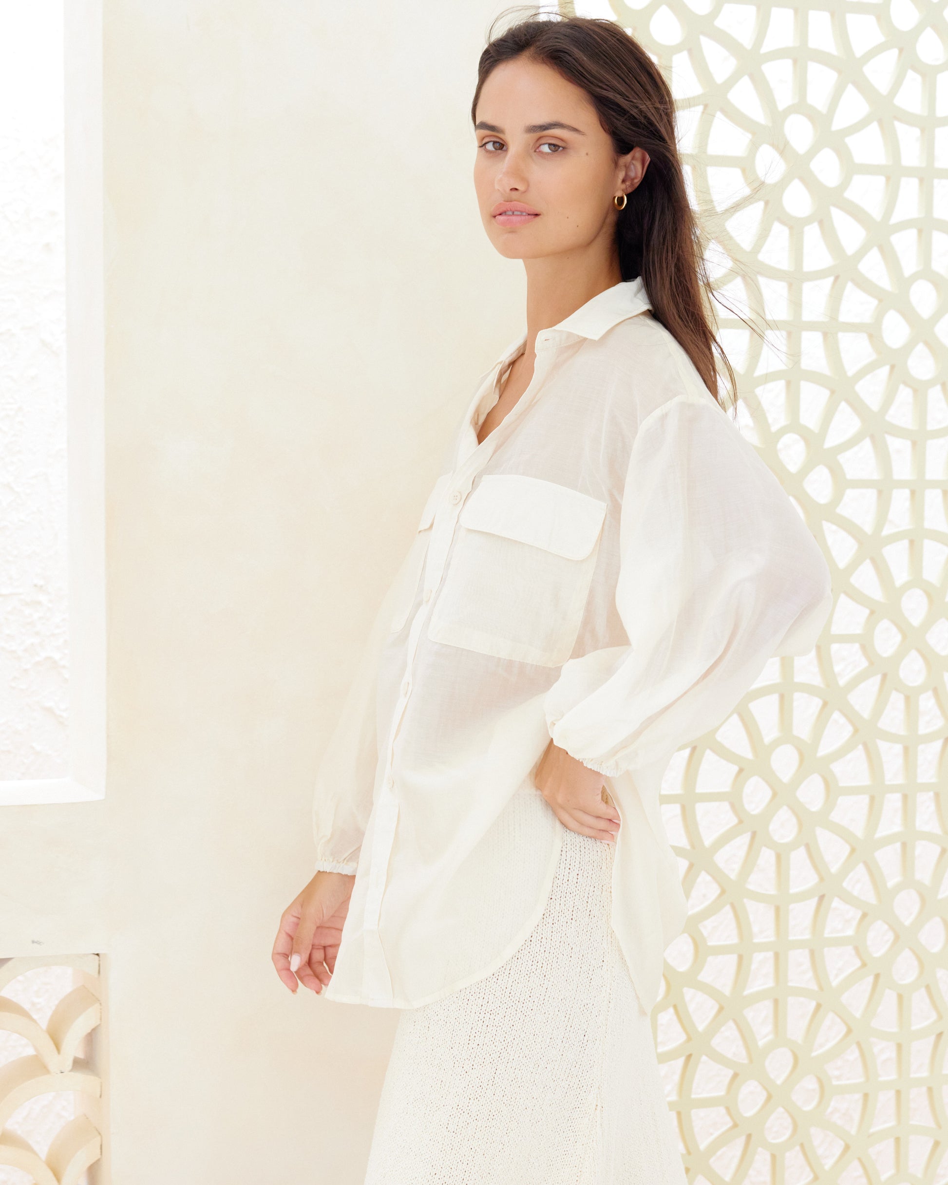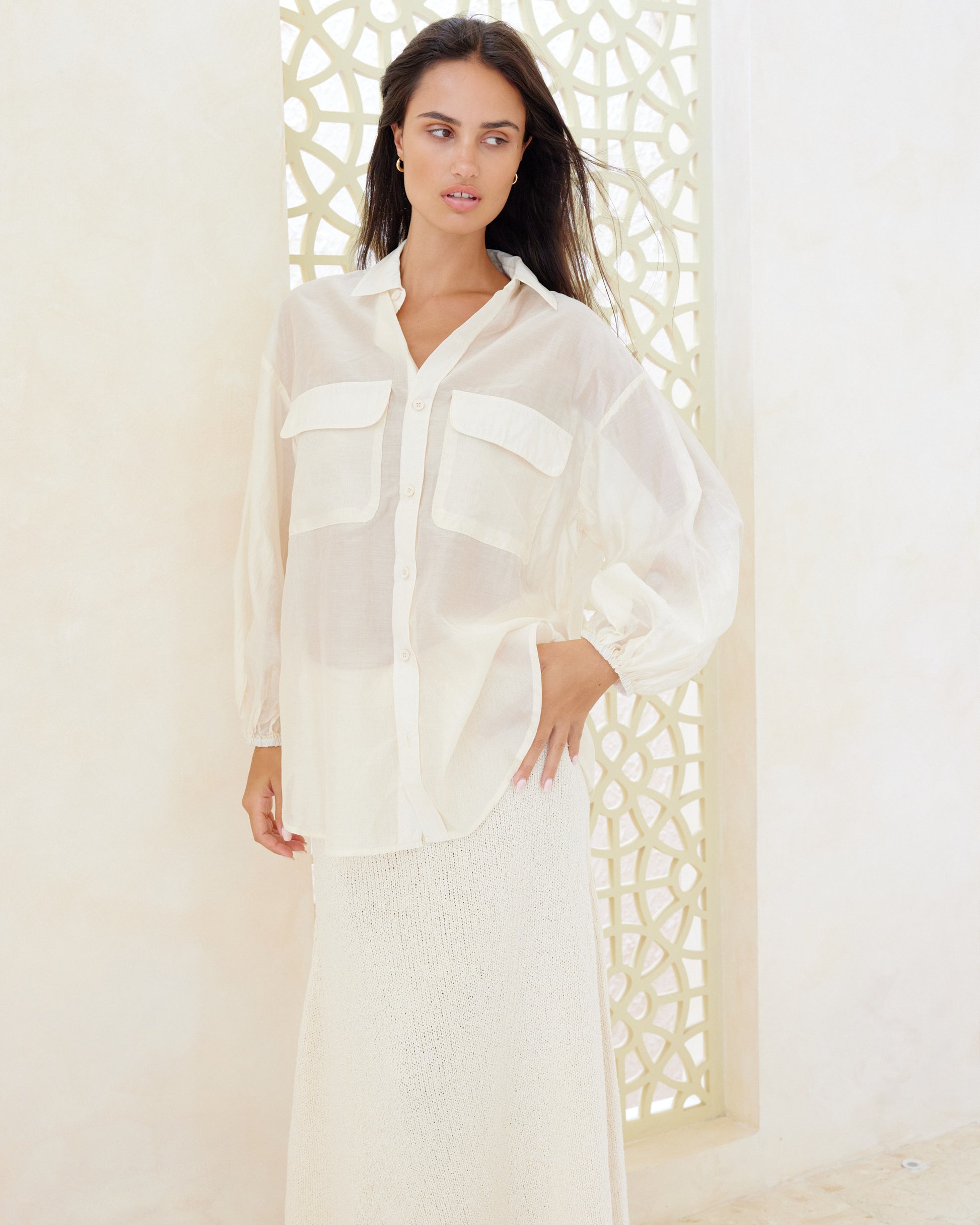 Discover the CHIA LUXE SHIRT crafted from gorgeous luxe lyocell fabric. This breezy shirt features two front pockets and elastic cuffs, letting you wear the sleeves long or scrunch them up into fun, bouncy bubbles.