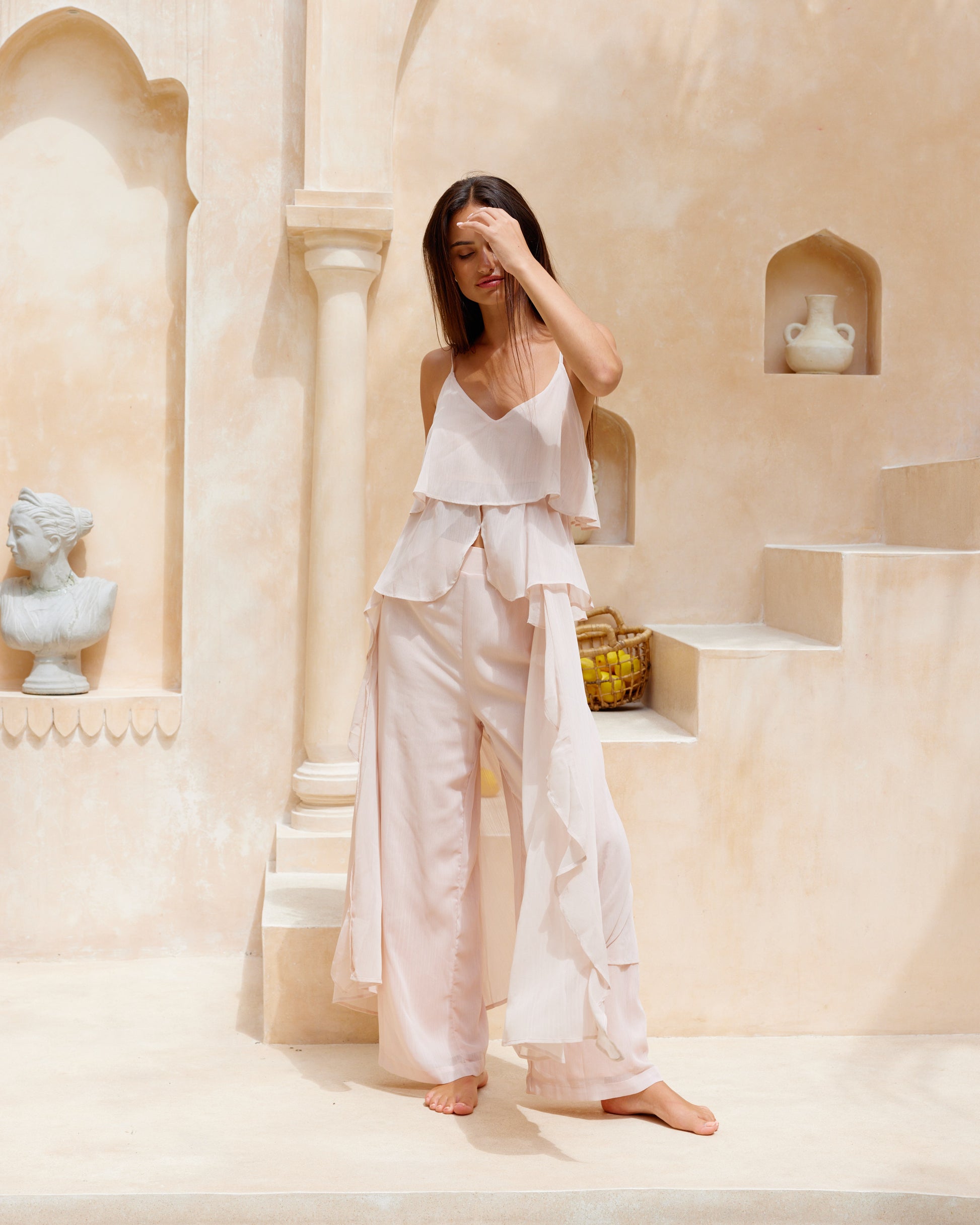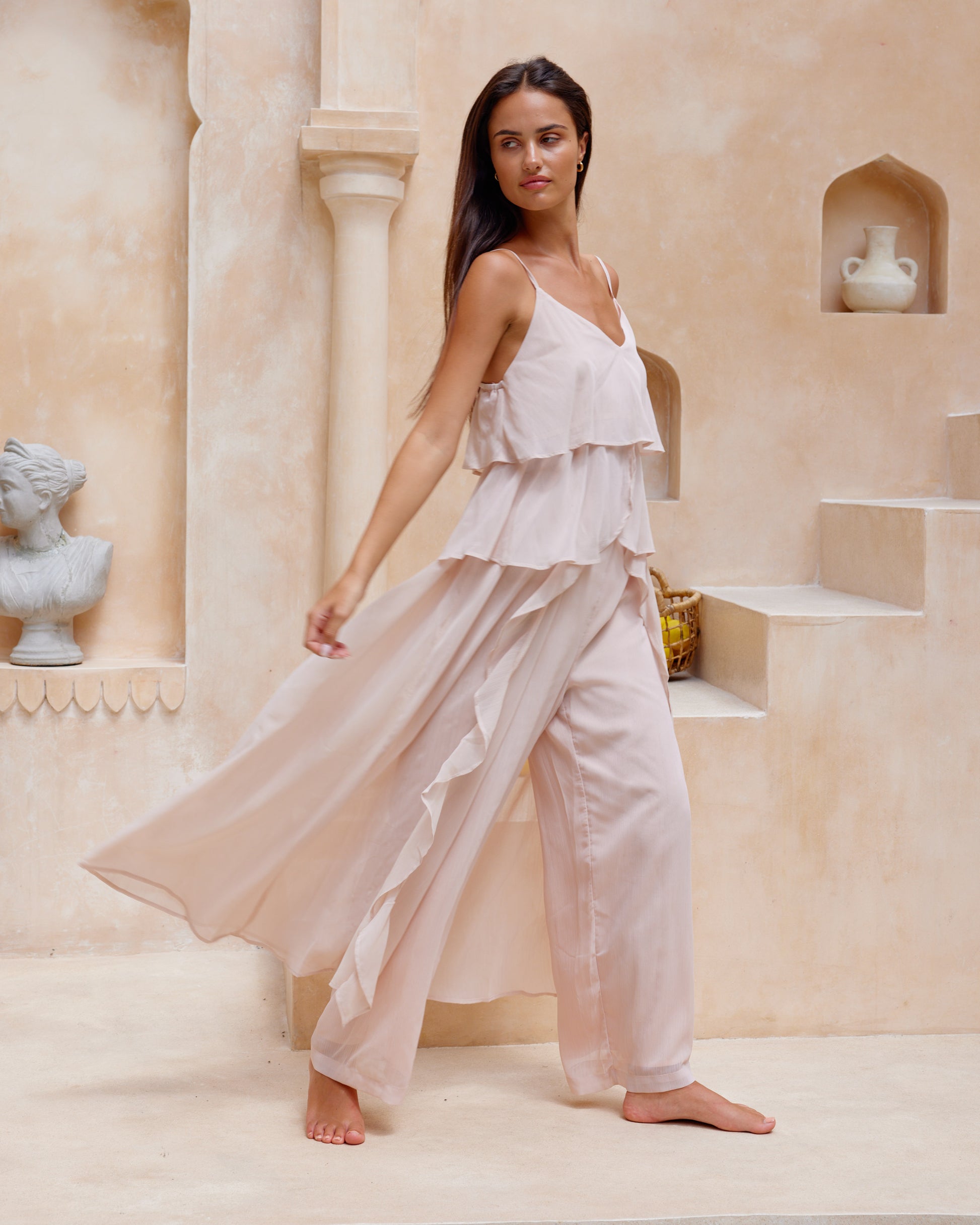 A stunning crepe chiffon hilo top worn over flat-front, fully lined pants with an elasticated back.