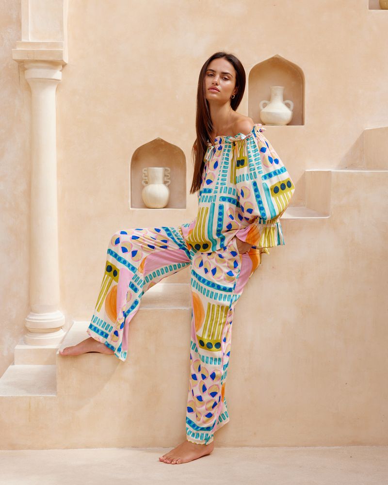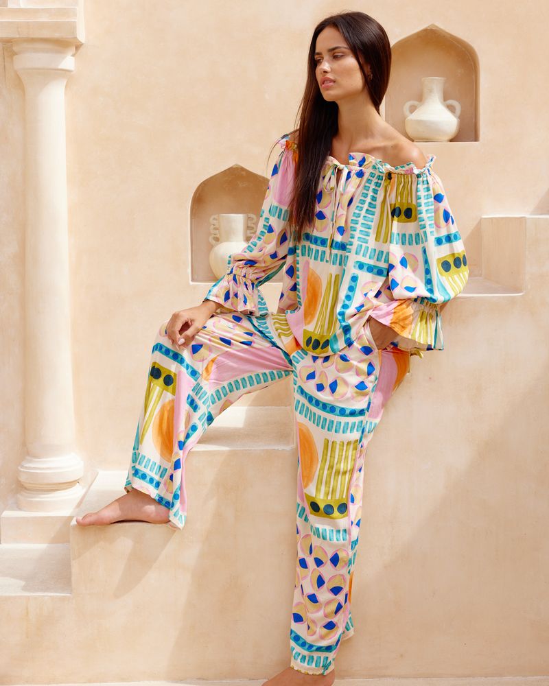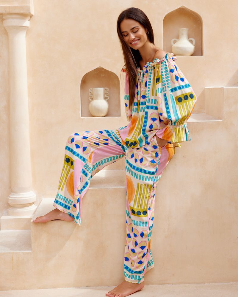 The KAI Pant features an elasticated waistband and convenient pockets. It showcases the exclusive KAI Jatea print on a textured rayon fabric base.