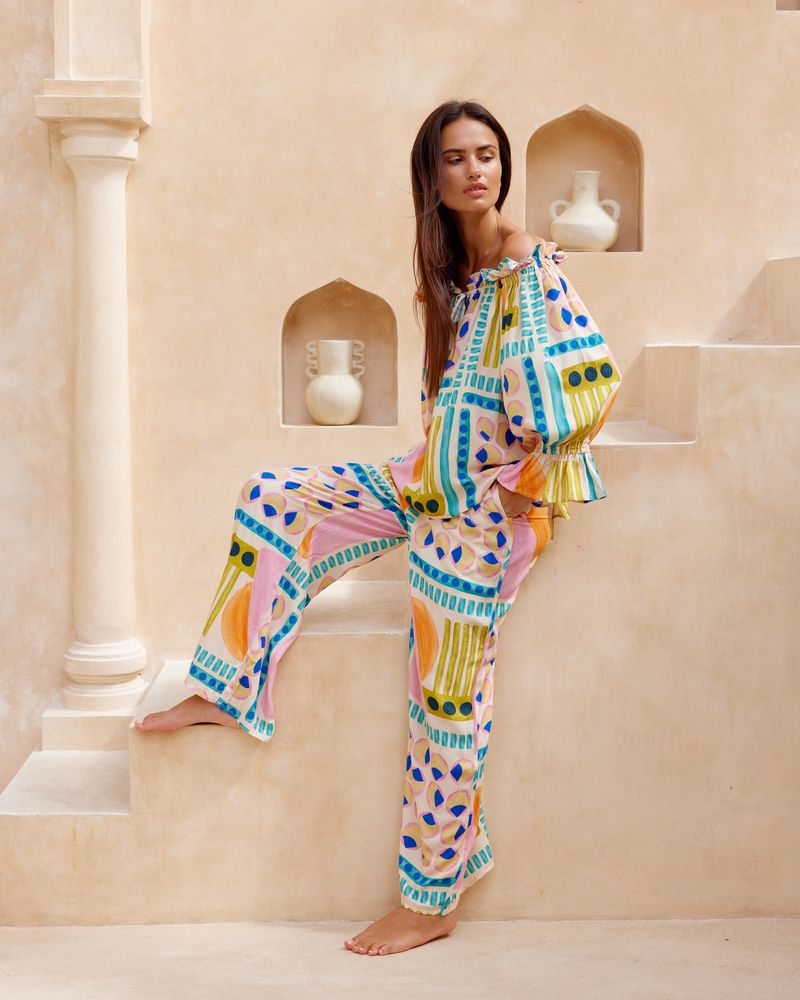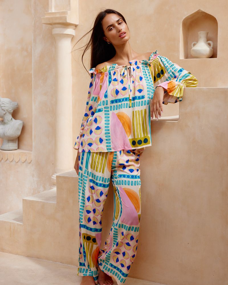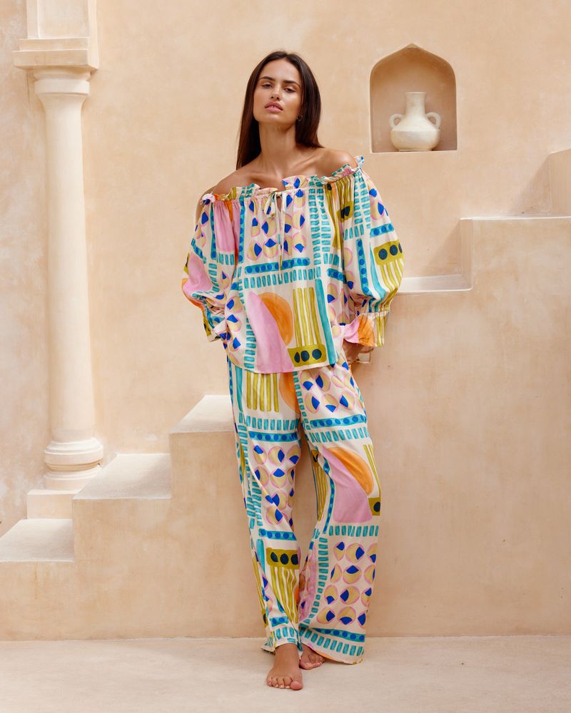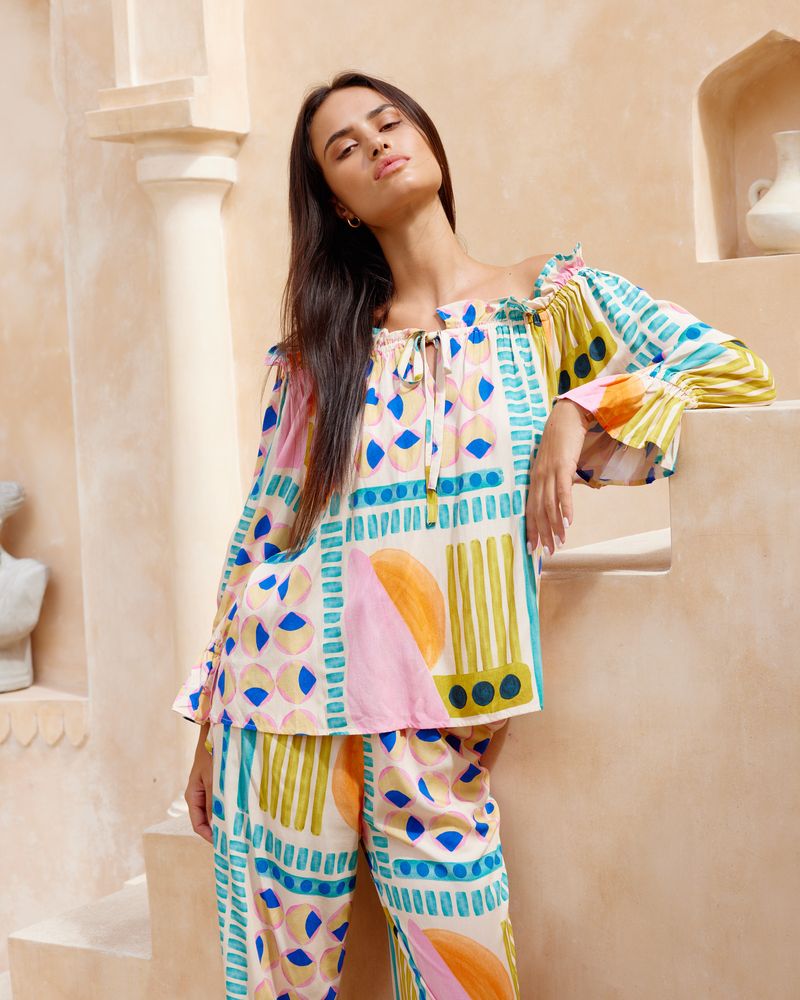 Discover the exquisite KAI Jatea's exclusive print. The textured rayon base of KAI features four distinctive blocks paired with an elegant rami cotton blouse, creating a unique and refined ensemble.