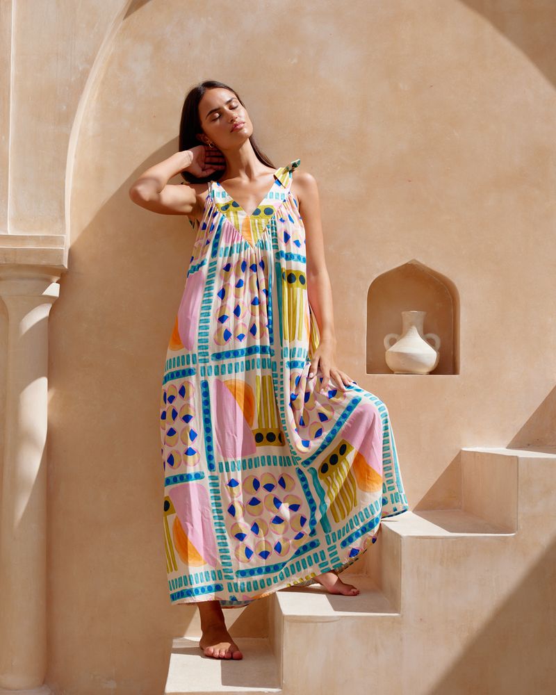 Featuring adjustable tie shoulder straps and a bra-friendly back with pockets, this maxi showcases the exclusive KAI Jatea print. Crafted from a textured rayon base, the Kai includes four distinctive blocks paired with an elegant rami cotton blouse.