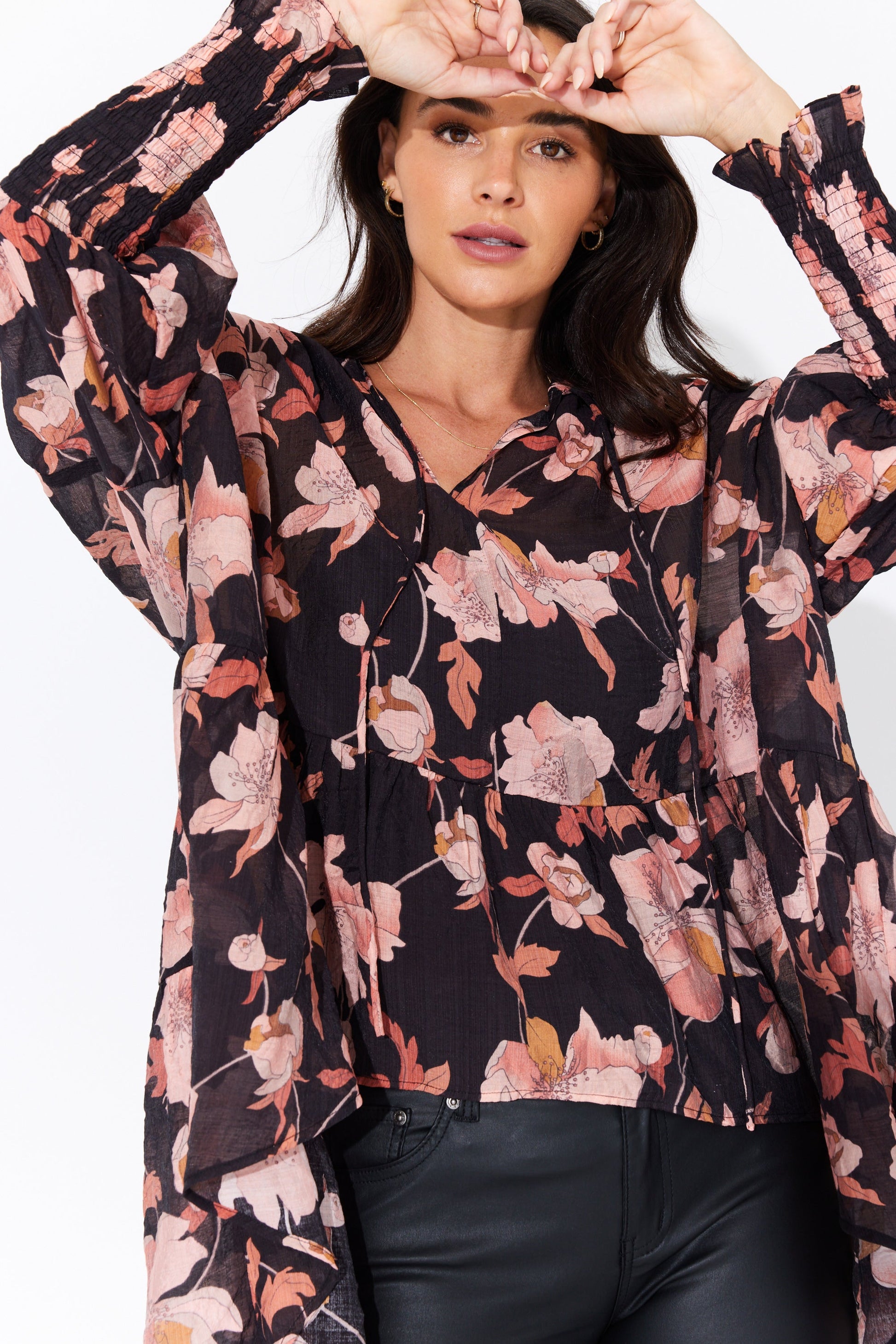 The new take on Mila Blouse, Slight V neckline with tie up, Also featured Jatea new signature sleeve rushed cuff.