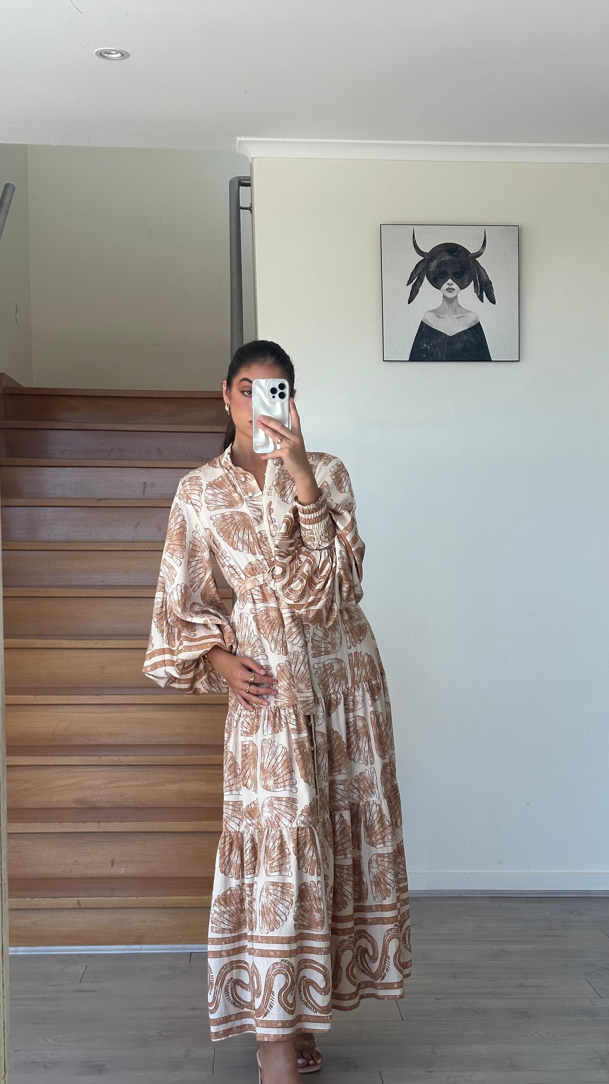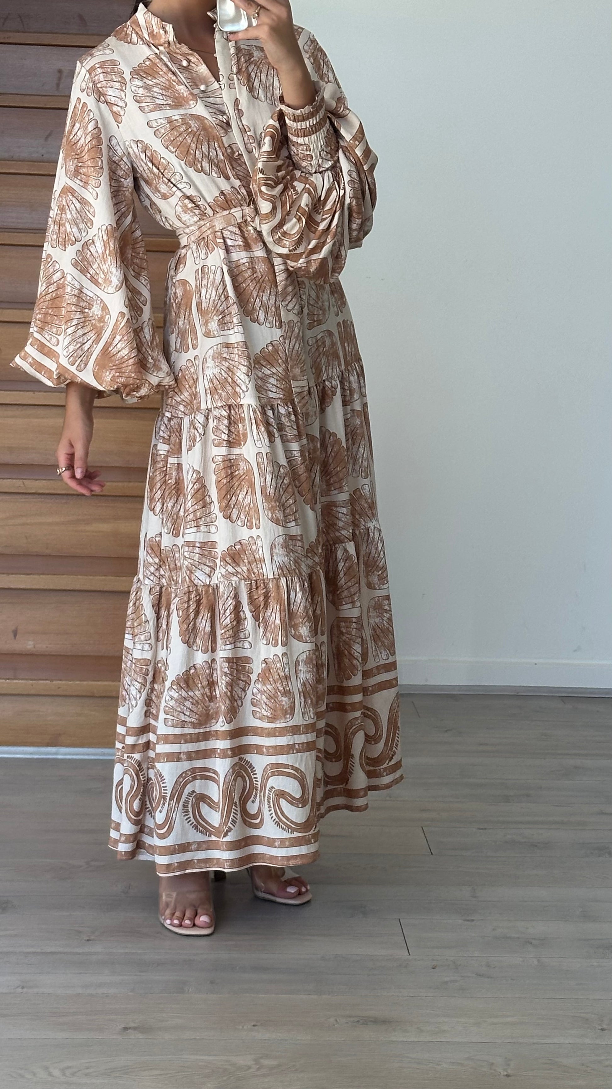 Discover effortless style with SEYCHELLS MAXI. Its beautiful button detail down the front of the dress adds a touch of sophistication. Plus, the adjustable fabric belt with gold detail effortlessly snatches the waistline, giving you a flattering silhouette.