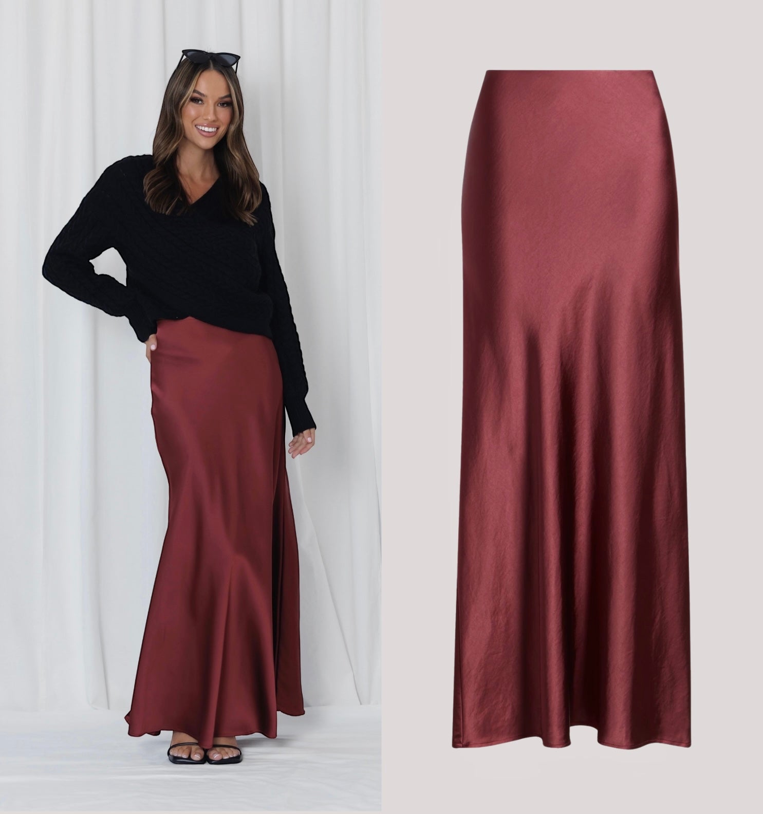 The Rupet Skirt is your new go-to for effortless style. Its smooth satin finish makes it perfect for dressing up, while pairing it back with a cozy knit adds a playful, casual twist. Whether you're headed out for a night or keeping it relaxed, this maxi skirt adapts to your mood with ease.