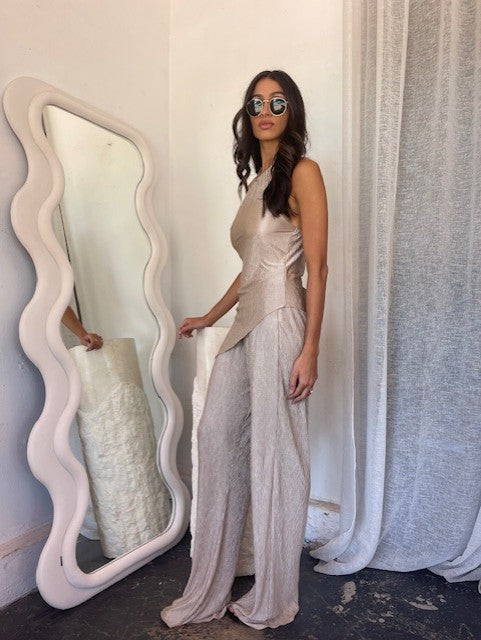 Introducing our ZALI PANT - the perfect combination of style and comfort. Featuring a pleated design and elastic waist, this wide leg pant is sure to elevate your fashion game. Complete the look with our matching halter top.
