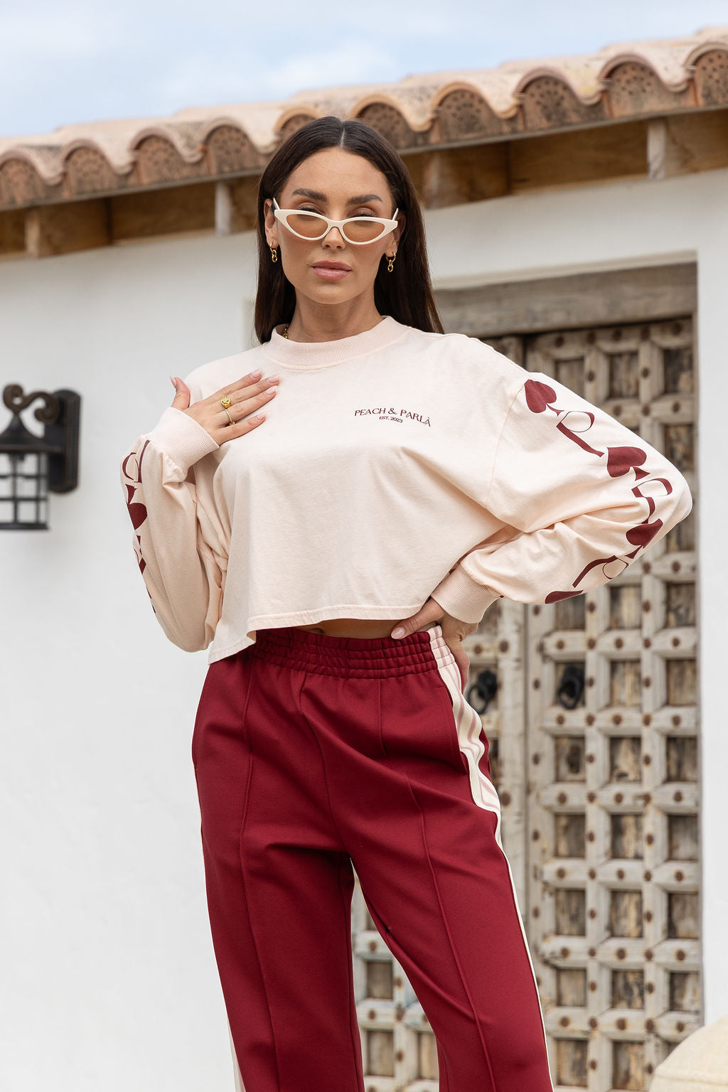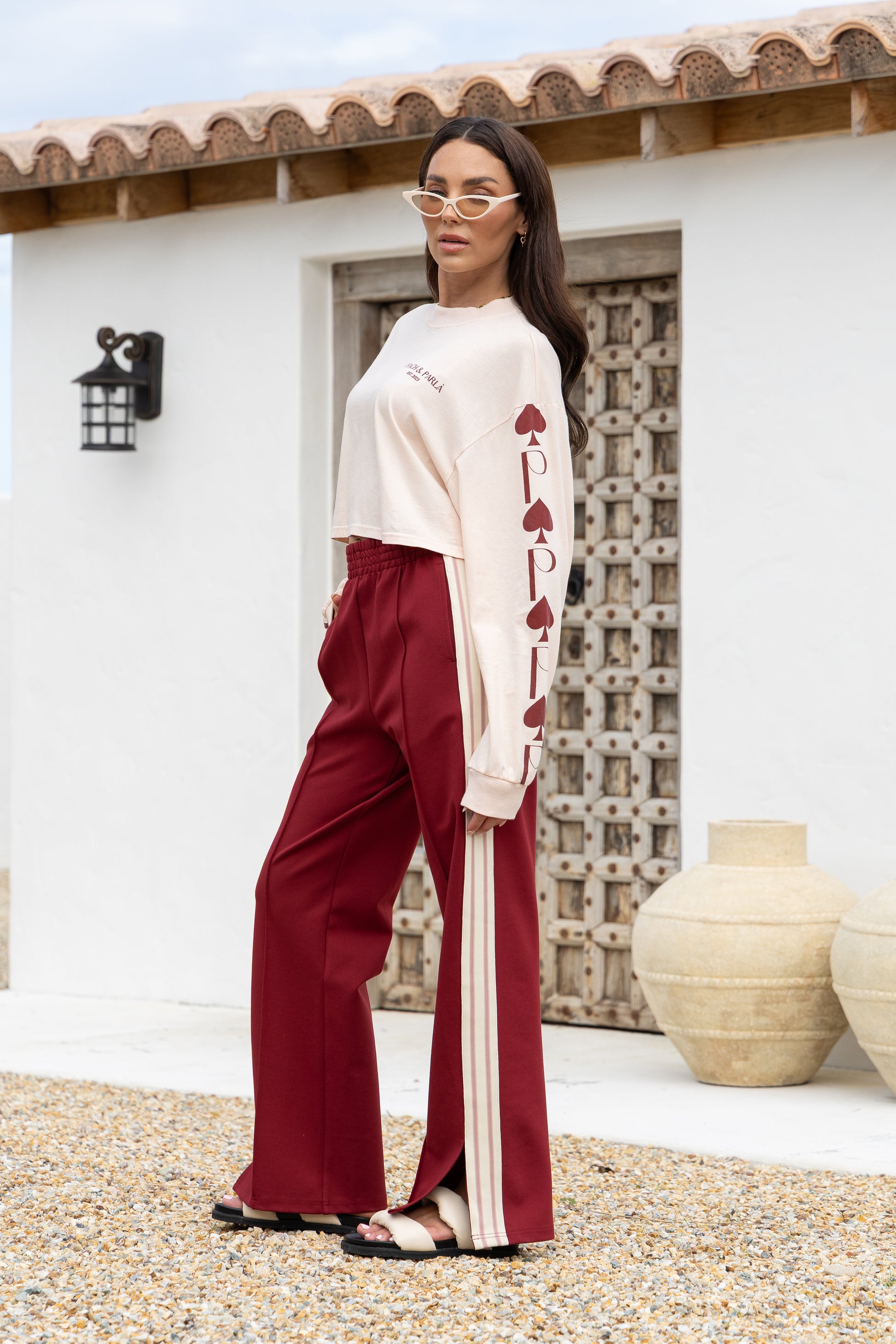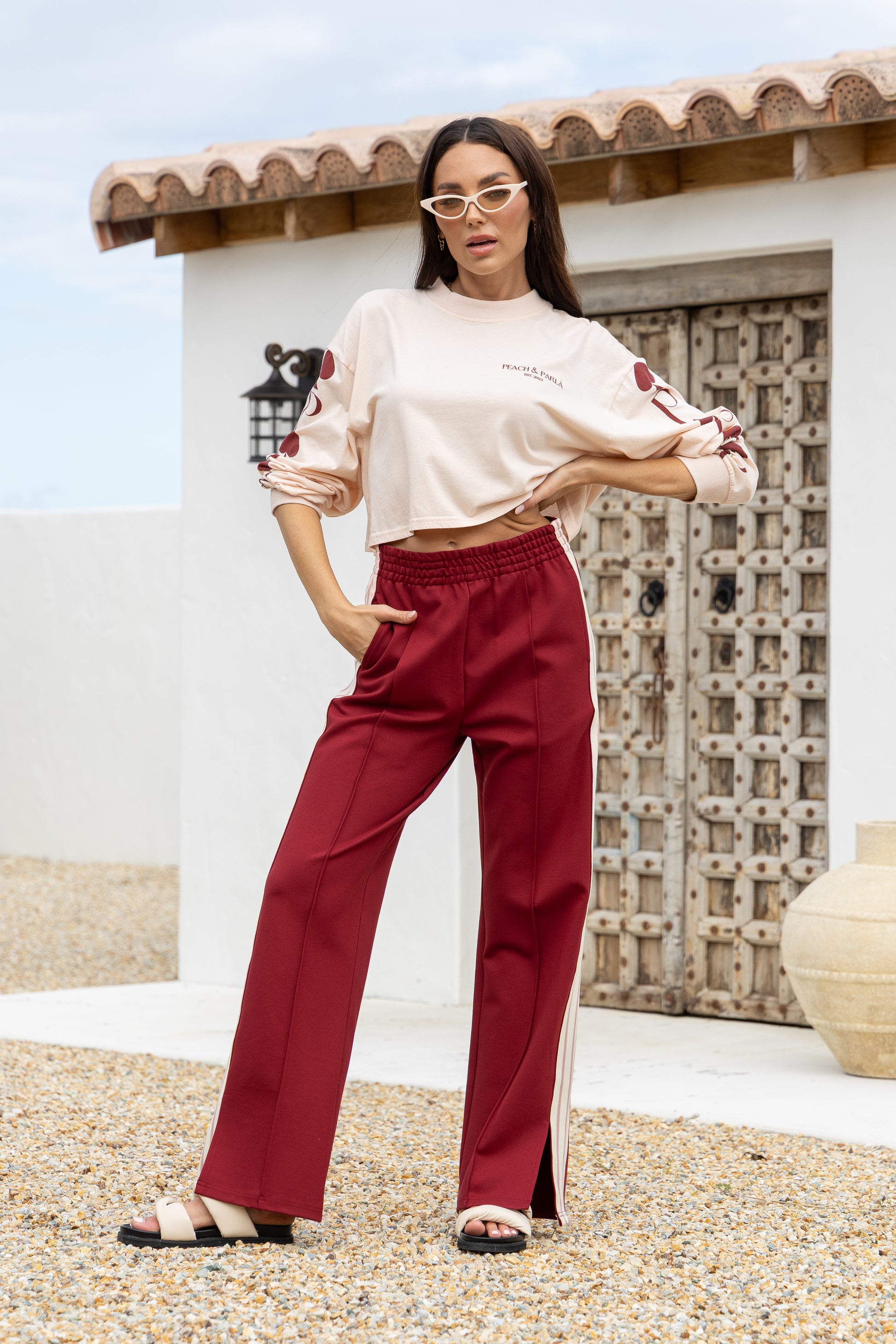 This burgundy Ponti racer pant features a pull-on design, accented with pale pink cream side tape and a subtle bottom side split for added style and comfort.