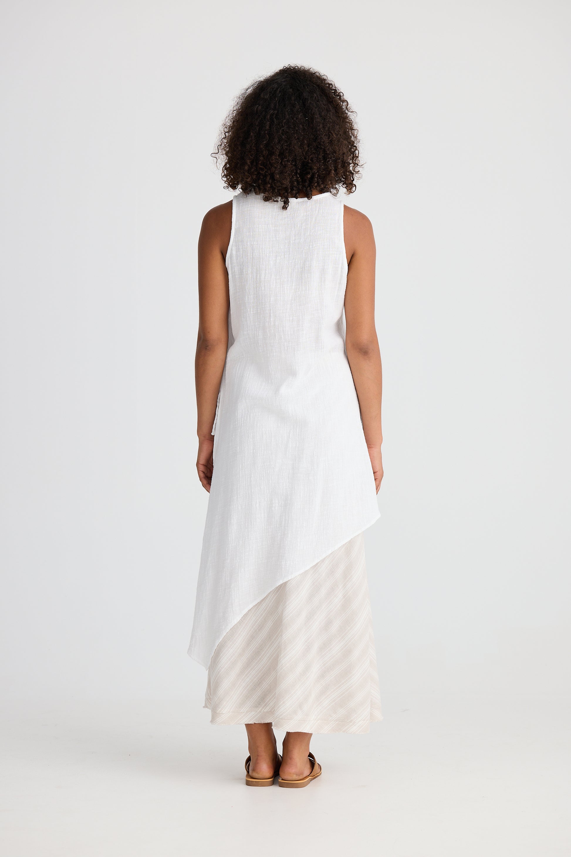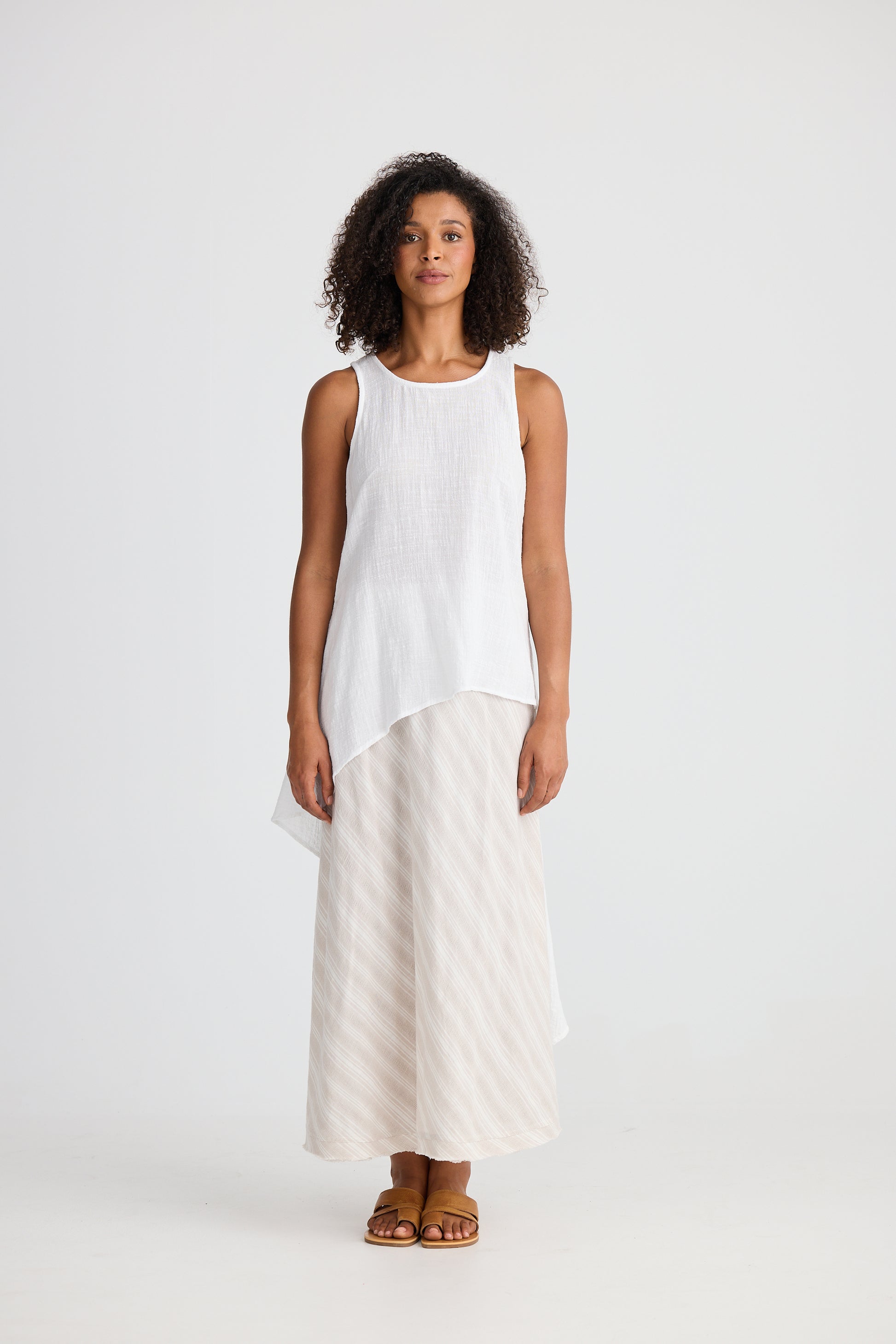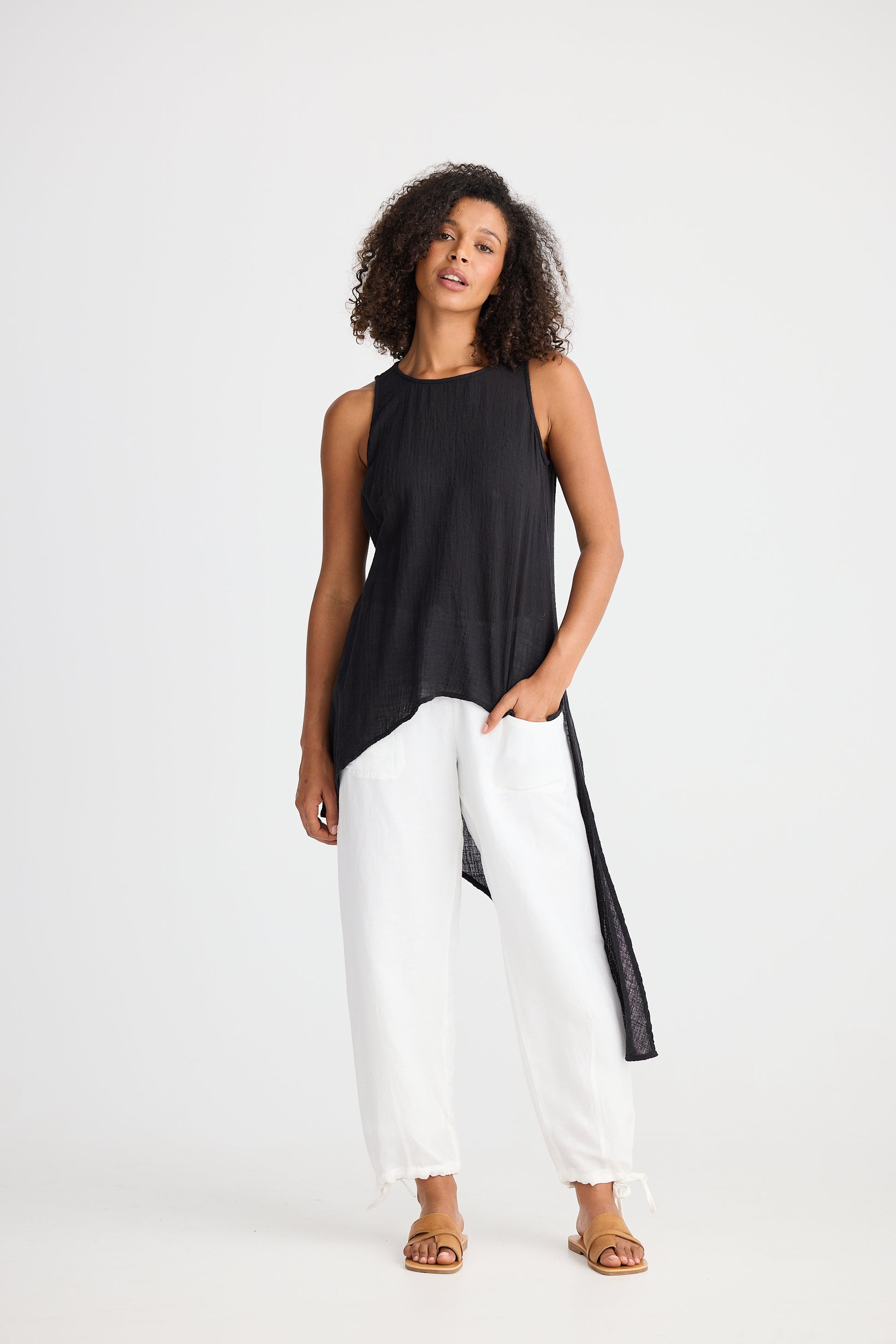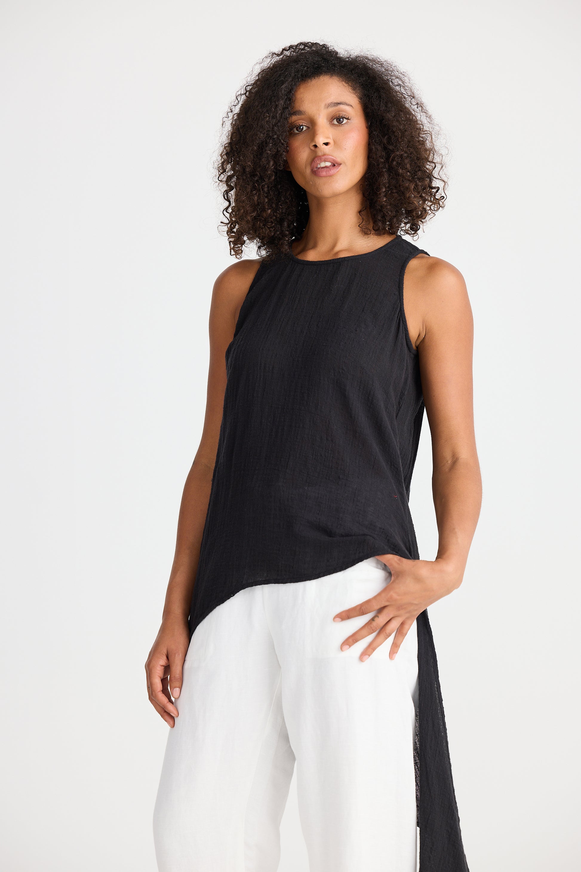 The Sicily Singlet is crafted from natural crinkle cotton, offering a lightweight and breathable texture ideal for warm weather. Its round neckline provides a classic, flattering fit, while the asymmetrical high-low hem adds a modern, stylish edge to your outfit. Perfect for layering or wearing alone, this singlet combines comfort with contemporary design, making it a versatile addition to any wardrobe. The natural fabric ensures softness against the skin and easy care, suitable for everyday wear or casual outings.