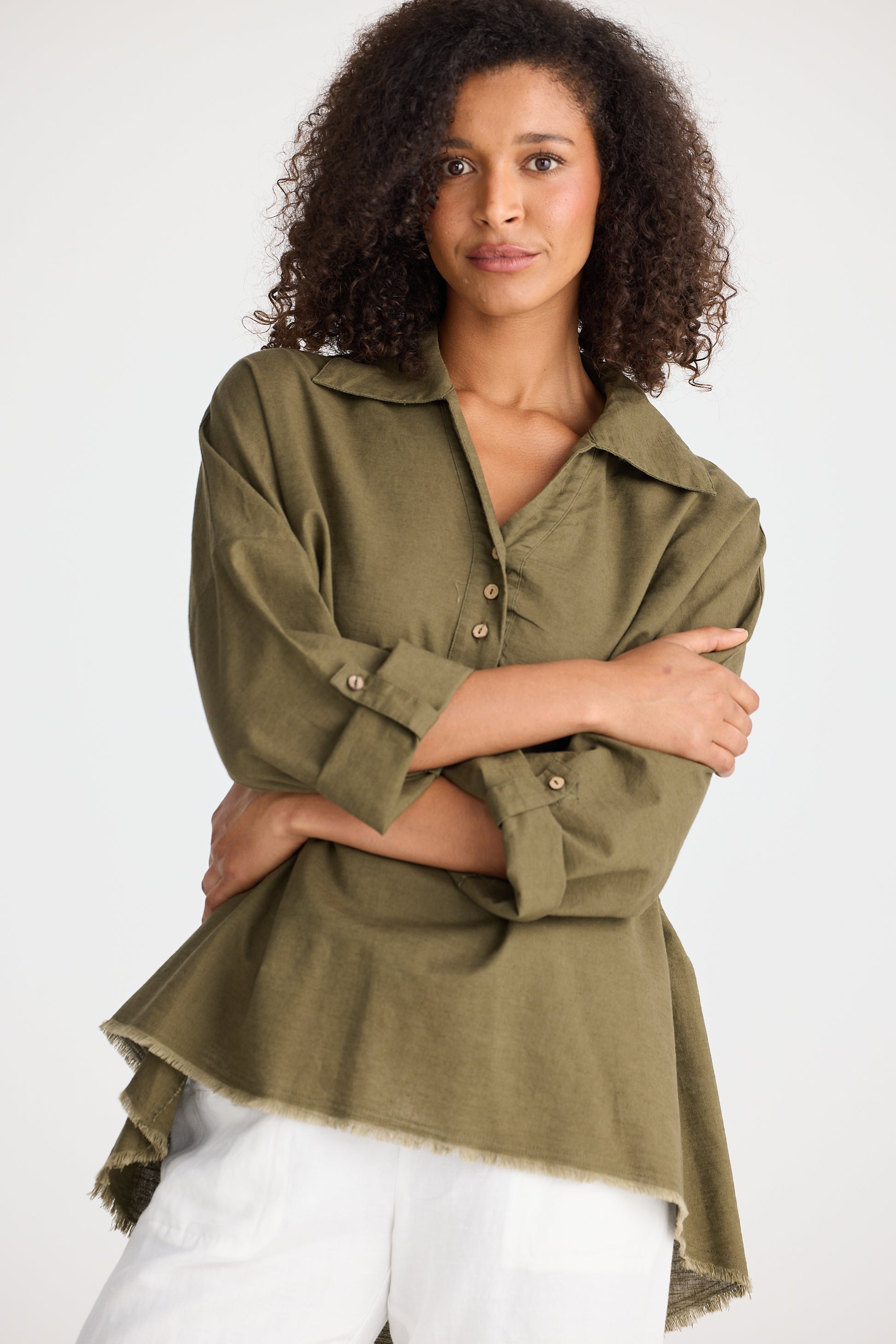 Stay stylish and comfortable with the Shanty Amar Shirt. This shirt features a roll collar with a half placket, gathered elastic at the back waist, and rolled-up sleeves with a securing tab. Its boxy fit adds a touch of modernity to your wardrobe.