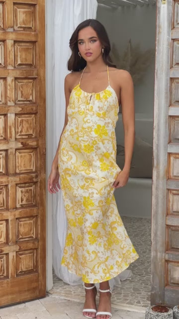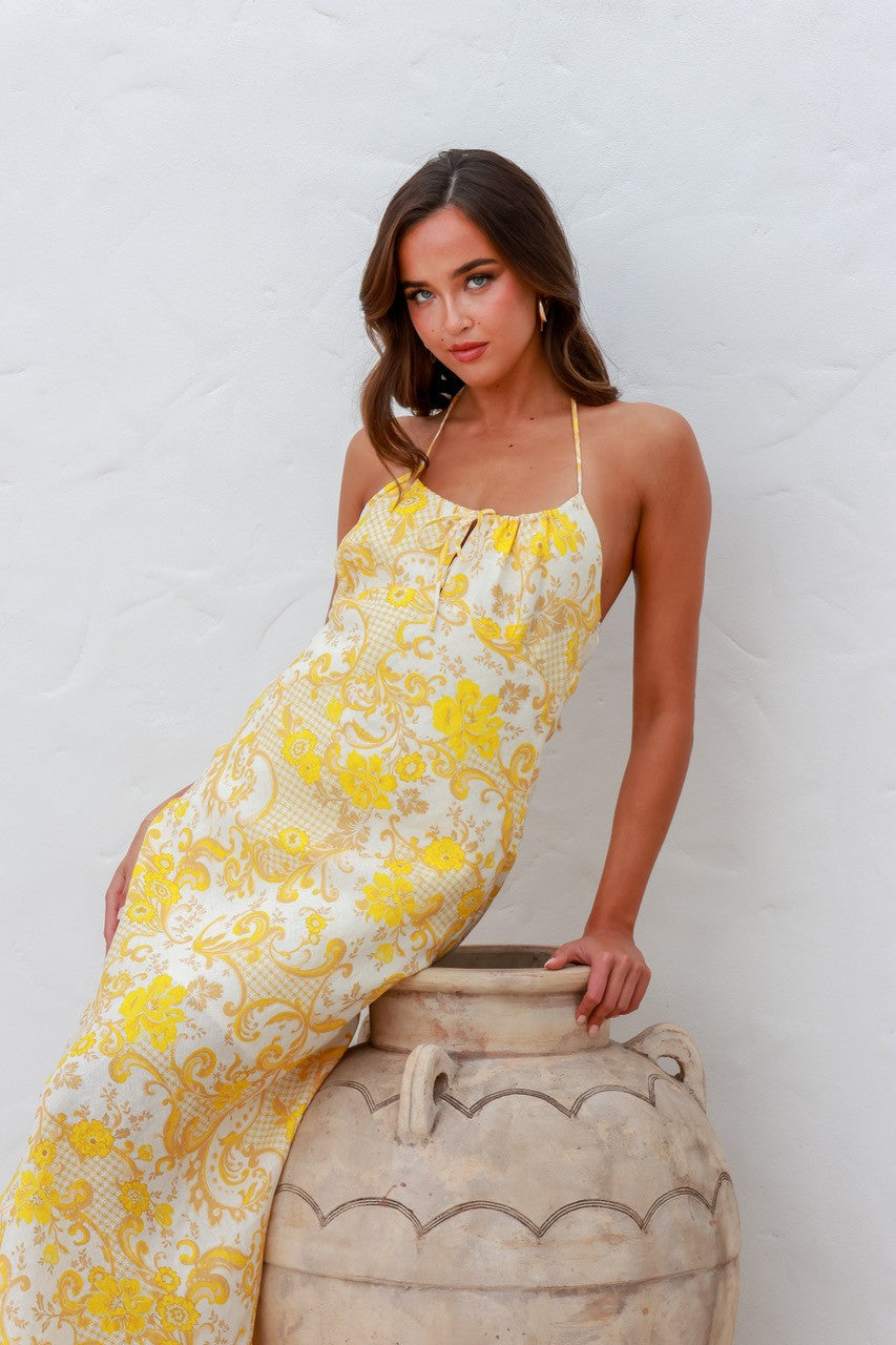 Made in Australia, this midi-length dress is expertly designed with a slim fit and a bias cut, featuring a beautiful floral motif print. The bust keyhole feature, adjustable ties, and side invisible zip add unique touches to this elegant 100% linen dress.