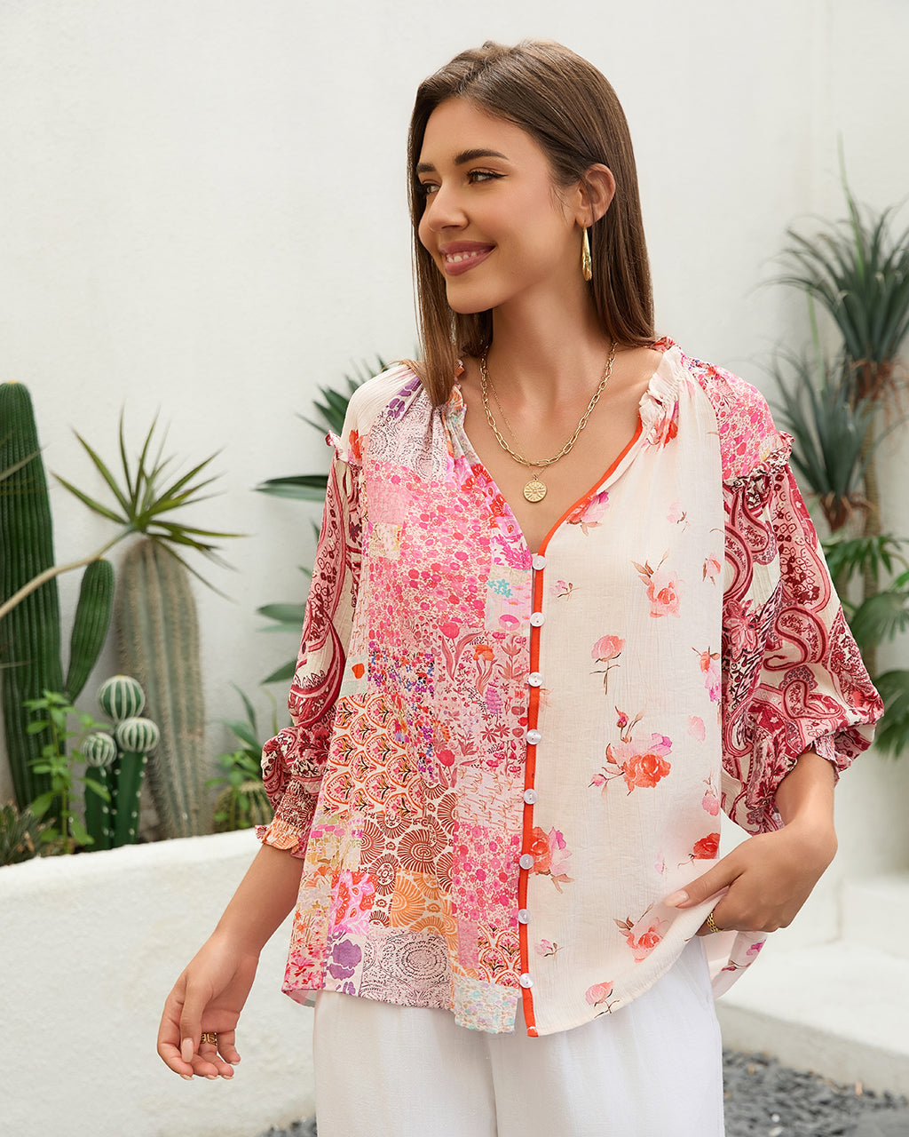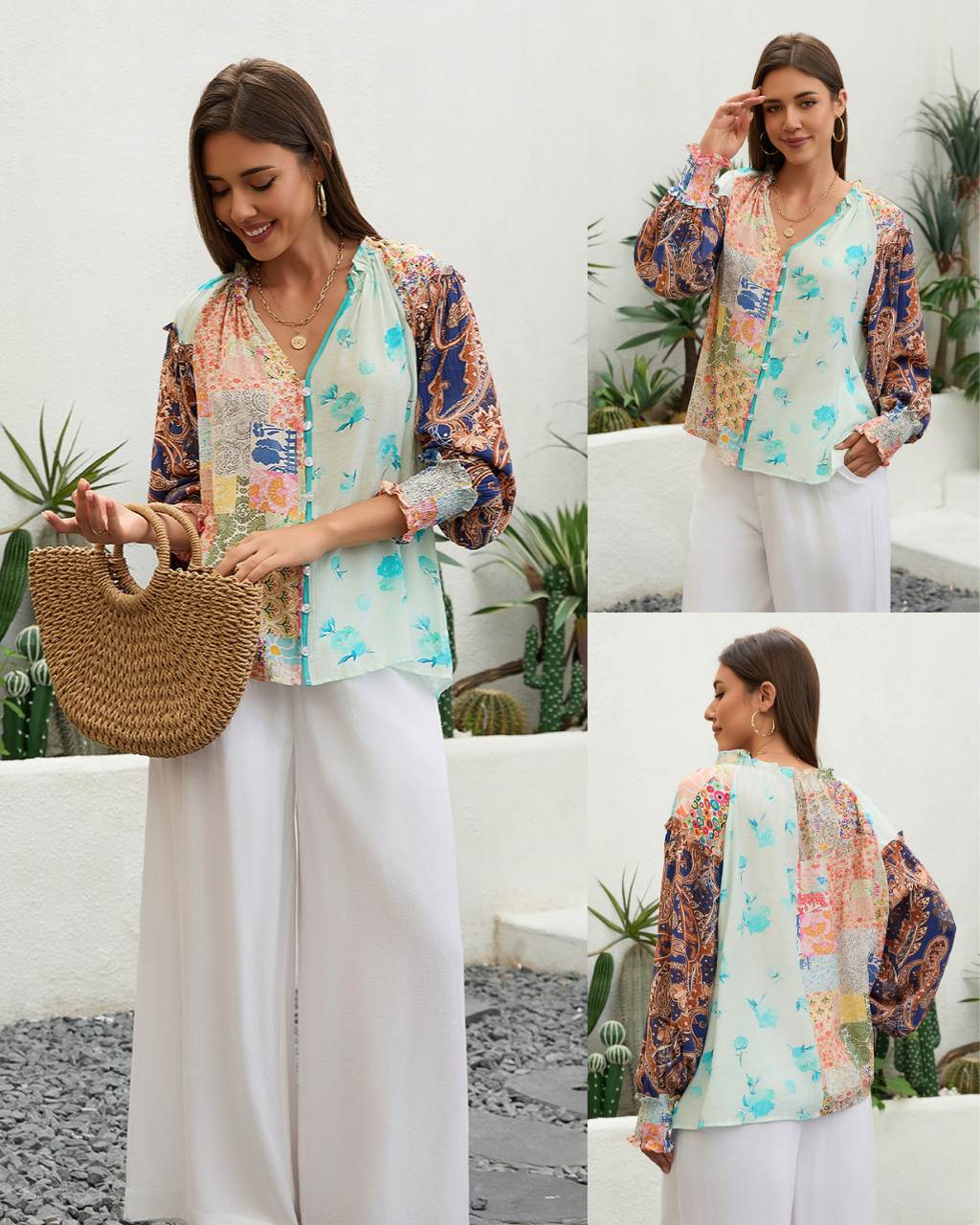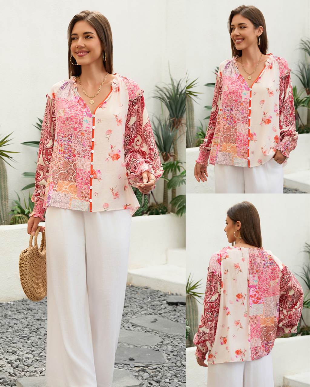 The Layla top showcases a V-neckline adorned with elegant buttons along the front. It includes a relaxed sleeve design finished with a gathered cuff. This flowing top complements the silhouette beautifully.