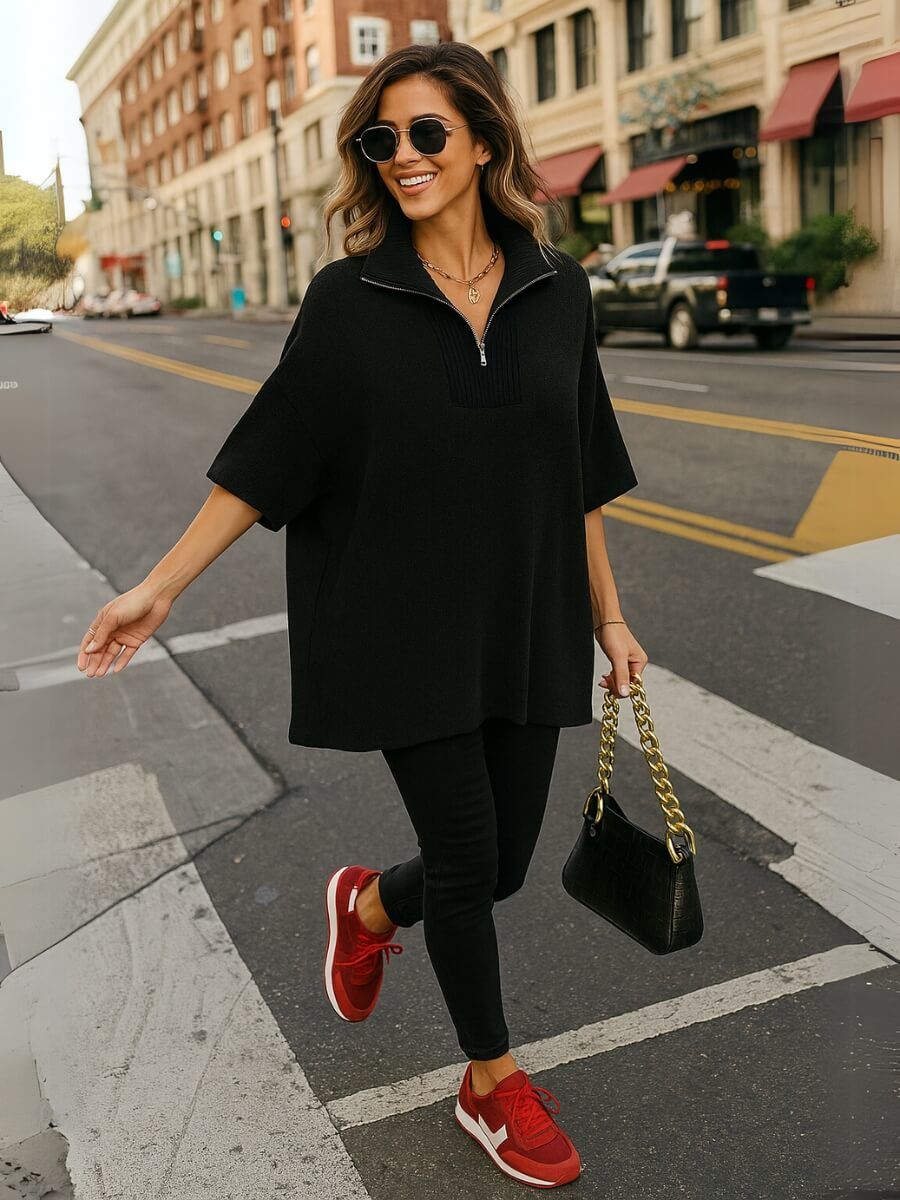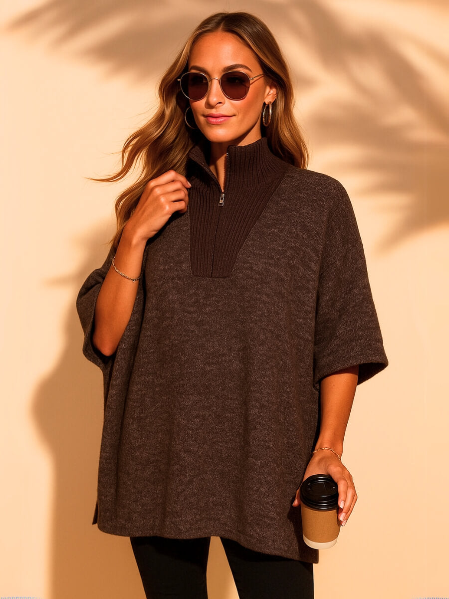 This knit top features a sophisticated poncho-style design, combining comfort with modern elegance. Crafted with a soft, breathable fabric, it offers a relaxed fit that drapes beautifully over the body. The zip-up V-neck adds a versatile touch, allowing you to adjust the neckline for different looks and enhanced comfort. Ideal for layering or wearing on its own, this top seamlessly blends style and functionality, making it a refined addition to any wardrobe. Perfect for both casual and polished outfits, it delivers effortless chic with expert craftsmanship.