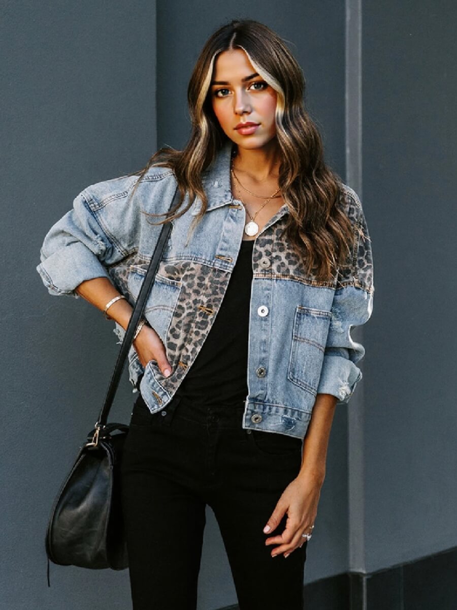 The Leo denim jacket features stylish distressed details and is accented with a distinctive leopard print patch.