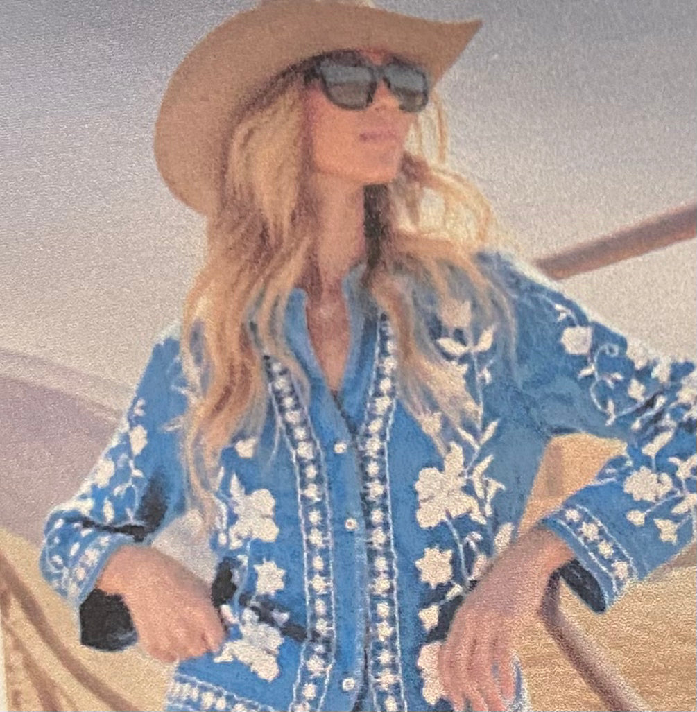 The Zara top is your new wardrobe essential, crafted in the most gorgeous soft blue denim that feels as good as it looks. What really makes this piece special is the whimsical embroidered floral pattern dancing across the fabric—it's like wearing a little garden of delicate blooms. Perfect for adding a touch of charm to your everyday style, whether you're dressing it up with tailored trousers or keeping it casual with your favorite jeans. The playful floral detailing catches the light beautifully, making this top a conversation starter that brings joy to any outfit. Versatile, charming, and undeniably fun.