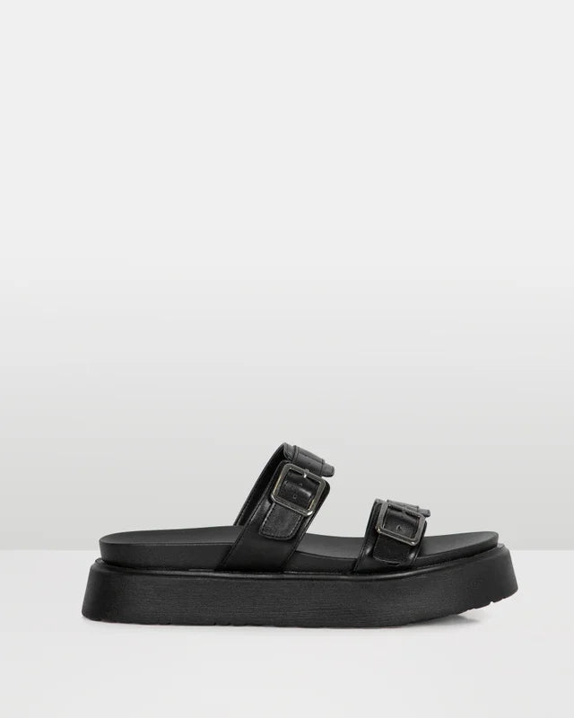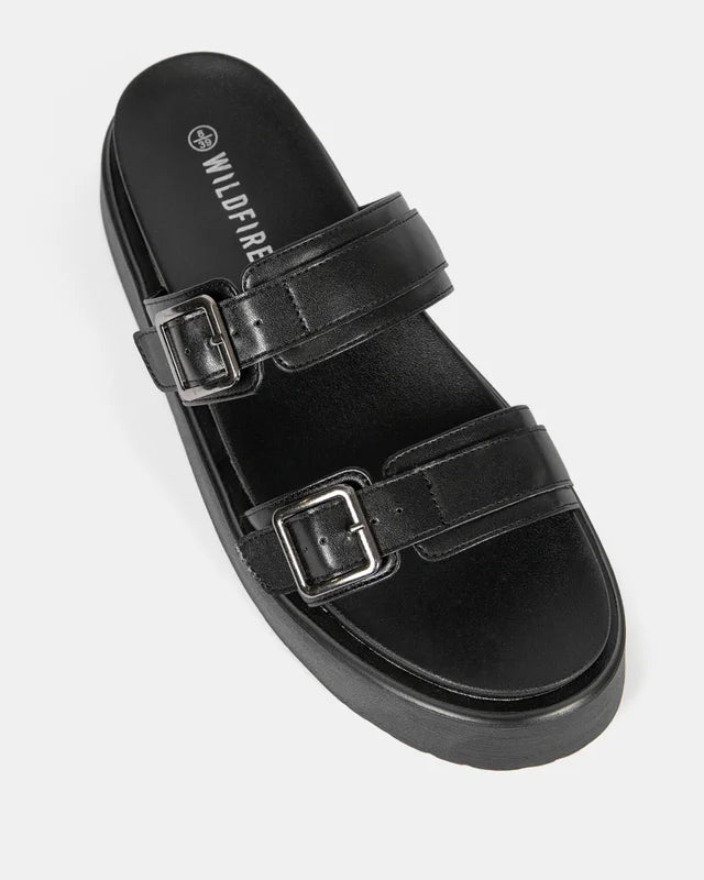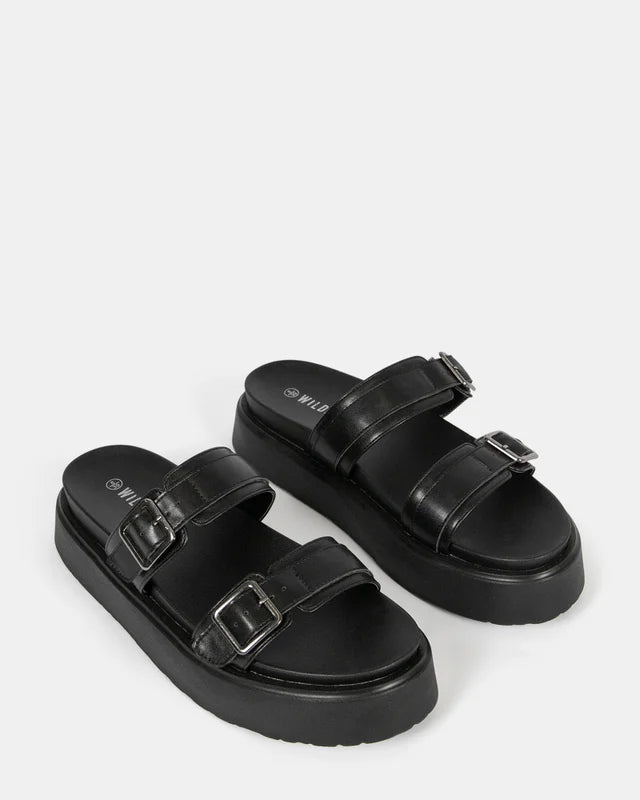 Get ready to rock in Stone! This slide offers a chunky, platform sole providing the perfect balance of comfort and fashion. These versatile slides will pair effortlessly with any outfit, featuring two thick top straps, each with a silver buckle detail for a cool, edgy look! Stone slips on and off with ease making it perfect for everyday wear. Add a pair of Stone to your wardrobe today!