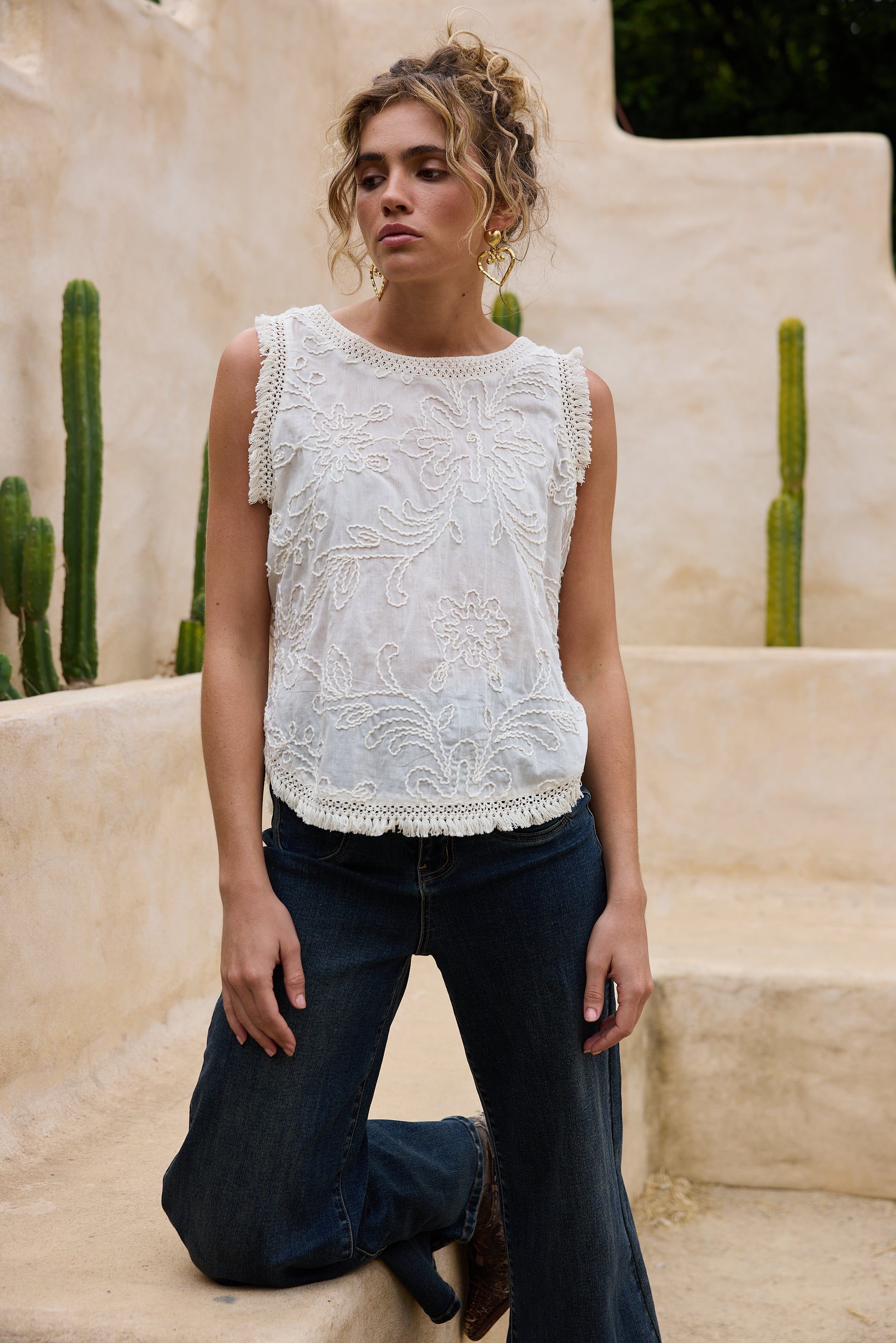 The Chantilly top is a sleeveless top with a lace fringe detail along the armhole and hem. Its a regular fit embroidered cotton fabrication.