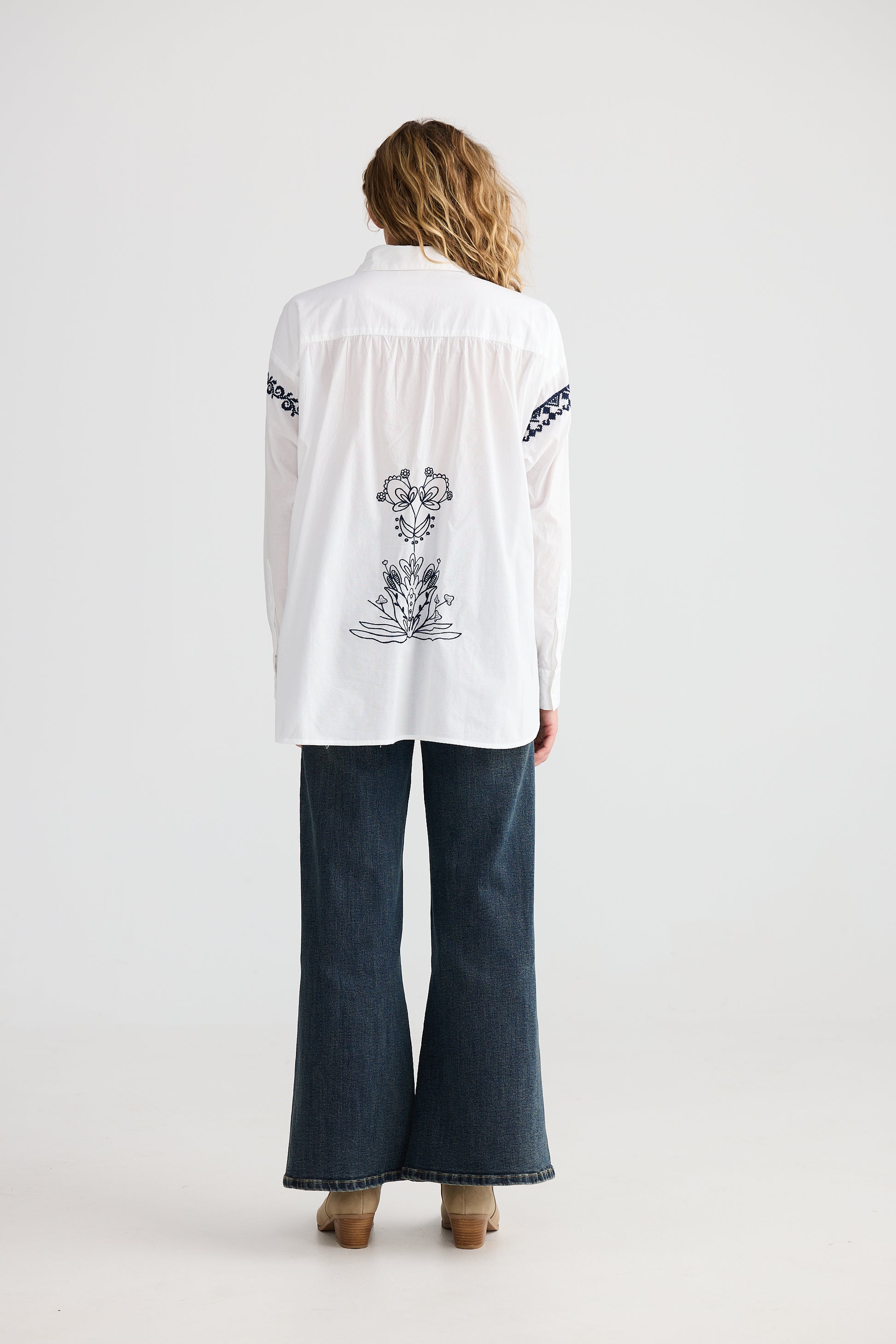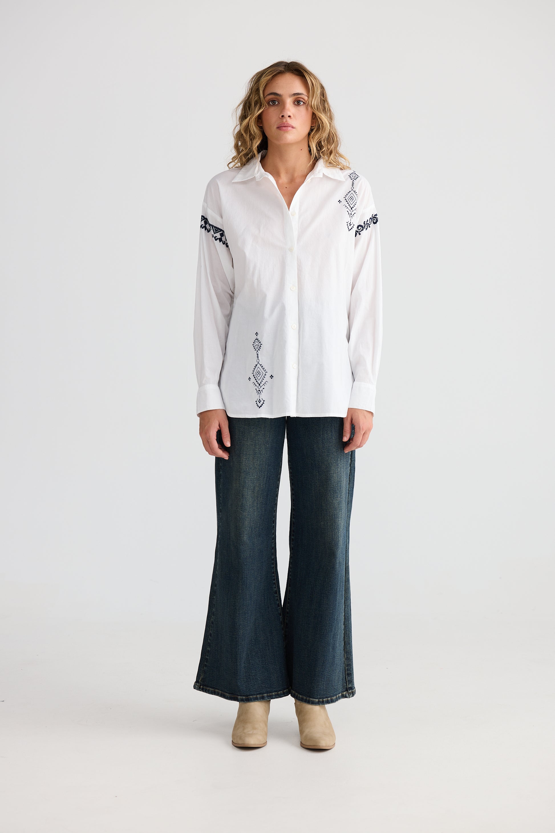 Bring a burst of fun to your wardrobe with the SALSA SHIRT, featuring a classic shirt collar and button-through front for easy wear. Its oversized fit ensures comfort and a relaxed vibe, while the curved hem adds a stylish twist to your everyday look. The contrast feature embroidery provides a quirky pop of detail that sets this shirt apart. Perfect for dancing through your day with playful style and a carefree spirit.