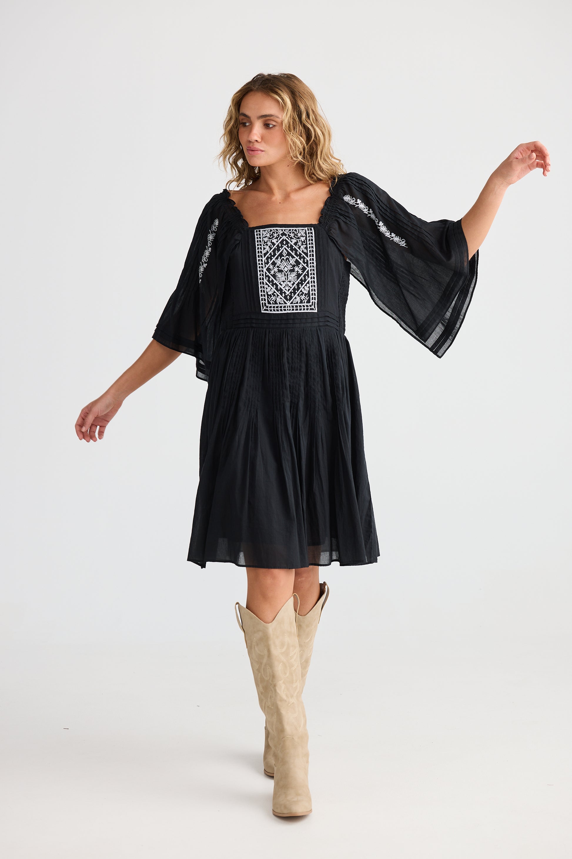 This playful mini dress features a chic square neckline and fluttery cape sleeves. Shirred details gather at the shoulders and sides, while pintuck accents add charm to the sleeves, bodice, and skirt. A contrasting embroidered design decorates the front bodice, and the dress is fully lined for comfort at mini length.