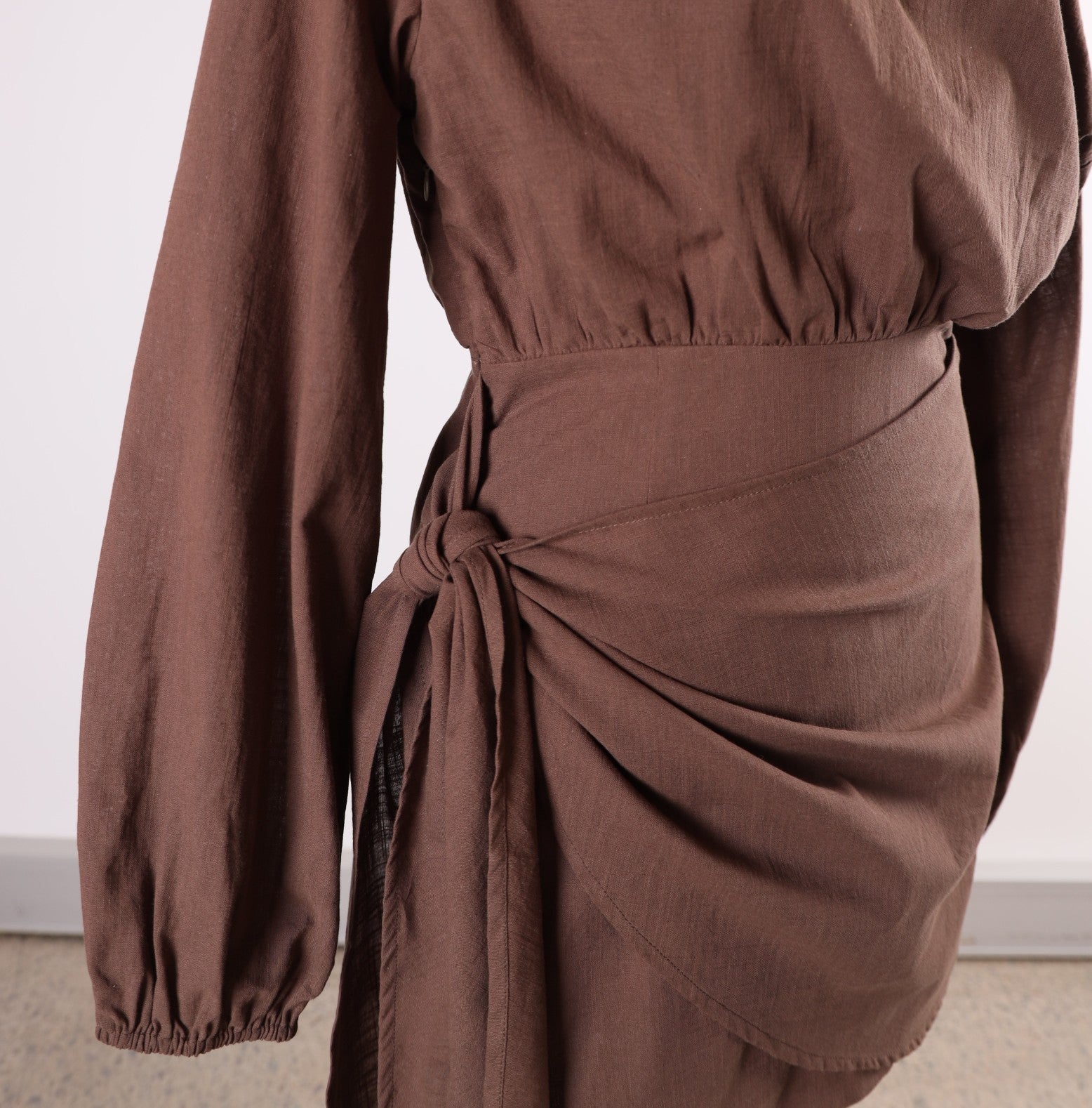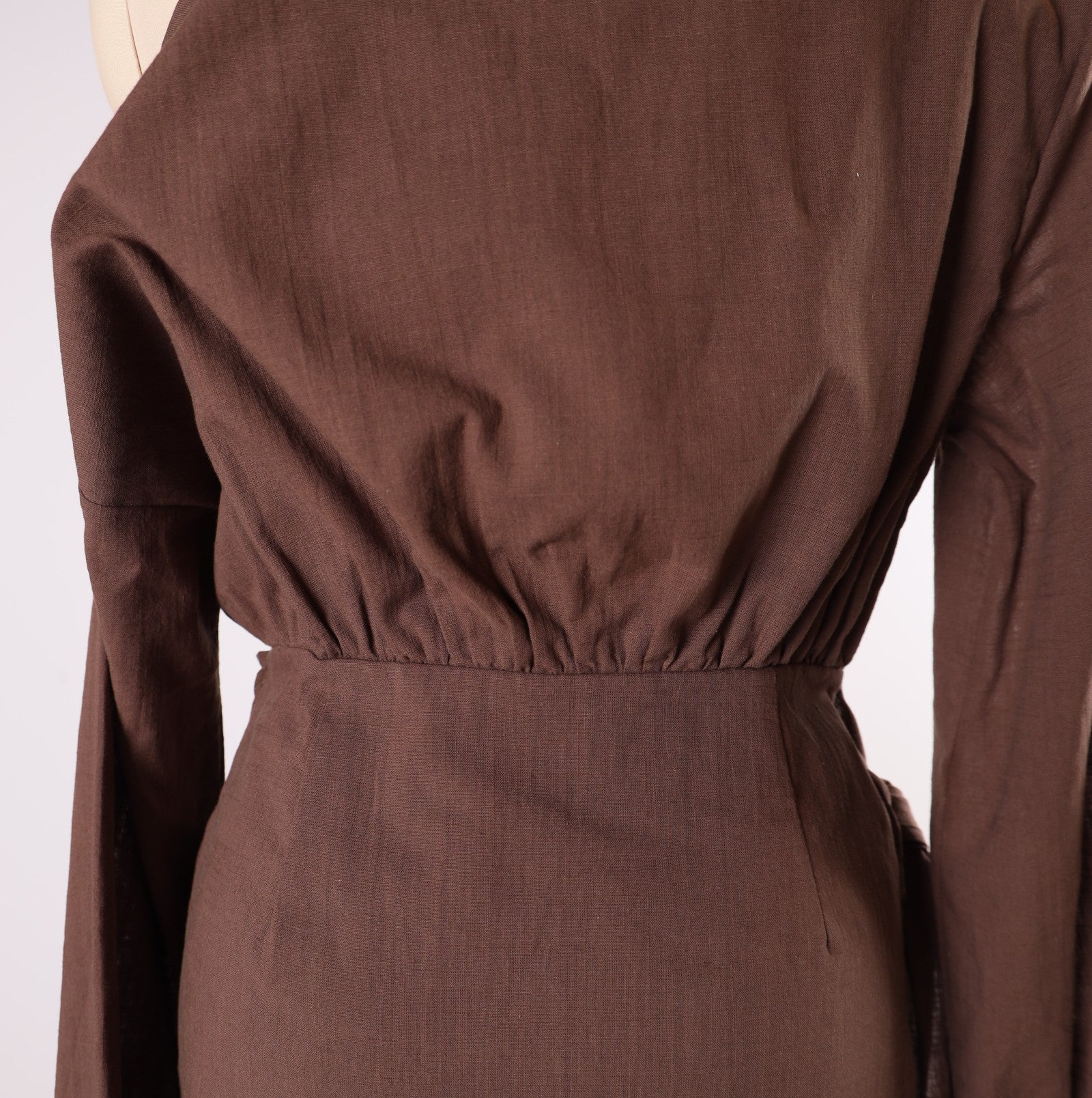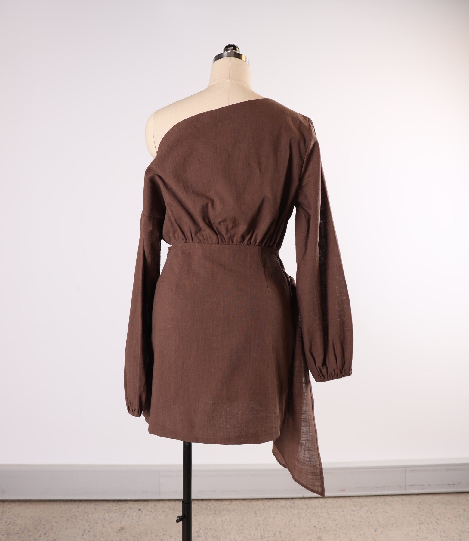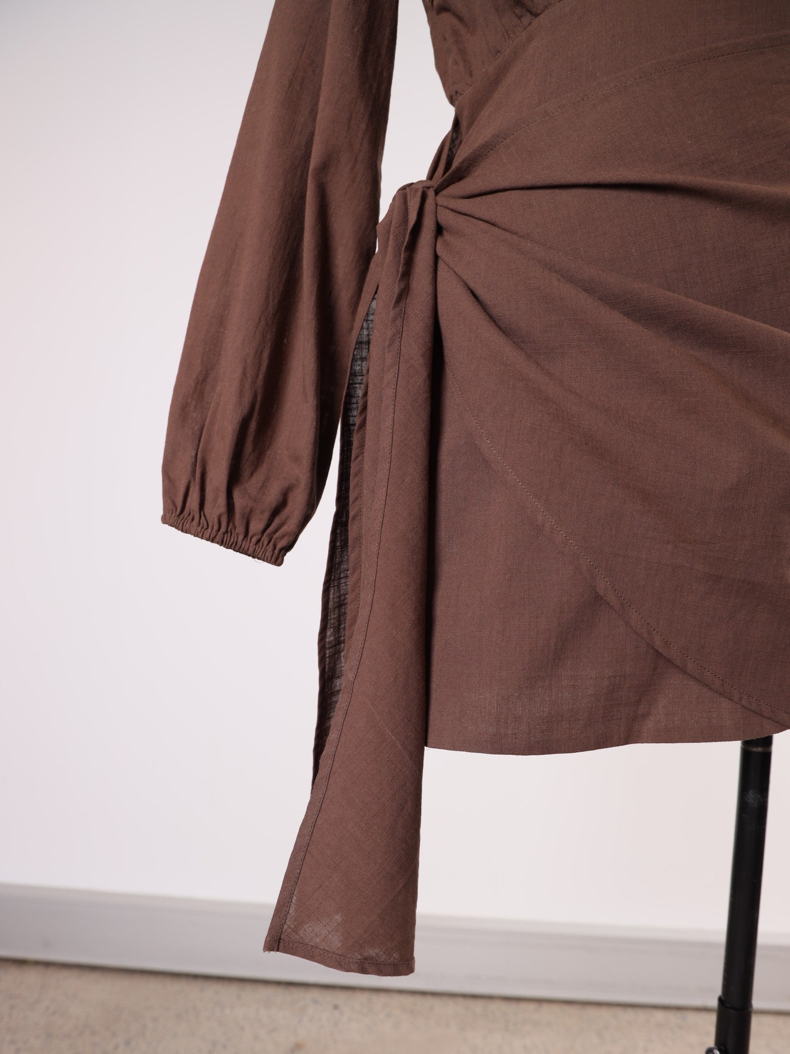The Hazel Dress features an off-the-shoulder design with wide sleeves and a charming side tie at mid-length, offering both style and exceptional comfort.